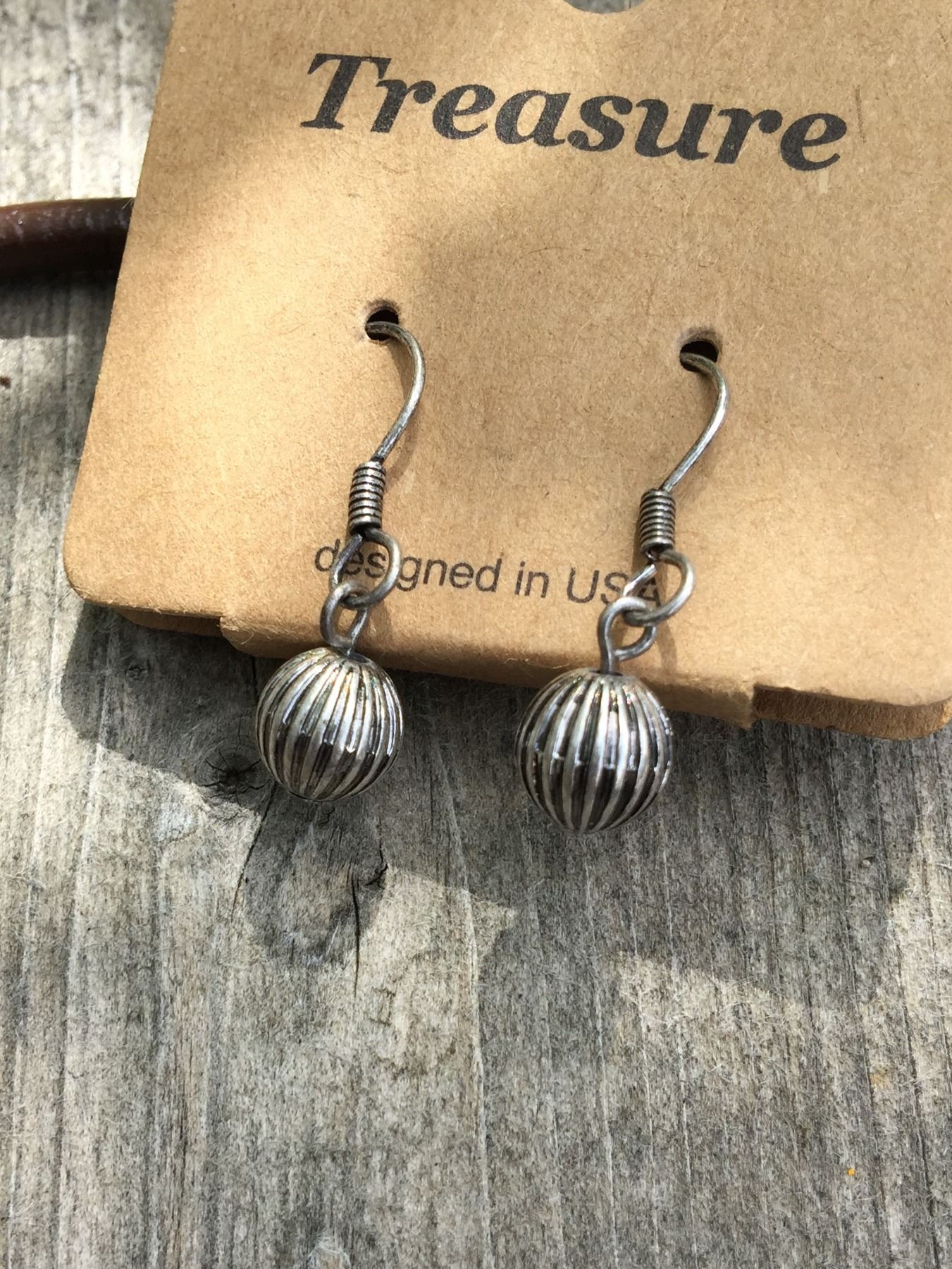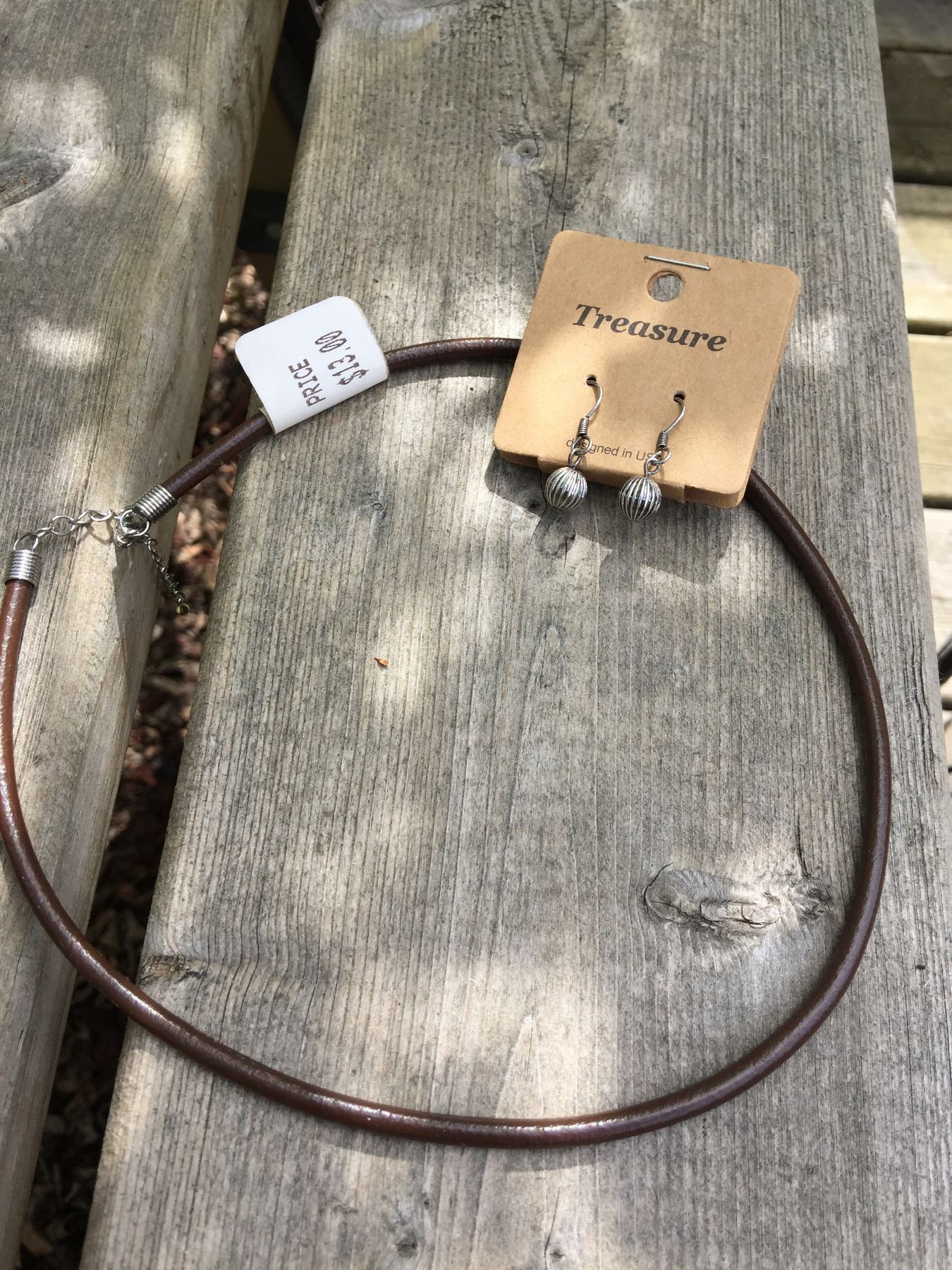 BROWN LEATHER ROPE NECKLACE/ANTIQUE BALL EARRINGS