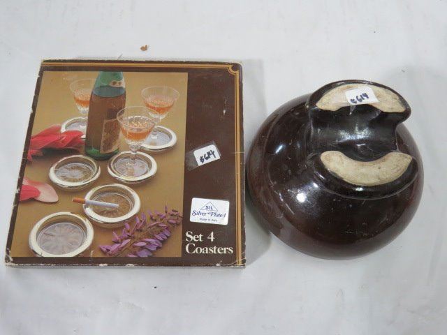 BROWN POTTERY TELEPHONE INSULATOR & COASTER SET (BOXED)