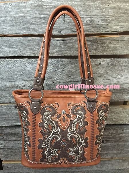 BROWN WESTERN SCROLLING DESIGN HANDBAG/Inside single compartment divided by a medium zippered pocket as well as an inside zippered pocket and 2 open pockets.A zippered pocket on the back.An open pocket on the back.