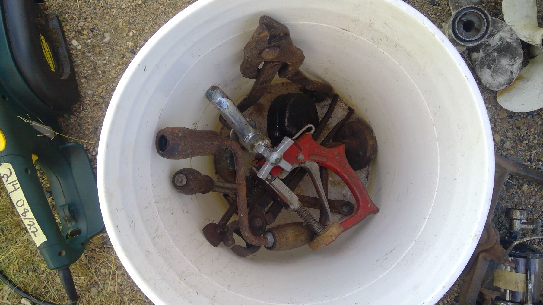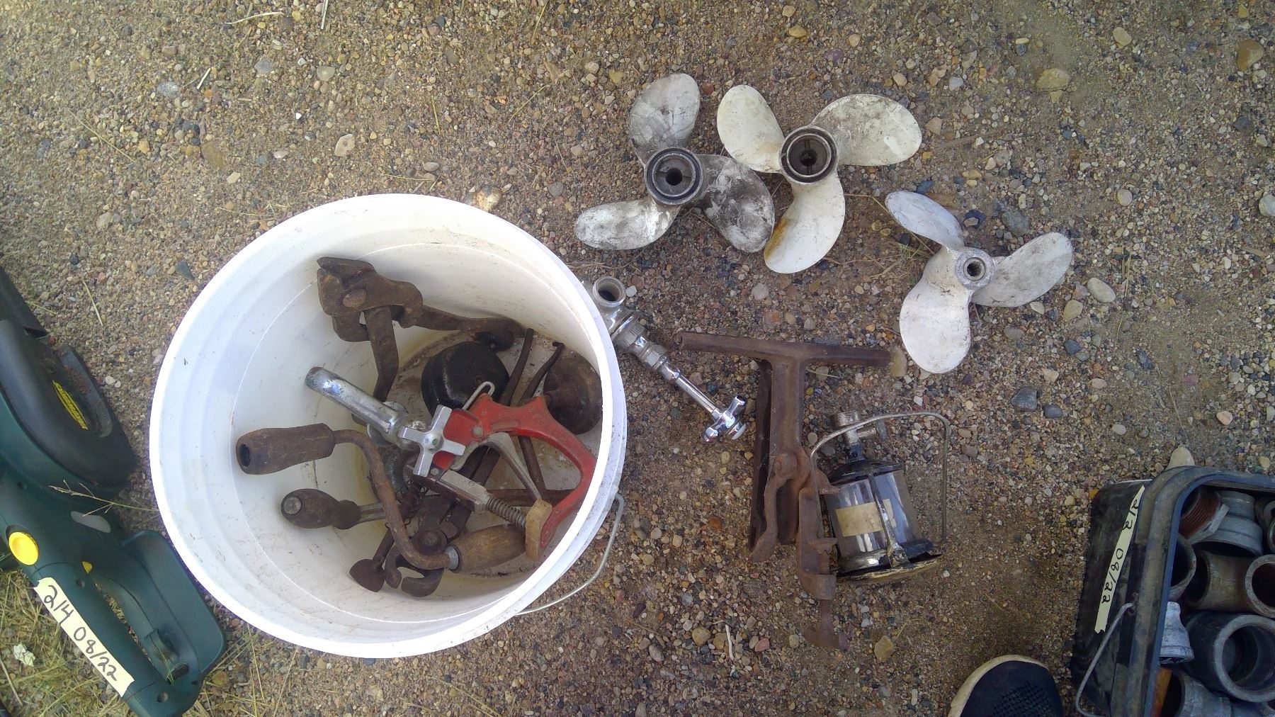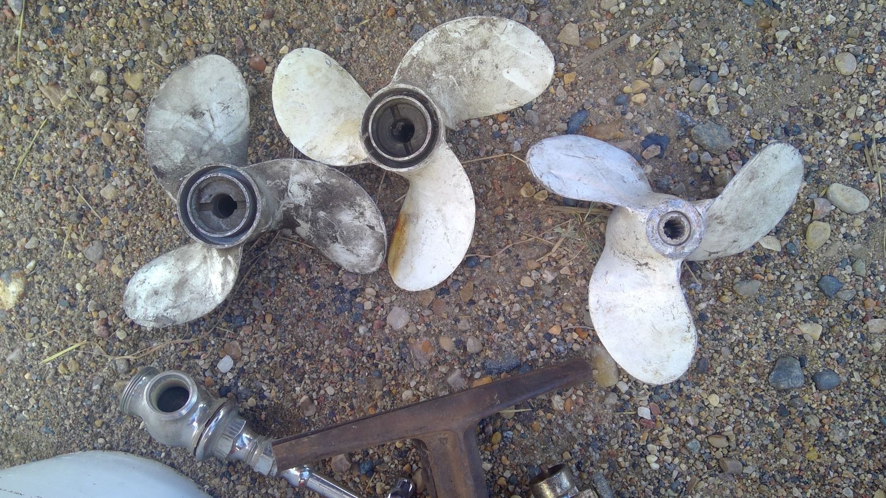 BUCKET OF BOAT PROPELLERS AND FAUCETS