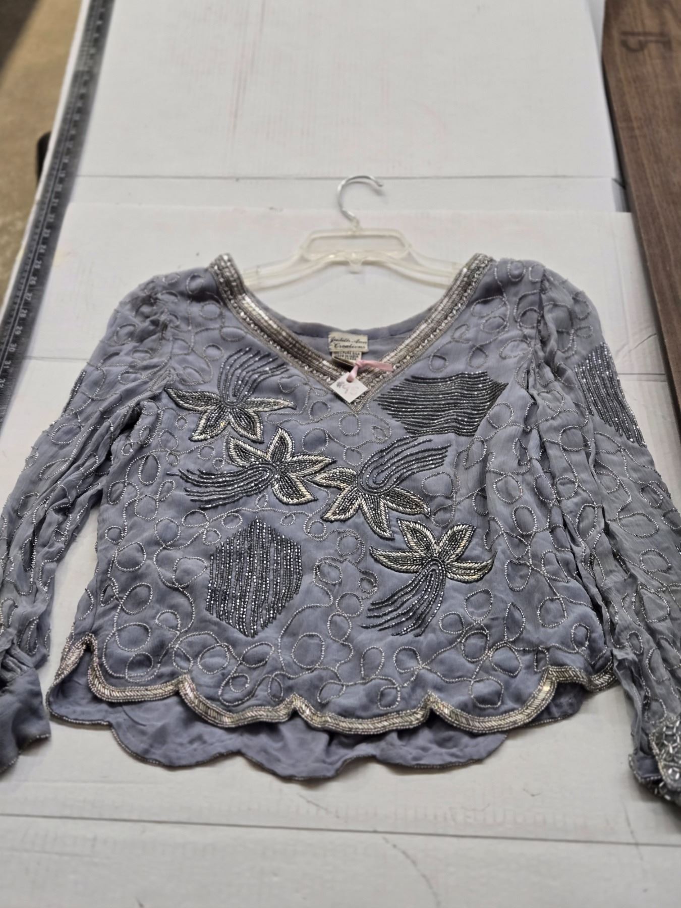 Baby blue silk top with silver beading, by Judith Ann Creations, size Med.