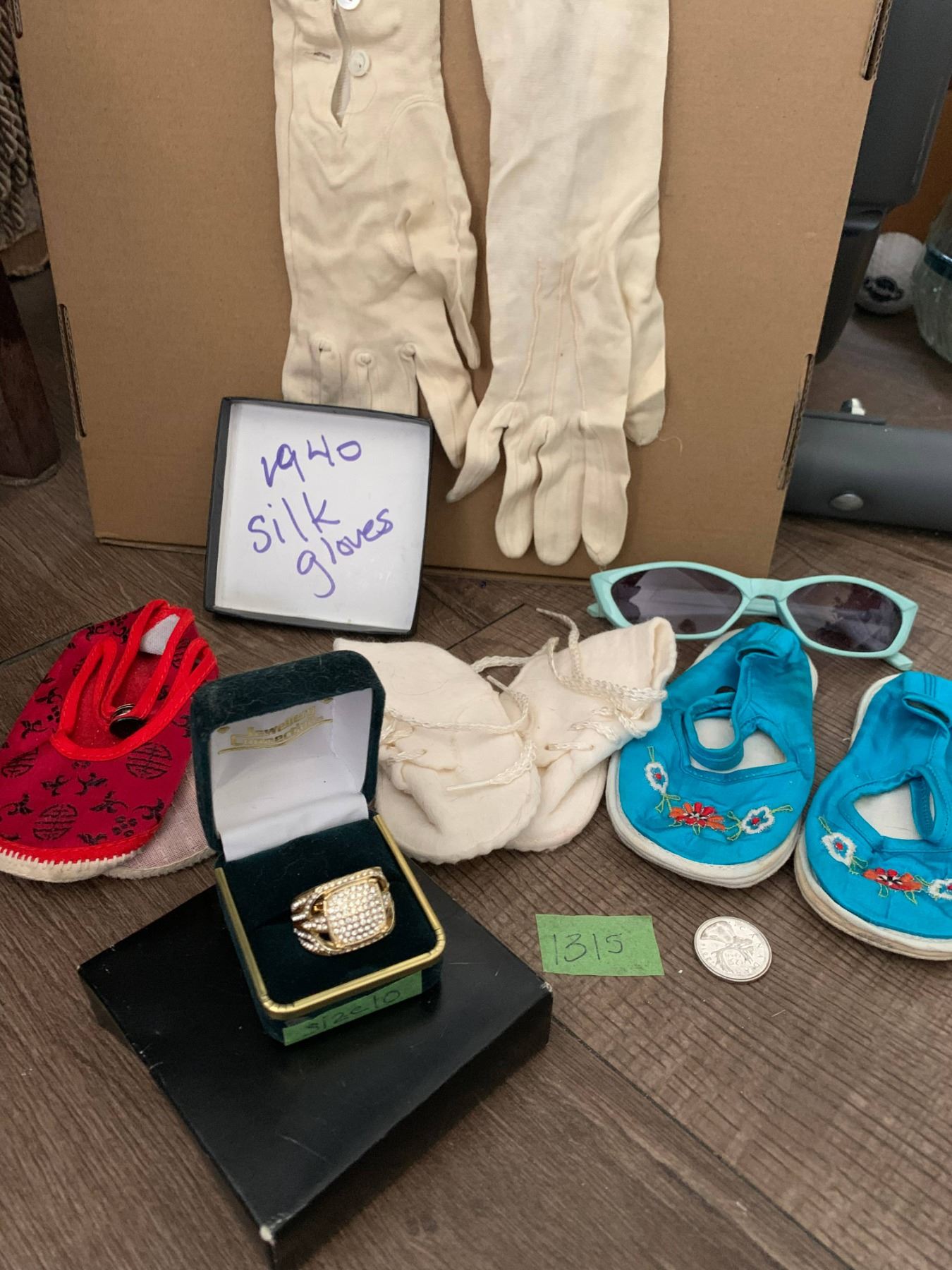 Baby shoes , 1940!silk opera gloves, size 10 rhinestone ring,