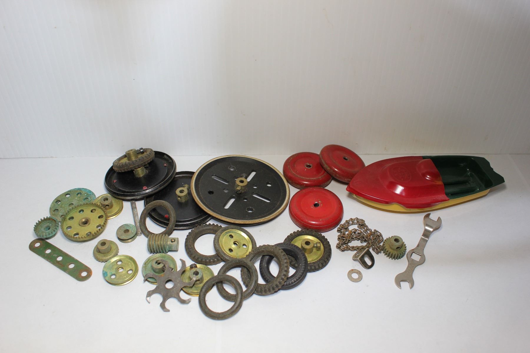 Bag miscellaneous wheels, wrench and tin toy boat (stamped A1 555)