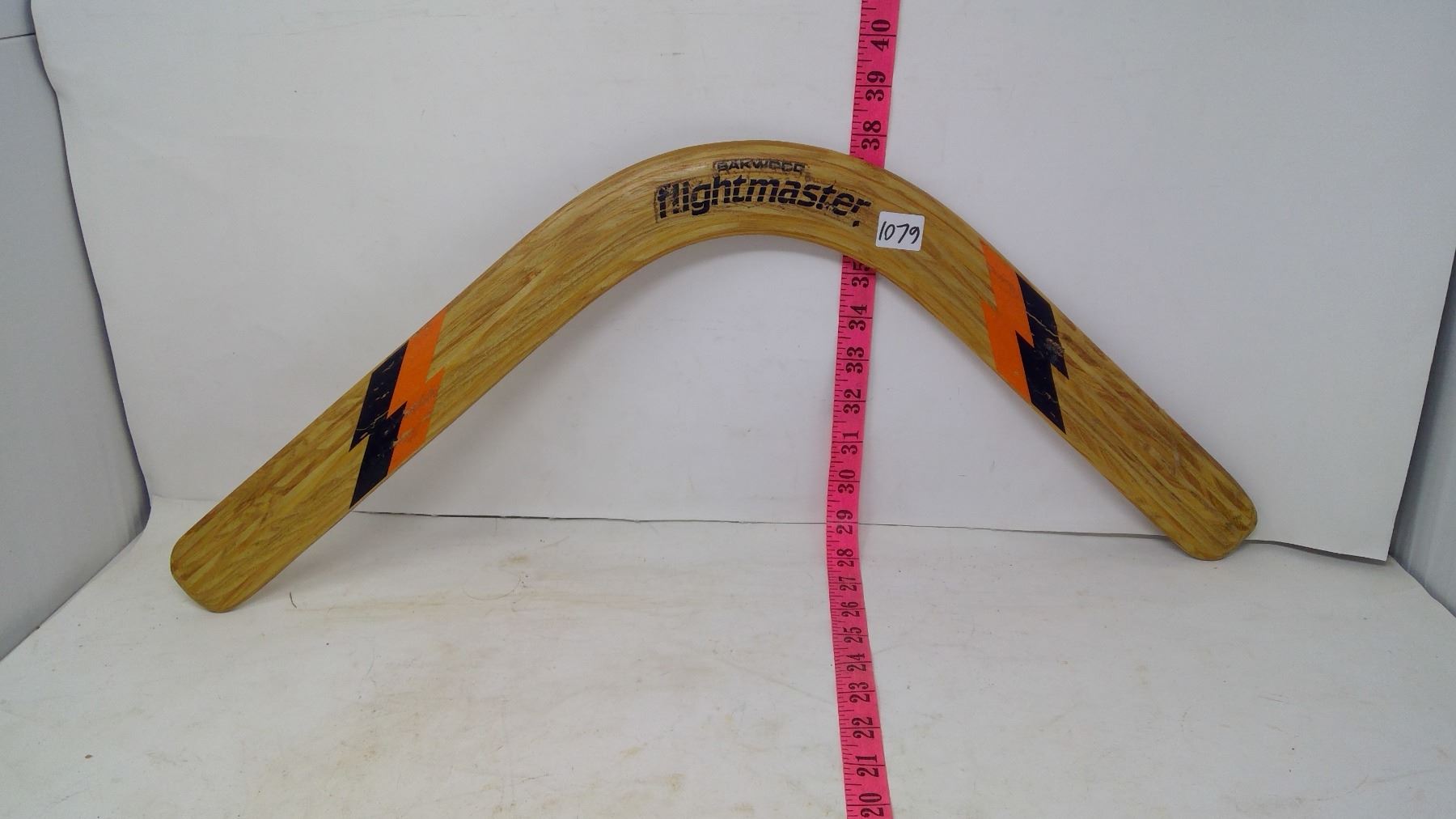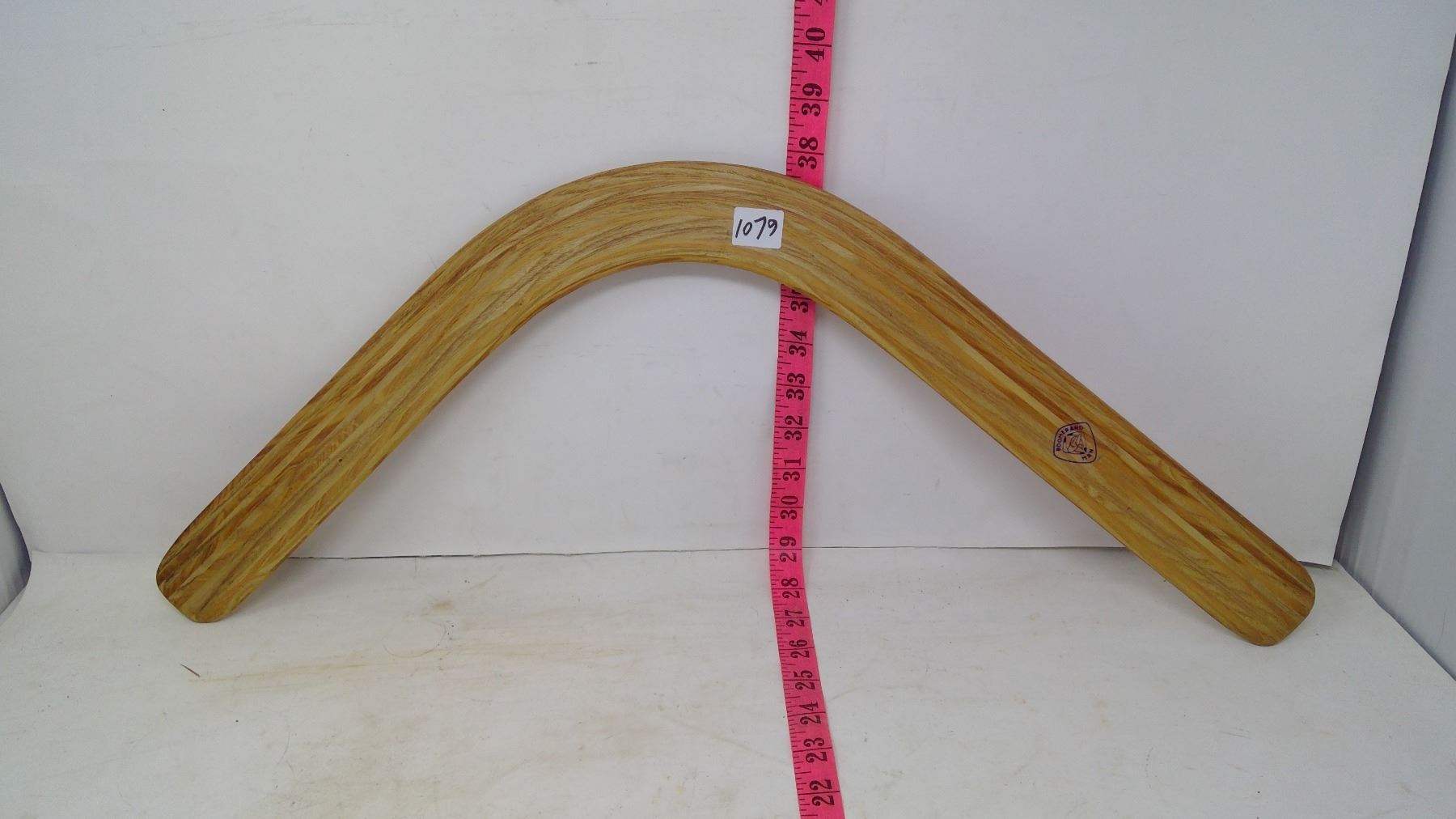 Google 'Bakwood/Davro boomerangs' and you will find they were made in Scotland of laminated ash. Strips are glued and viced to make a block blank which is carved into a boomerang. Width: 24 1/2". Thickness: 3/8". Range: 35m. Returns: yes. Stately, rangy, loping flight. Type: standard. Easy to catch. For a right-handed person.