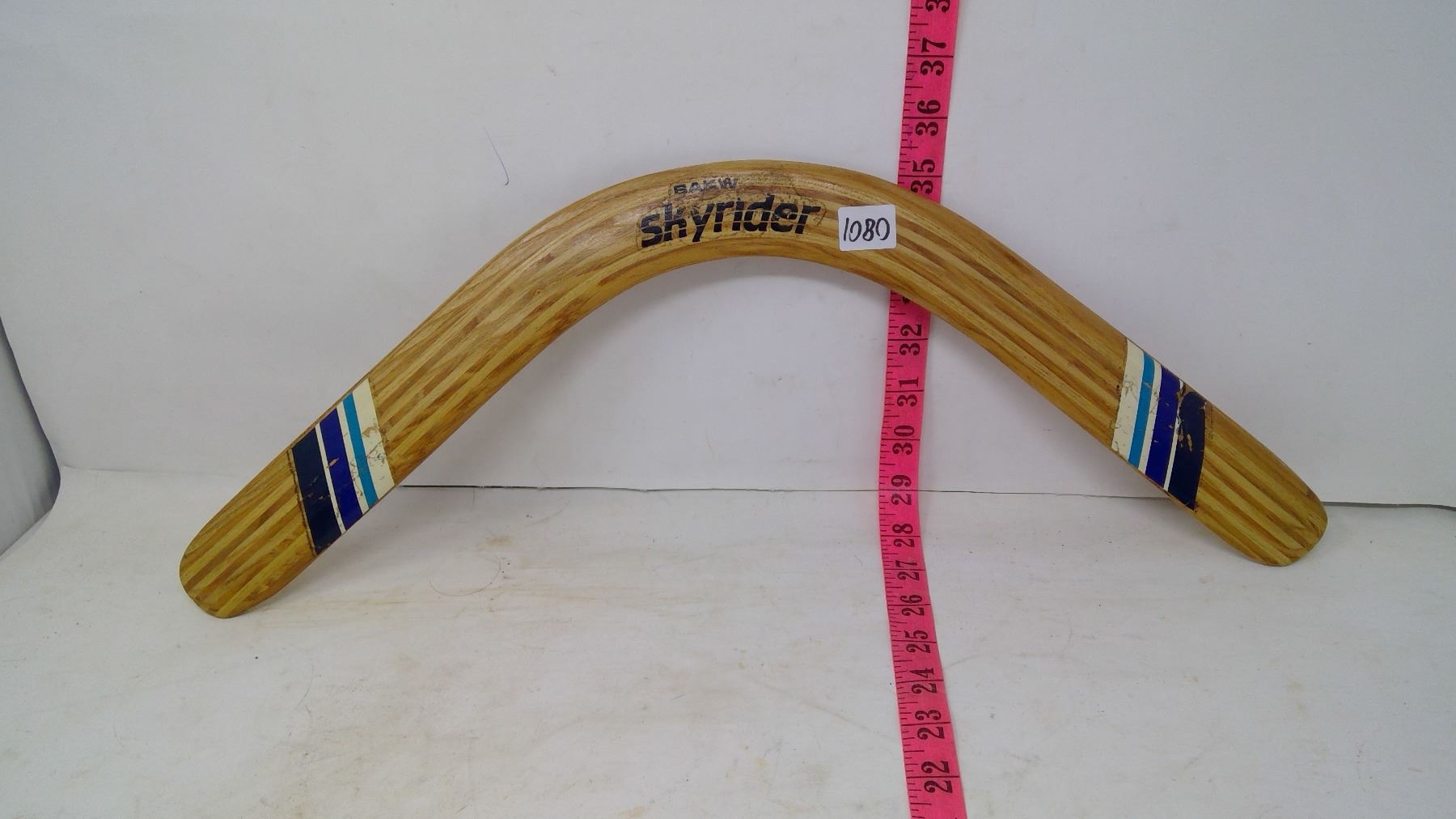 Bakwood/Davro 'Skyrider' boomerang made in Scotland of ash wood strips laminated together. Range: 30m. Thickness: 3/8". Both 1079 and 1080 are rare as the maker is retired. For a right-handed person.