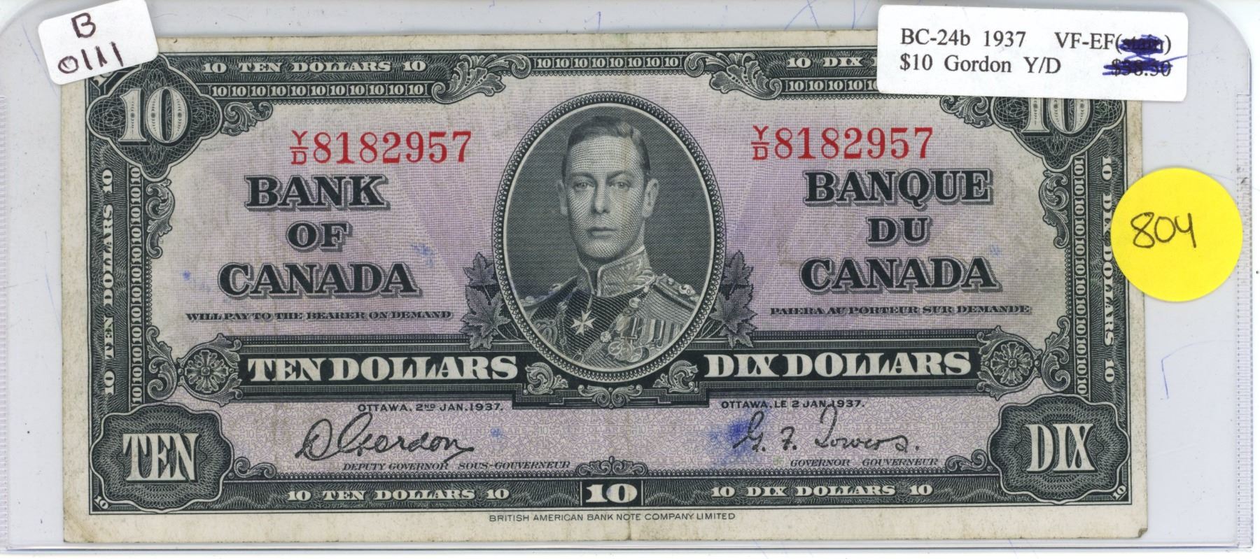 Bank of Canada 10 Dollar BC-24b 1937 Gordon Y/D