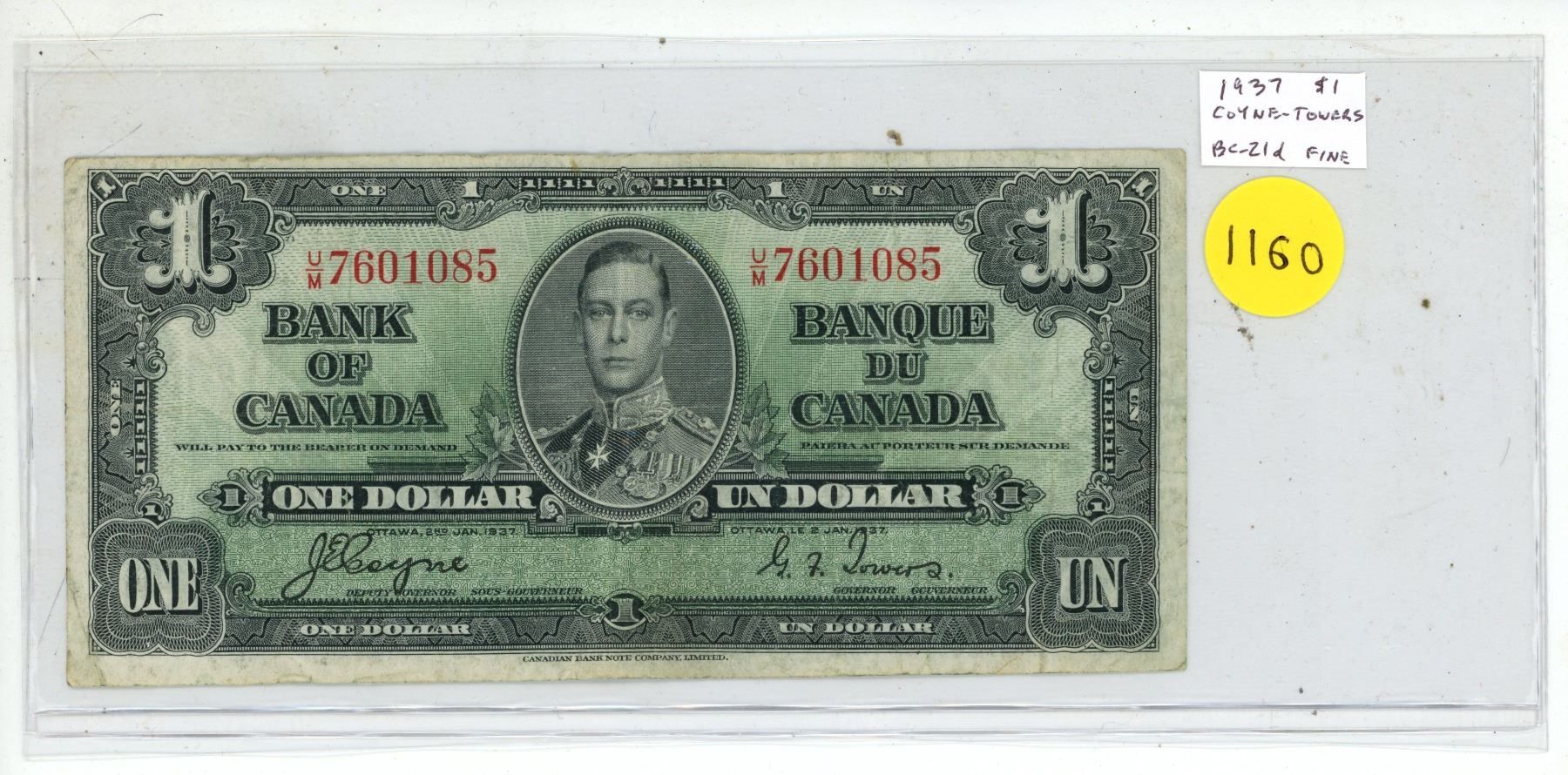 Bank of Canada 1937 $1. Coyne-Towers signatures. U/M Prefix. BC-21d. Fine12.