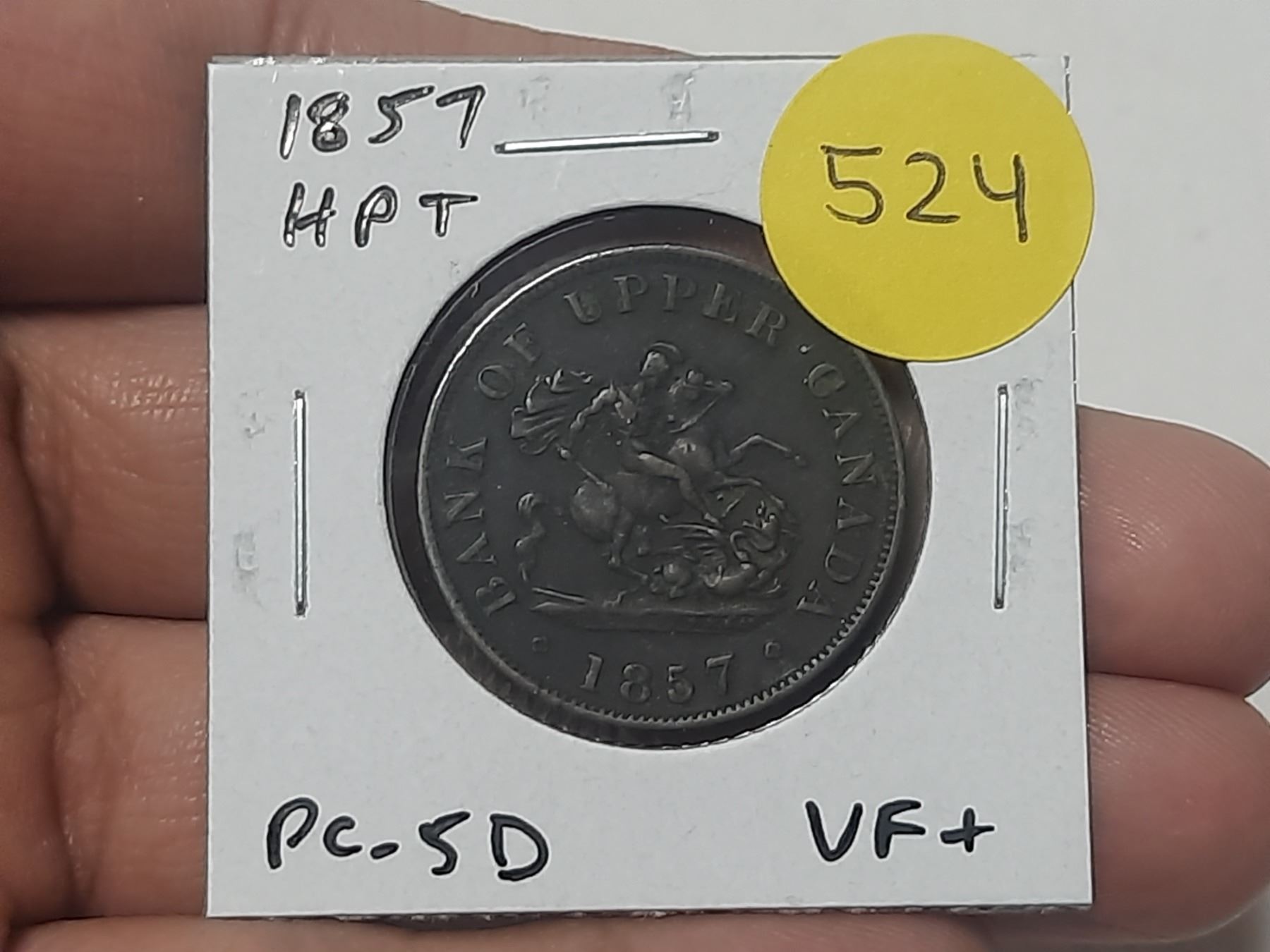 Bank of Upper Canada 1857 Half Penny Pre-Confederation Token. Saint George slaying Dragon. PC-5D. VF30.