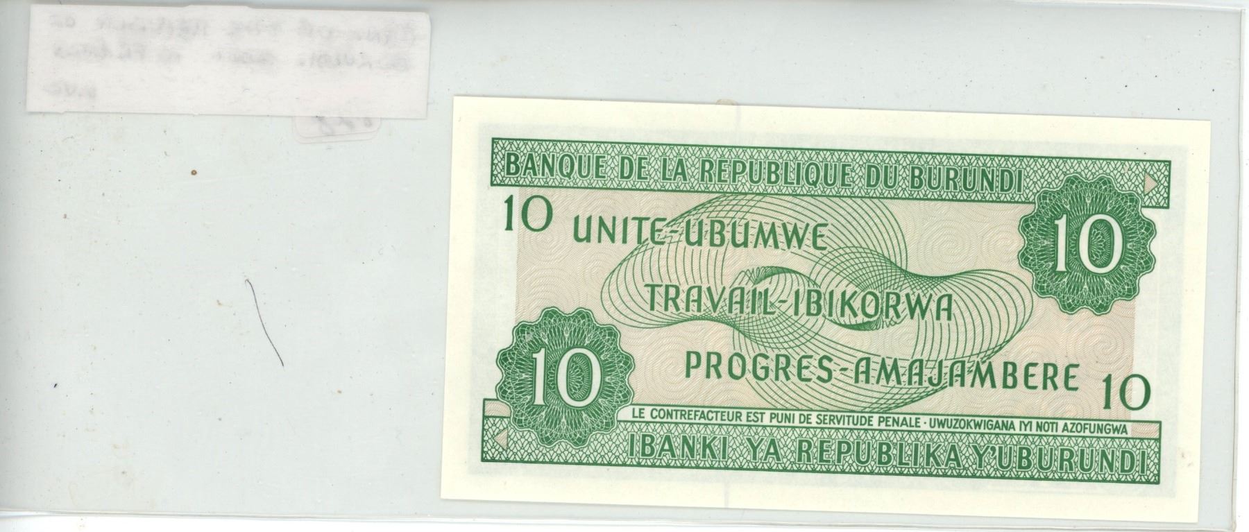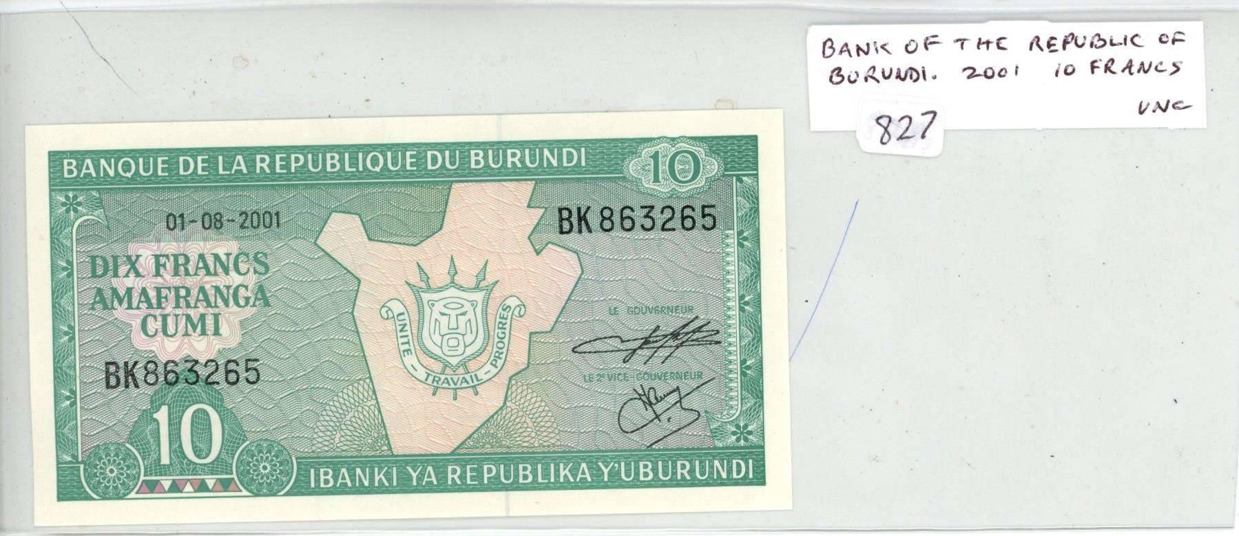 Bank of the Republic of Burundi. 2001 10 Frances. Unc.