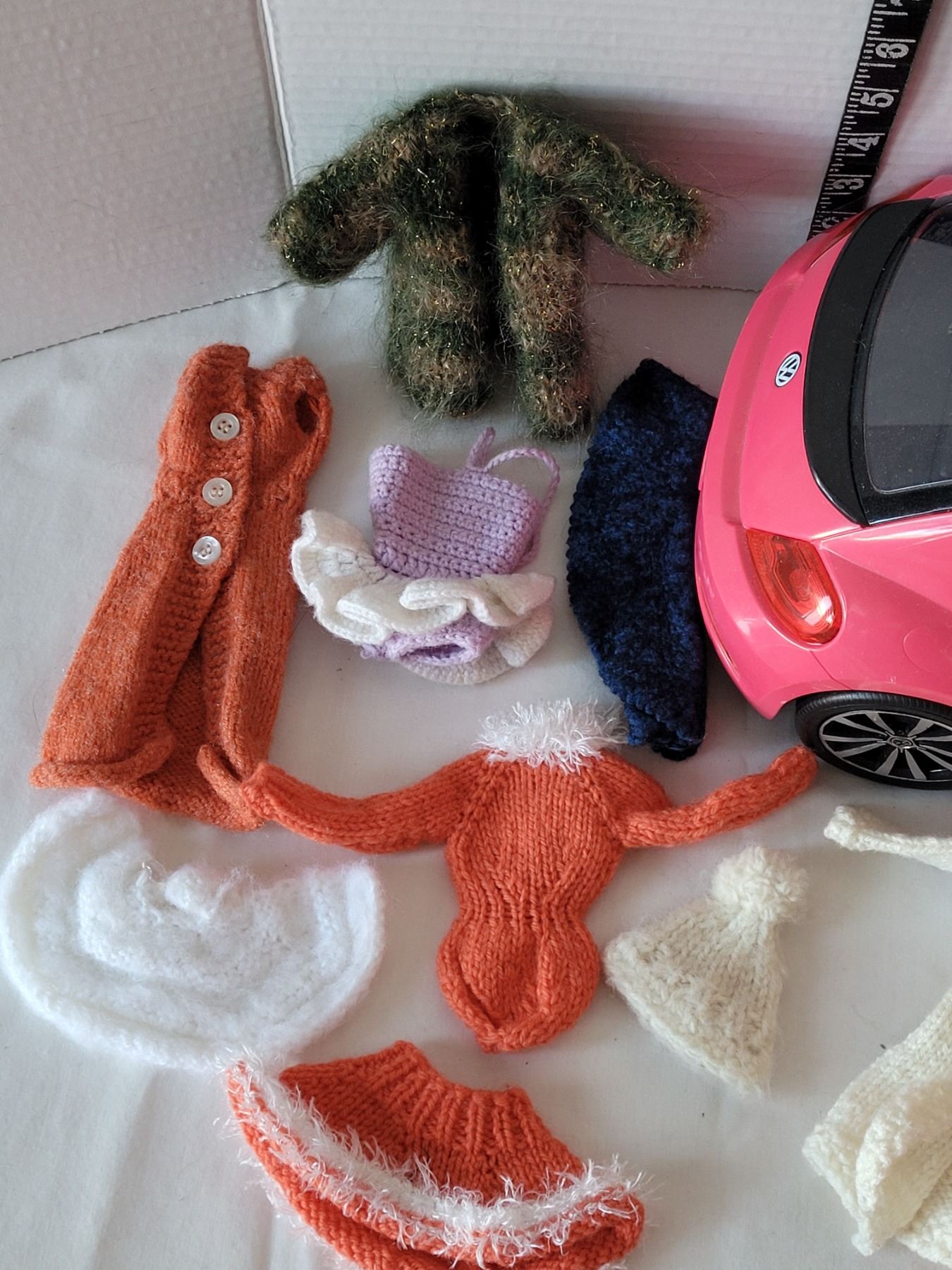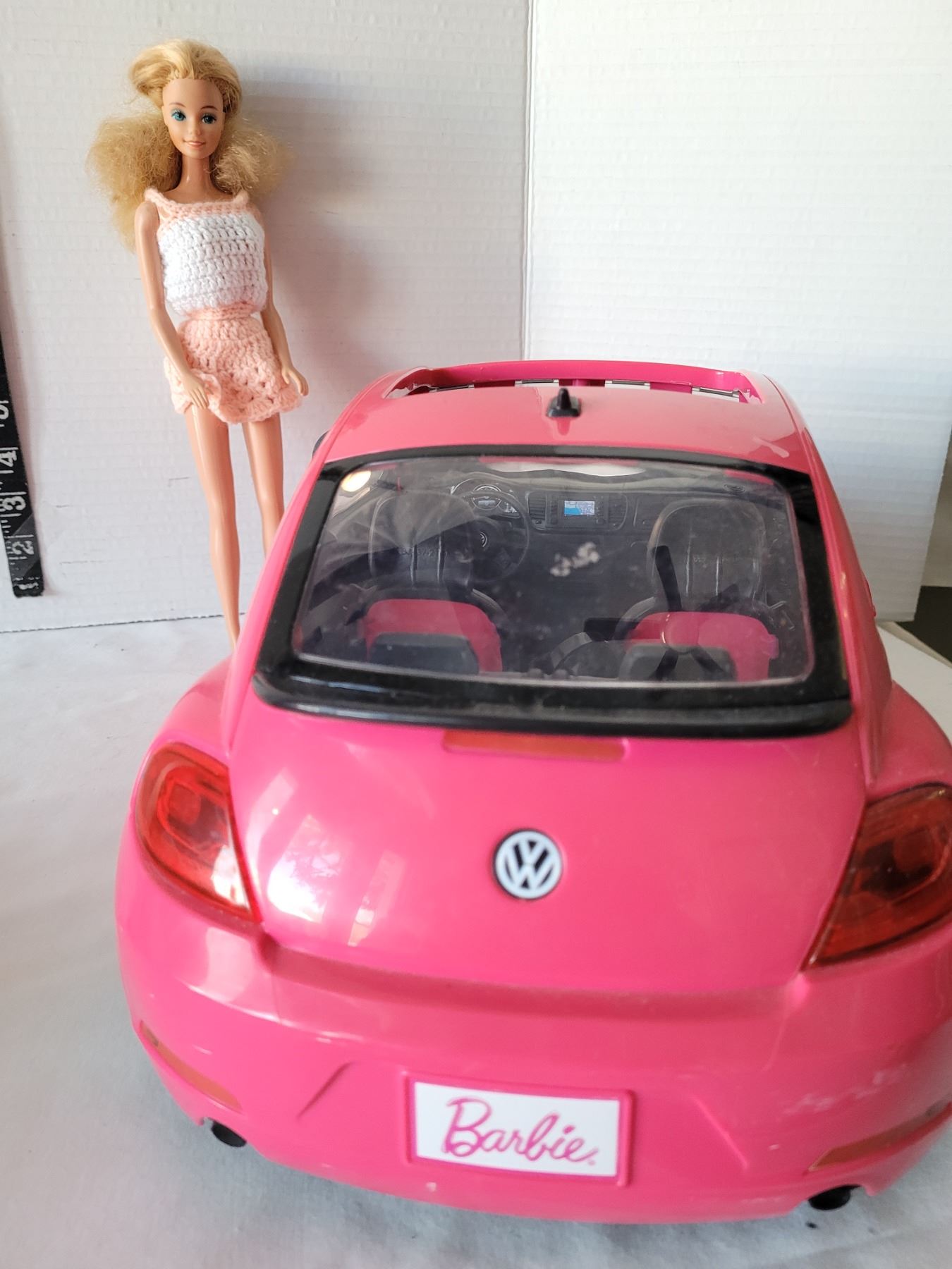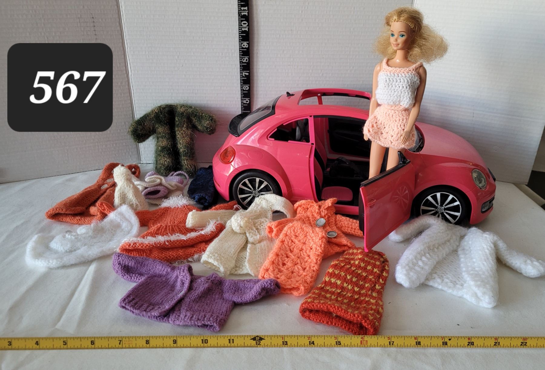 Barbie VW bug car, Doll & homemade knit & crochet clothes.