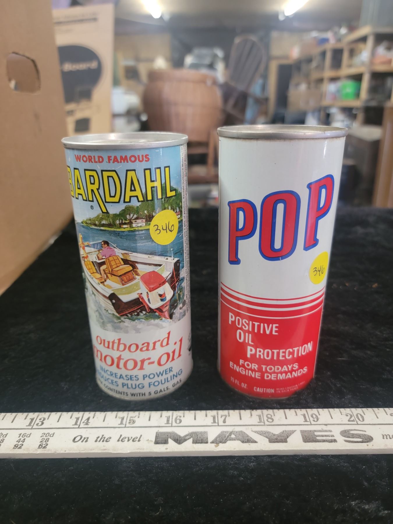 Bardahl outboard motor oil tin (full) + POP oil tin (empty)