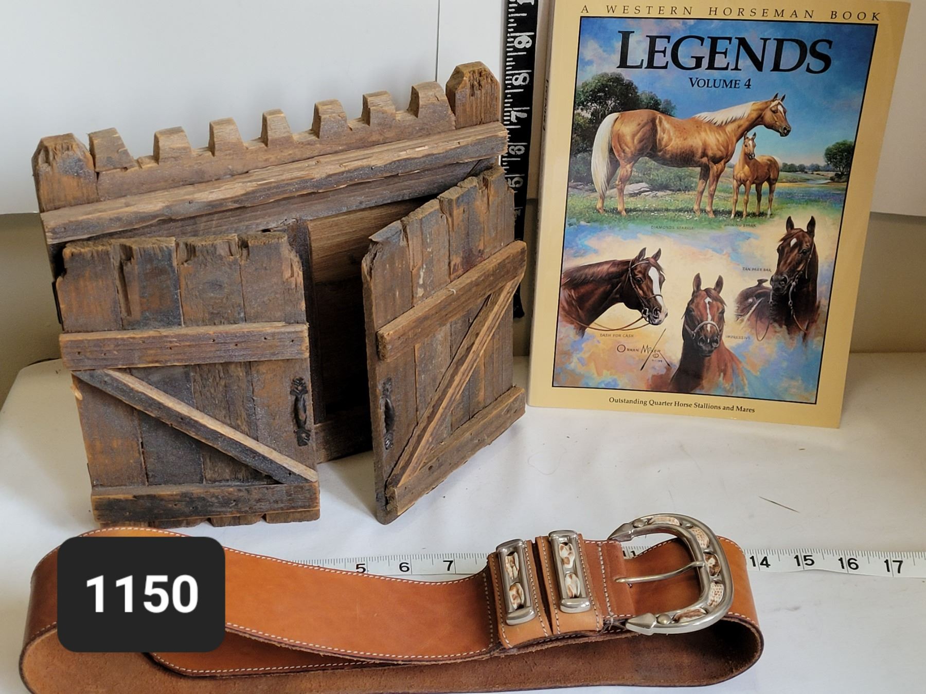 Barn board double photo frame, western leather belt from Italy & legend horse book.