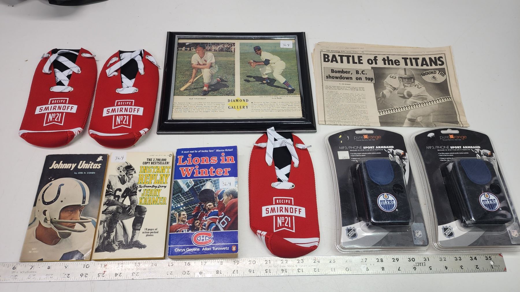 Baseball, Football, Hockey Memorabilia – Johnny Unita's, Jerry Kramer, Ernie Banks, Red Schoendienst + 3 Beer Cozies and 2 “Oilers” Phone Sport Armbands – NIB