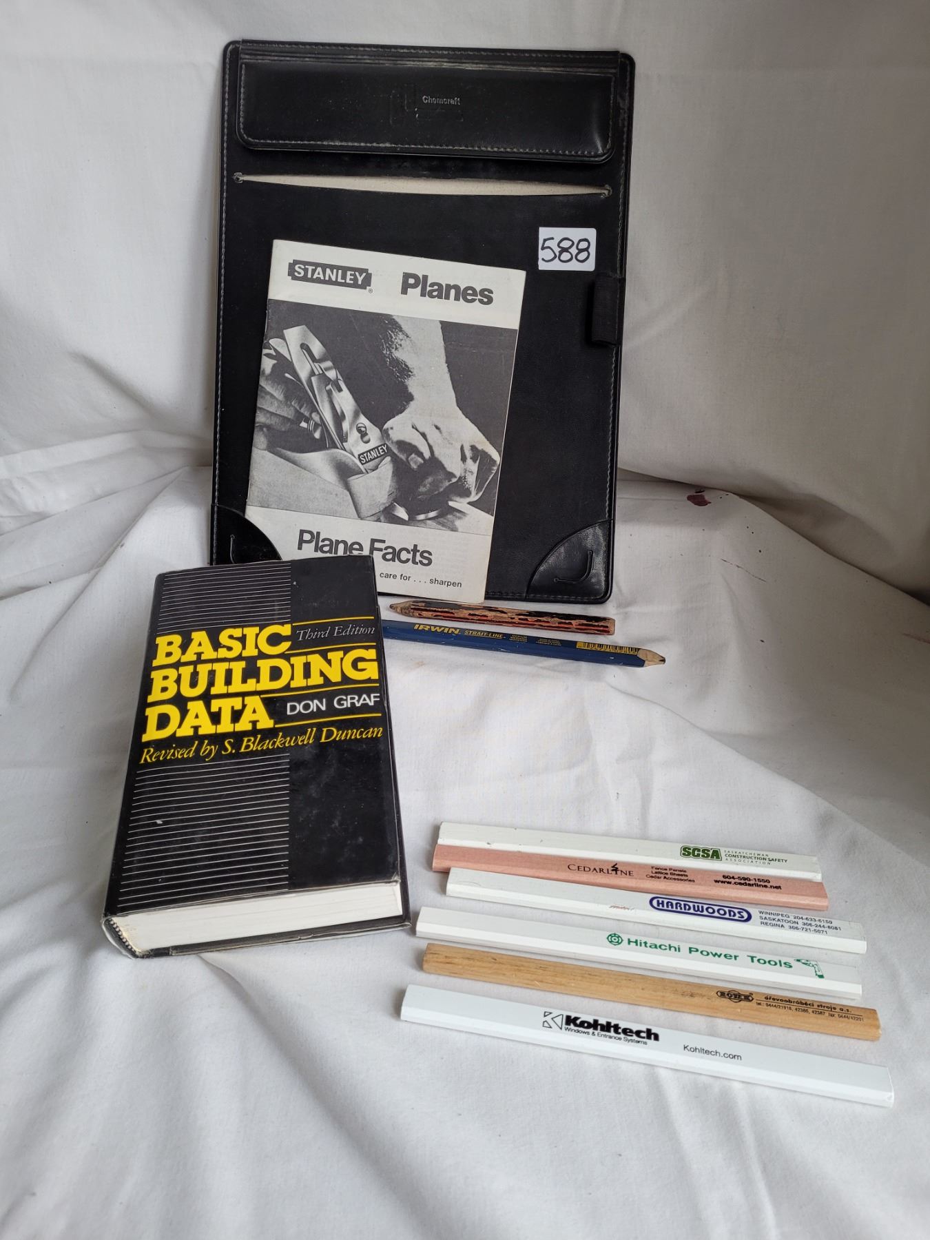Basic building data, residential standards books plus assorted carpenter advertising pencils.