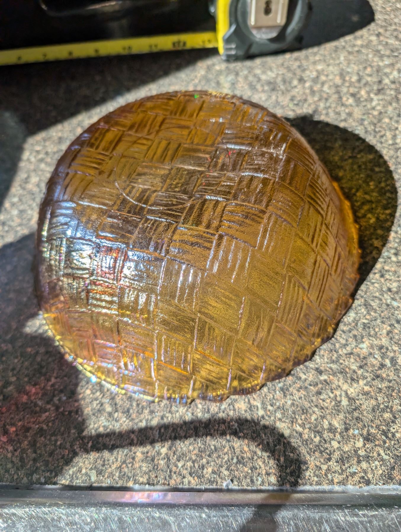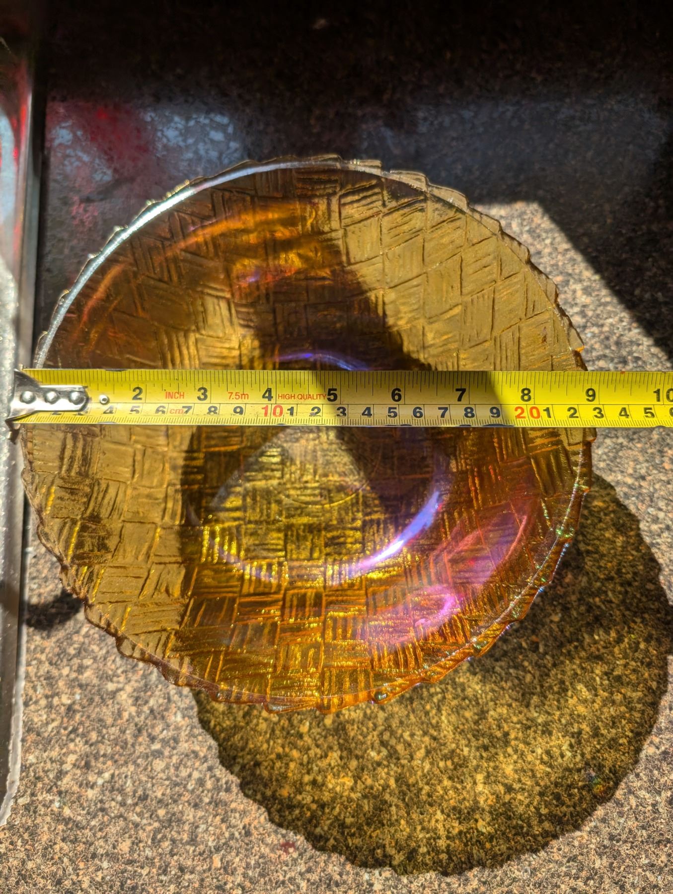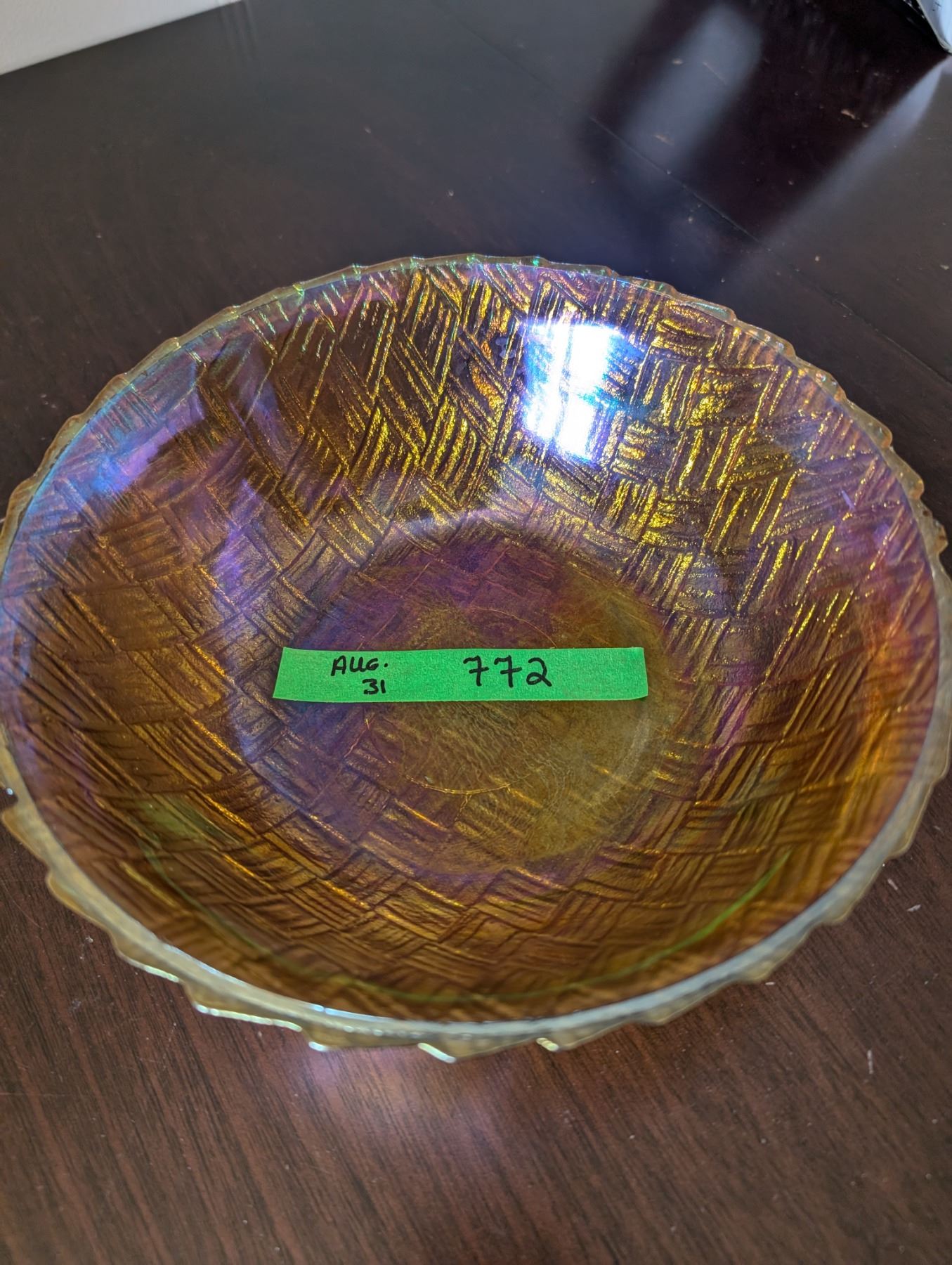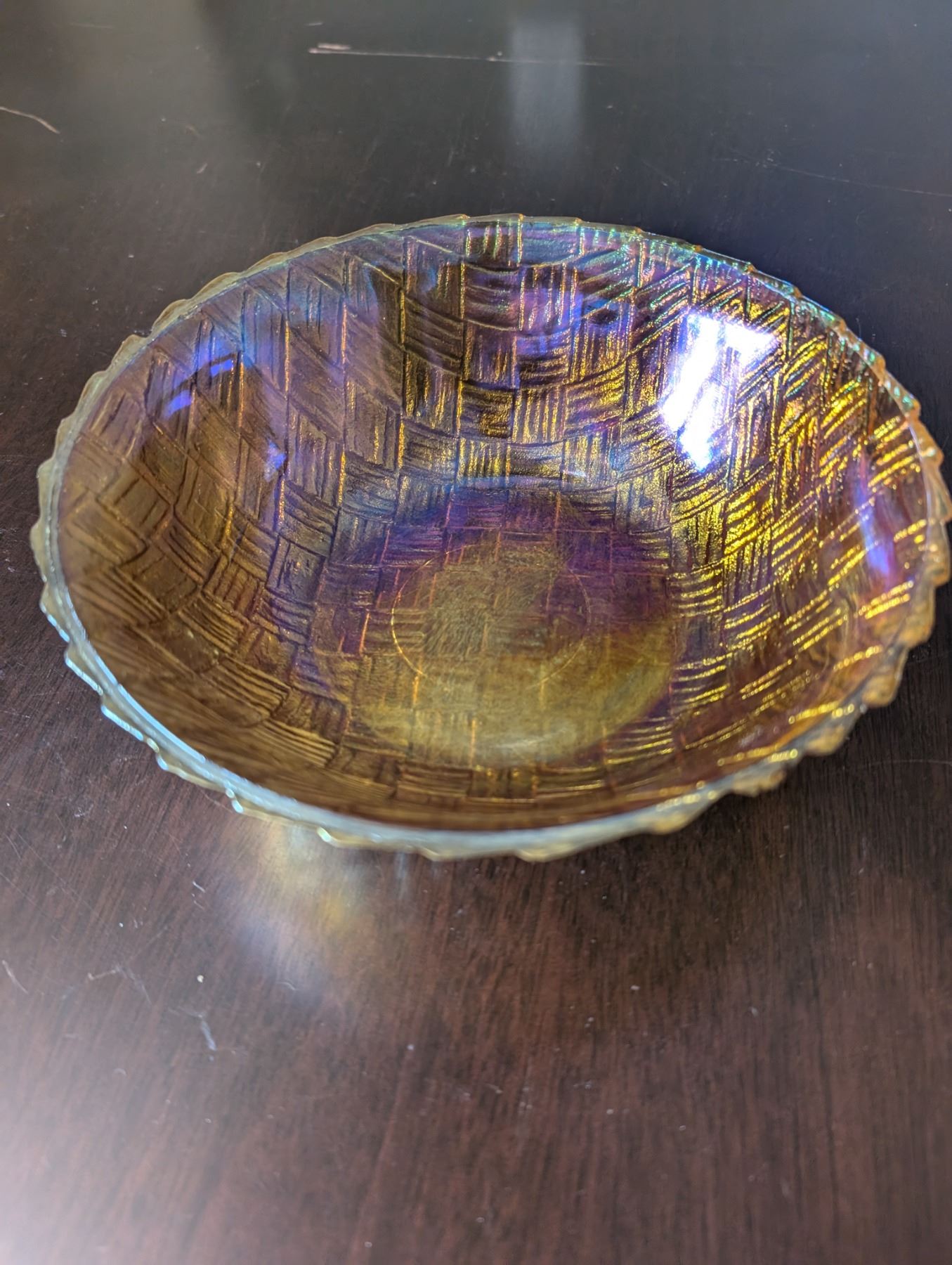 Basket Weave Marigold Carnival Glass Bowl 9" Diameter x 3" High