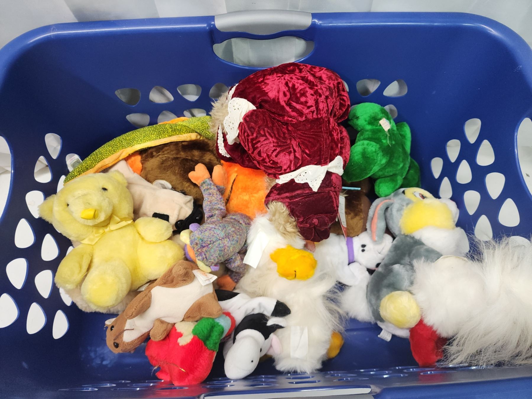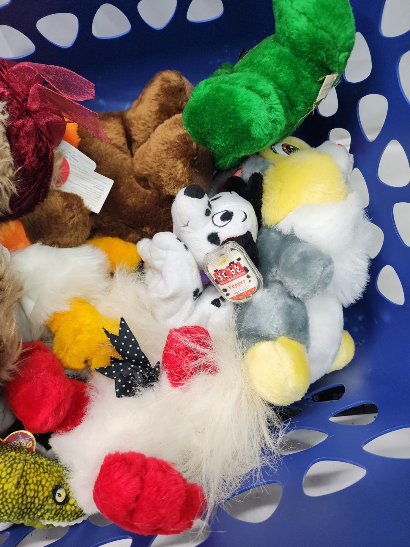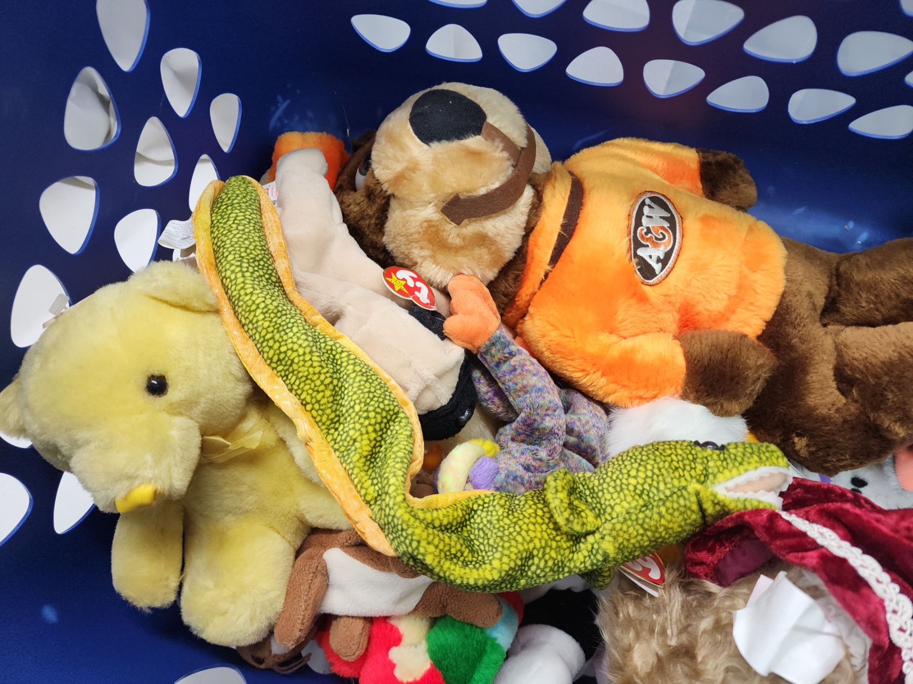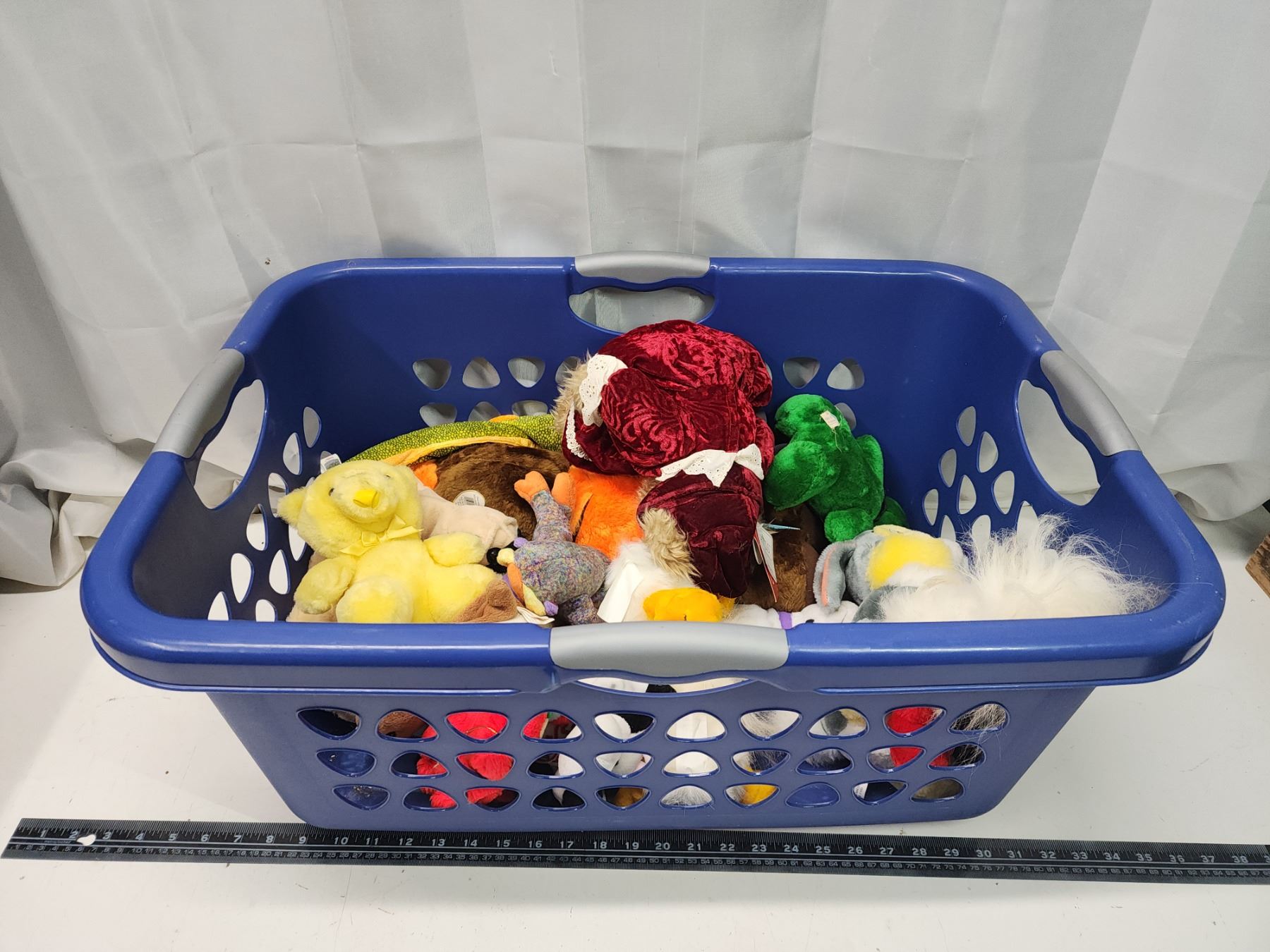 Basket of vintage stuffed animals - A&W bear, TY beanie babies, etc.