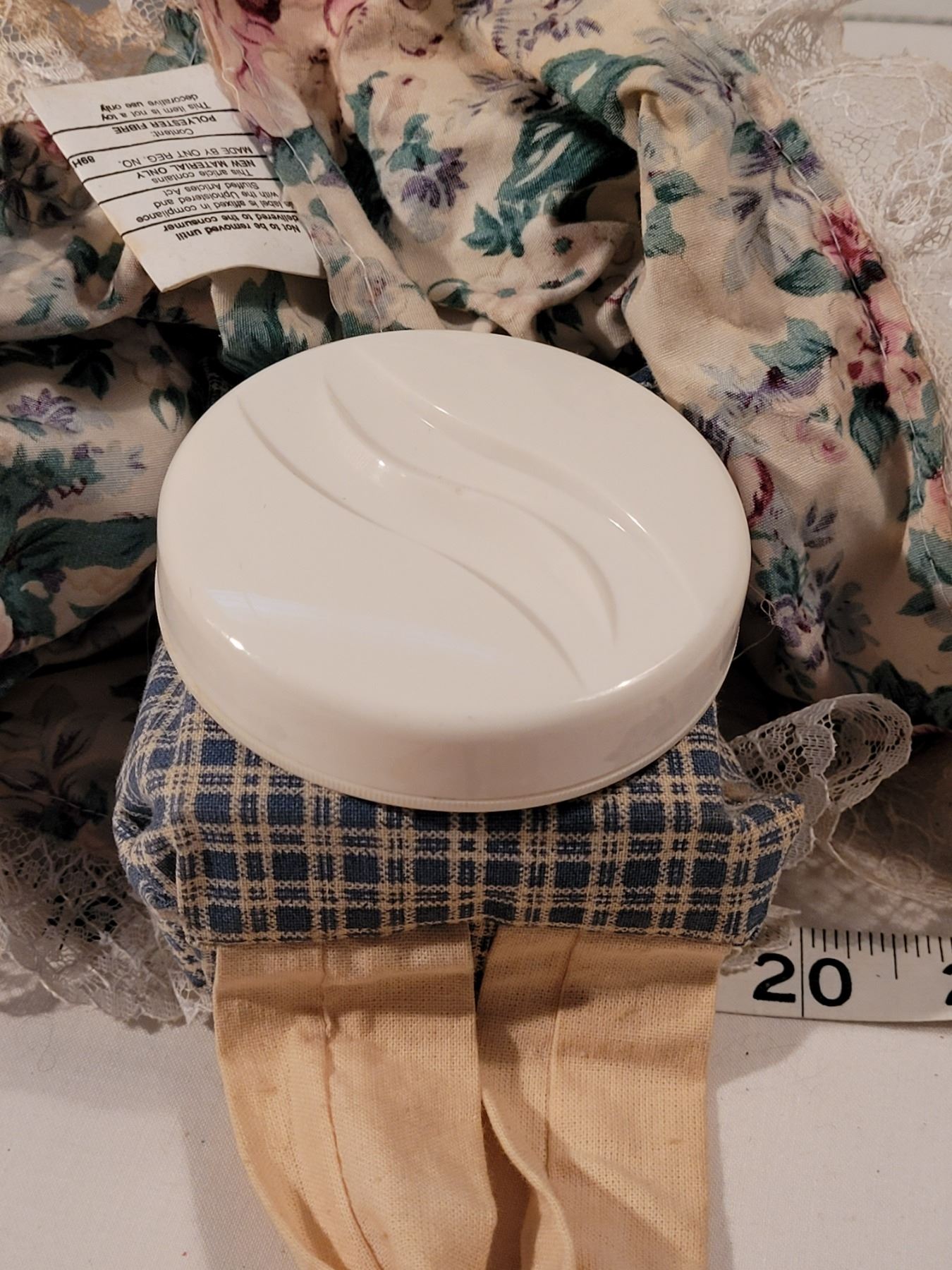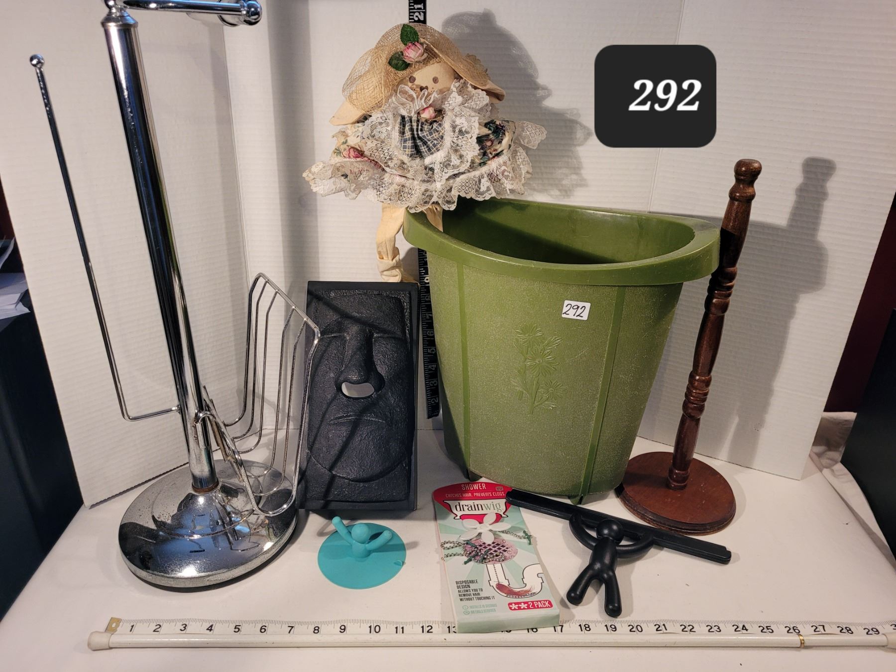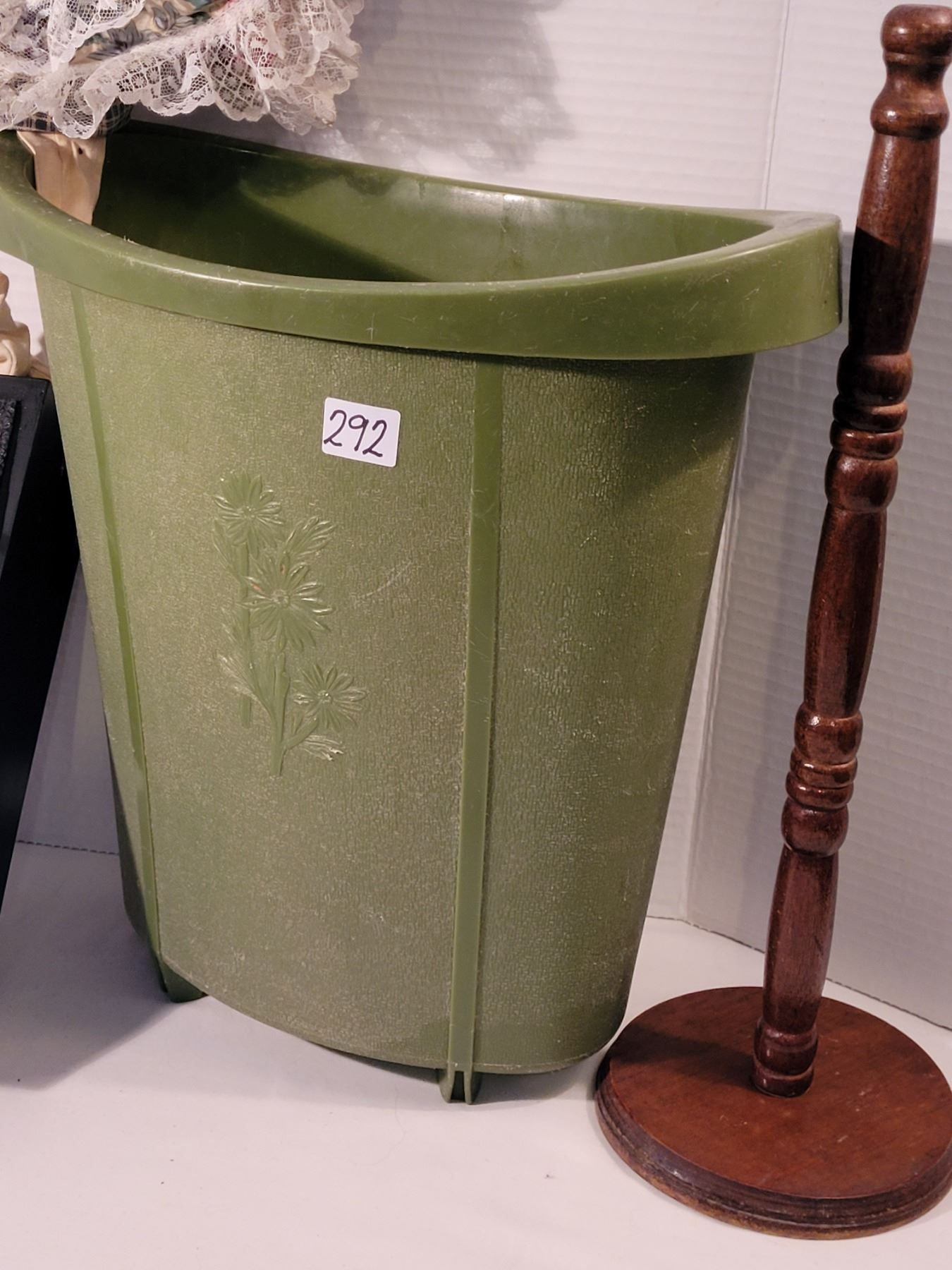 Bathroom supplies. Garbage can, tissue roll holder, kleenex face cover etc.
