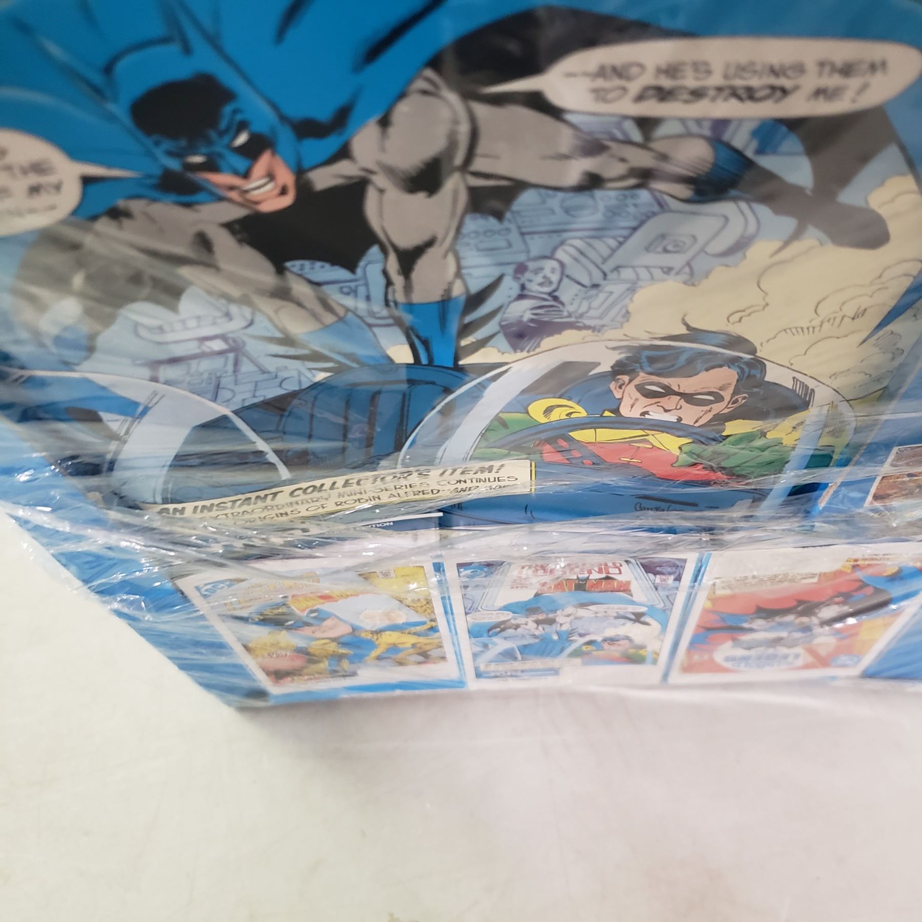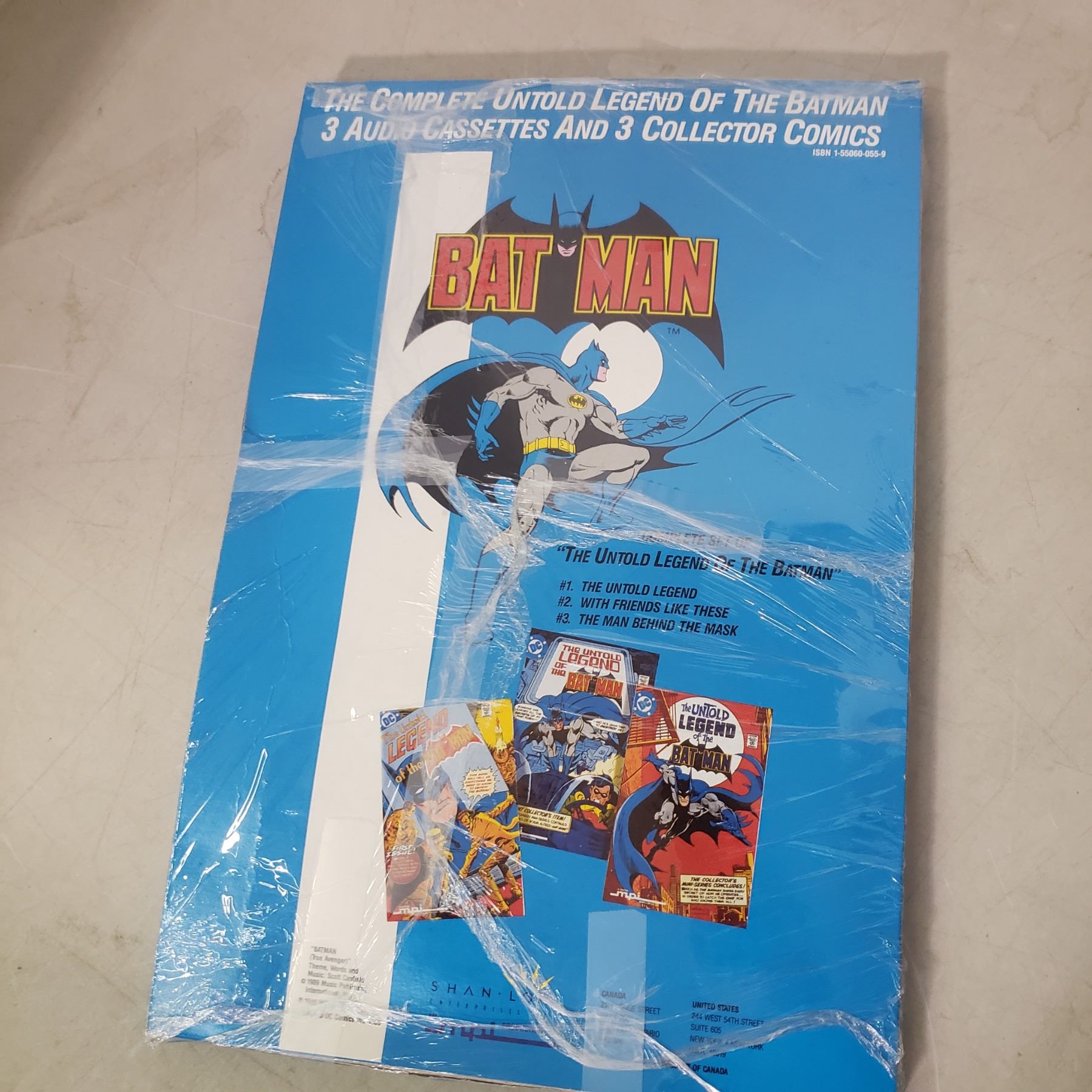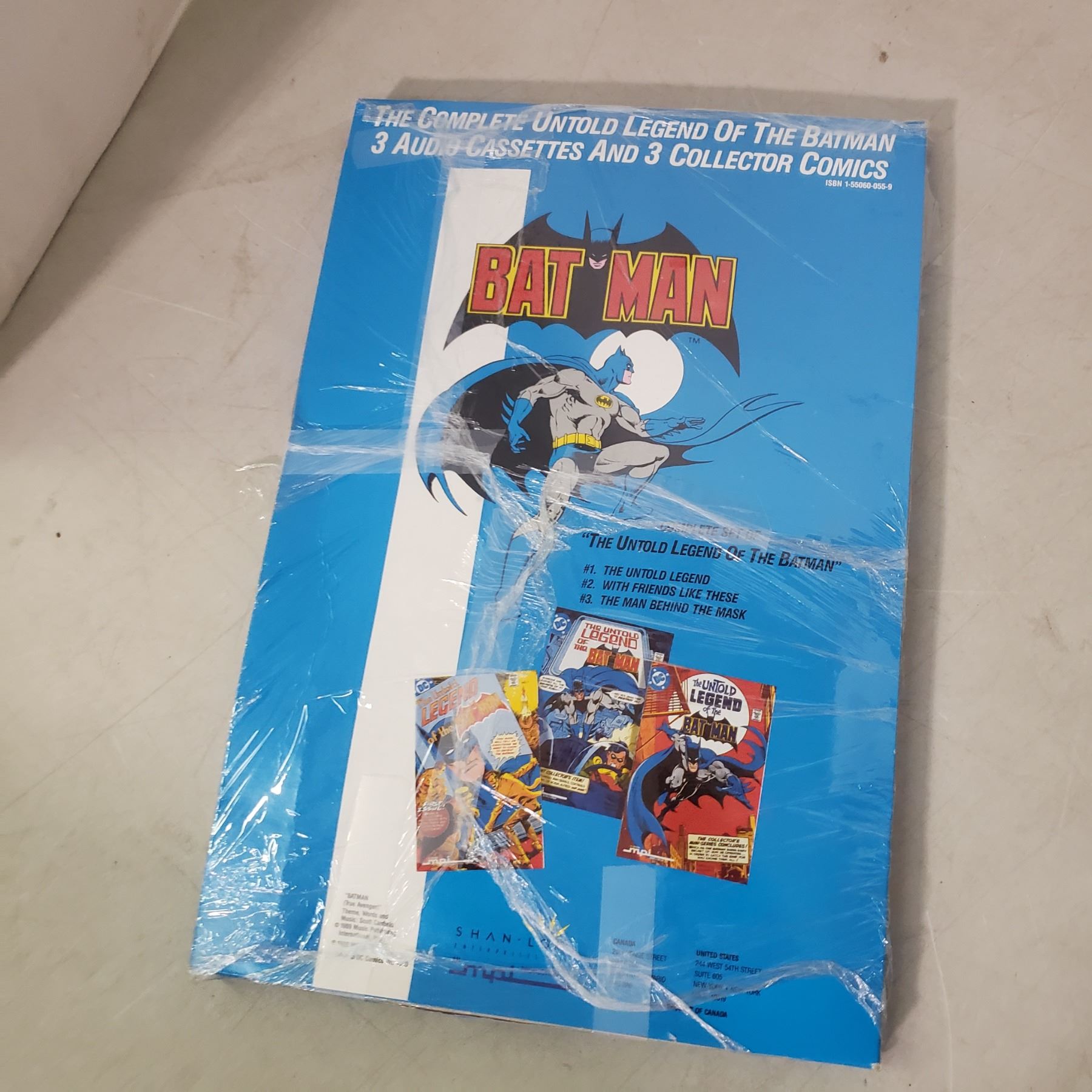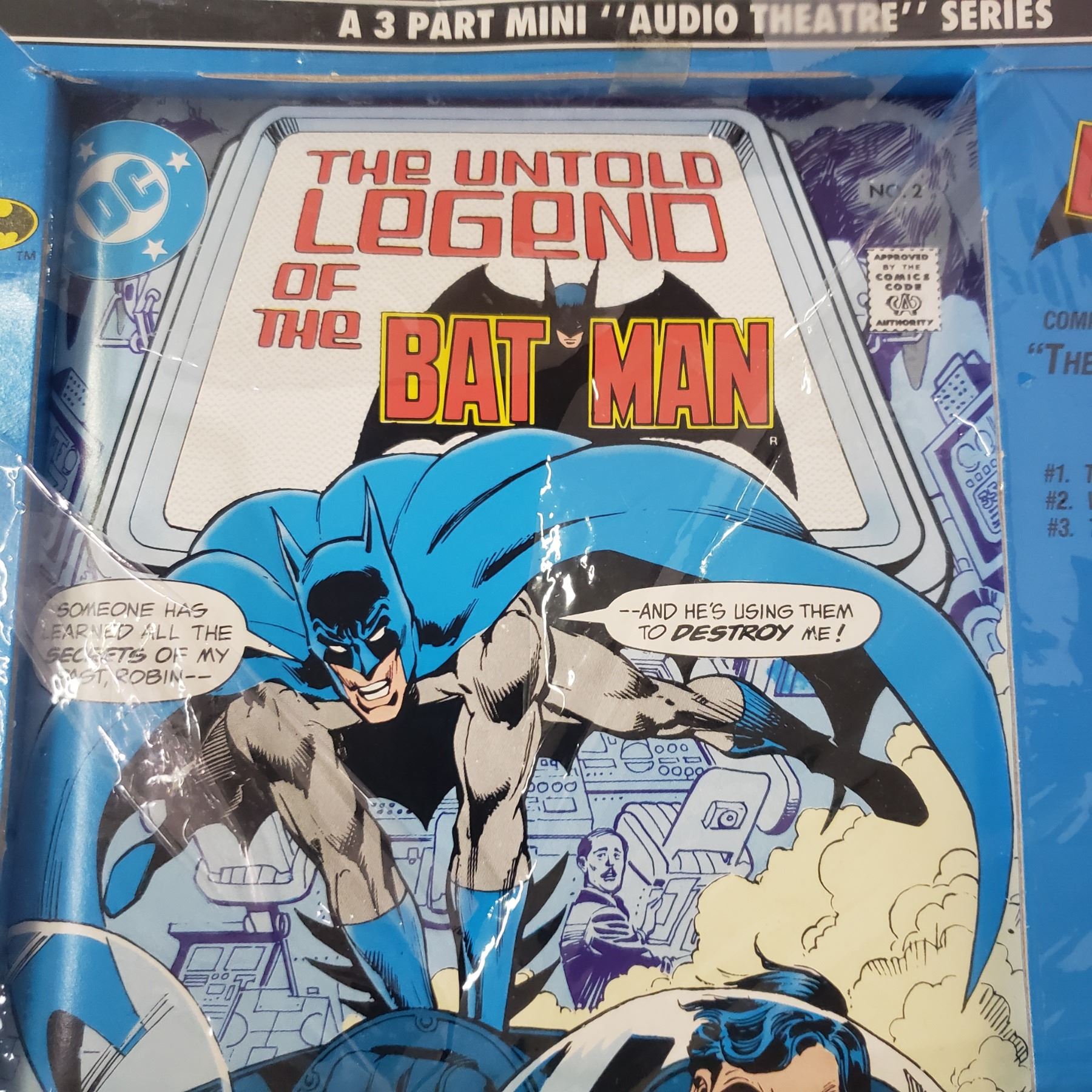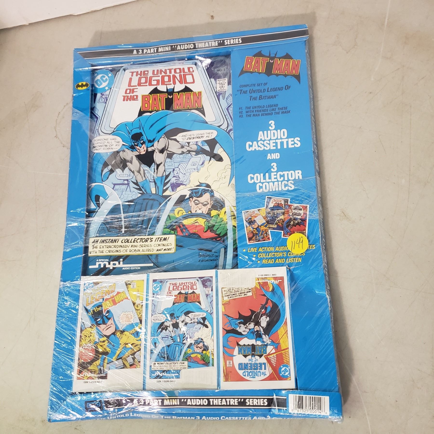 Batman collectibles, 3 collector comics and 3 cassette tapes in oroiginal package (package has damage)