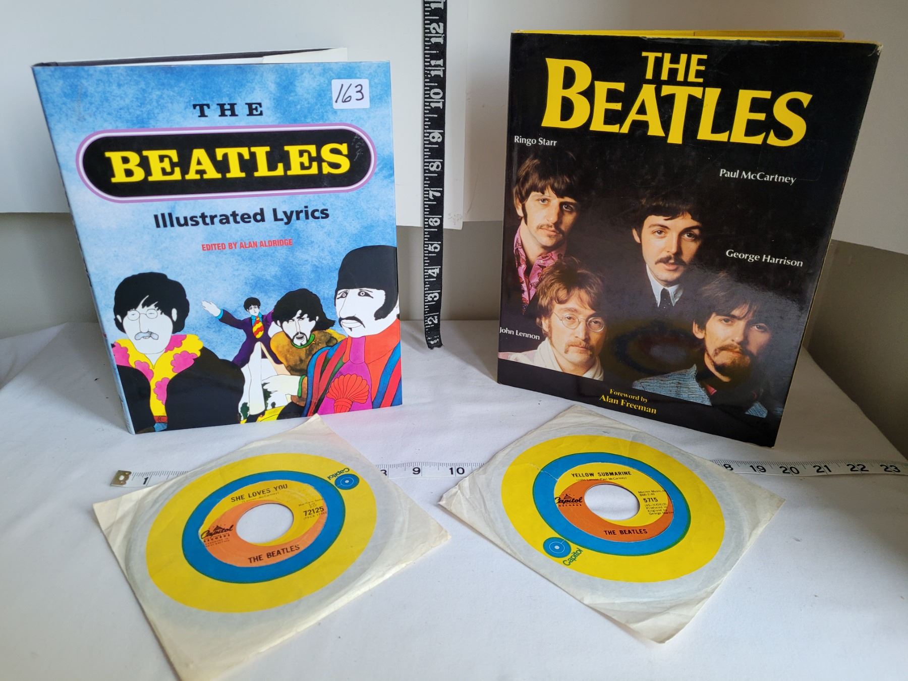 Beatles Lyrics & history books plus 2 vintage 45rpm singles. Yellow Submarine, Eleanor Rigby, She Loves You & I'll Get You.