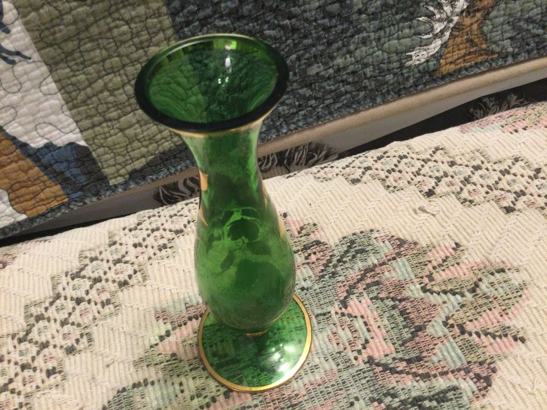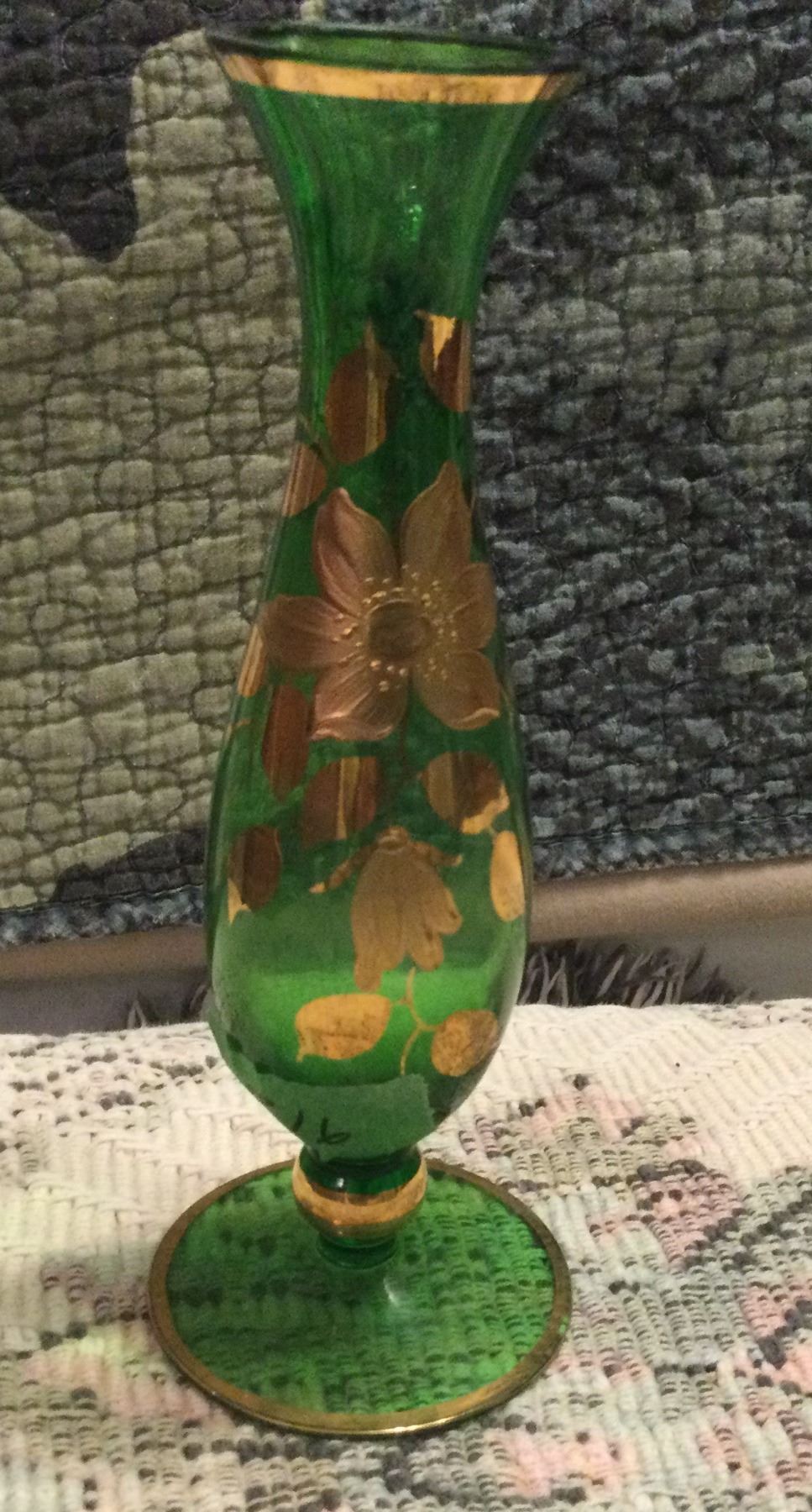 Beautiful 1963 Czechoslovakia hand painted green vase 8" high