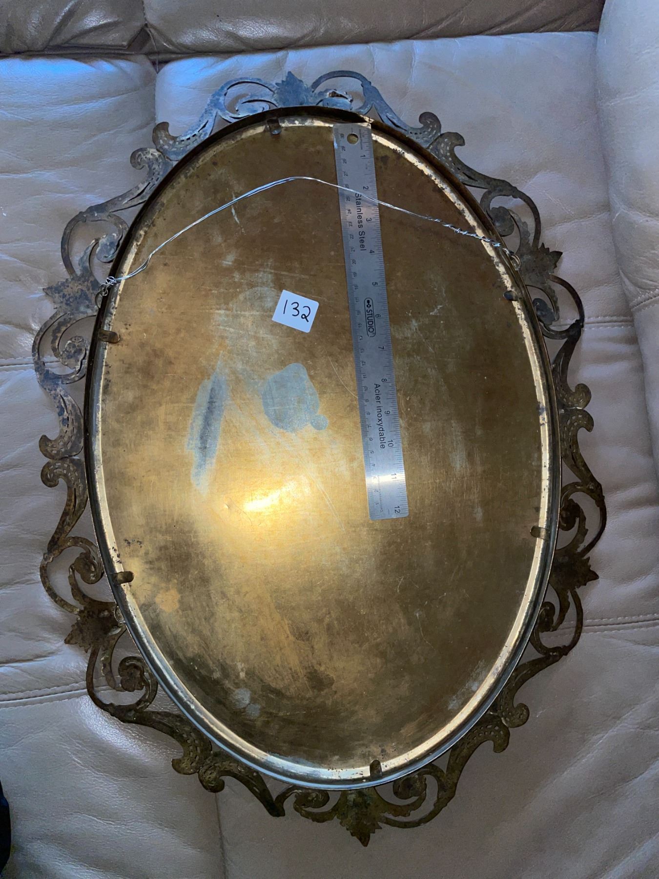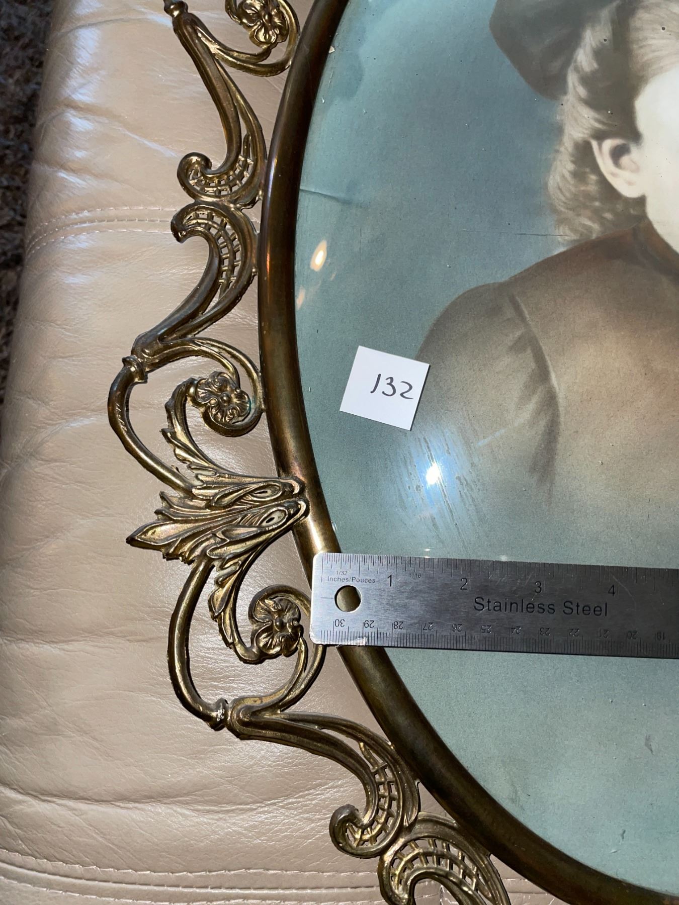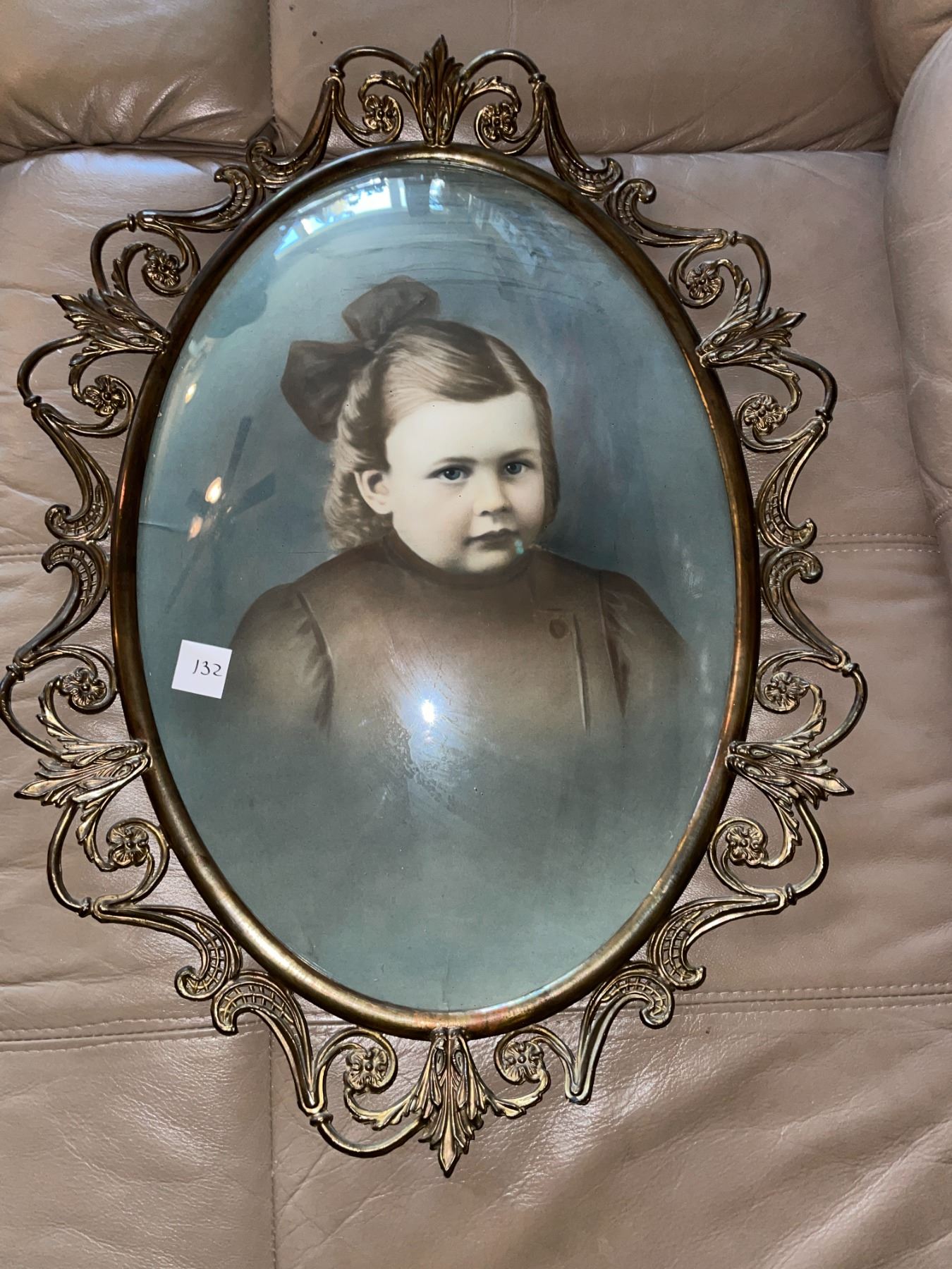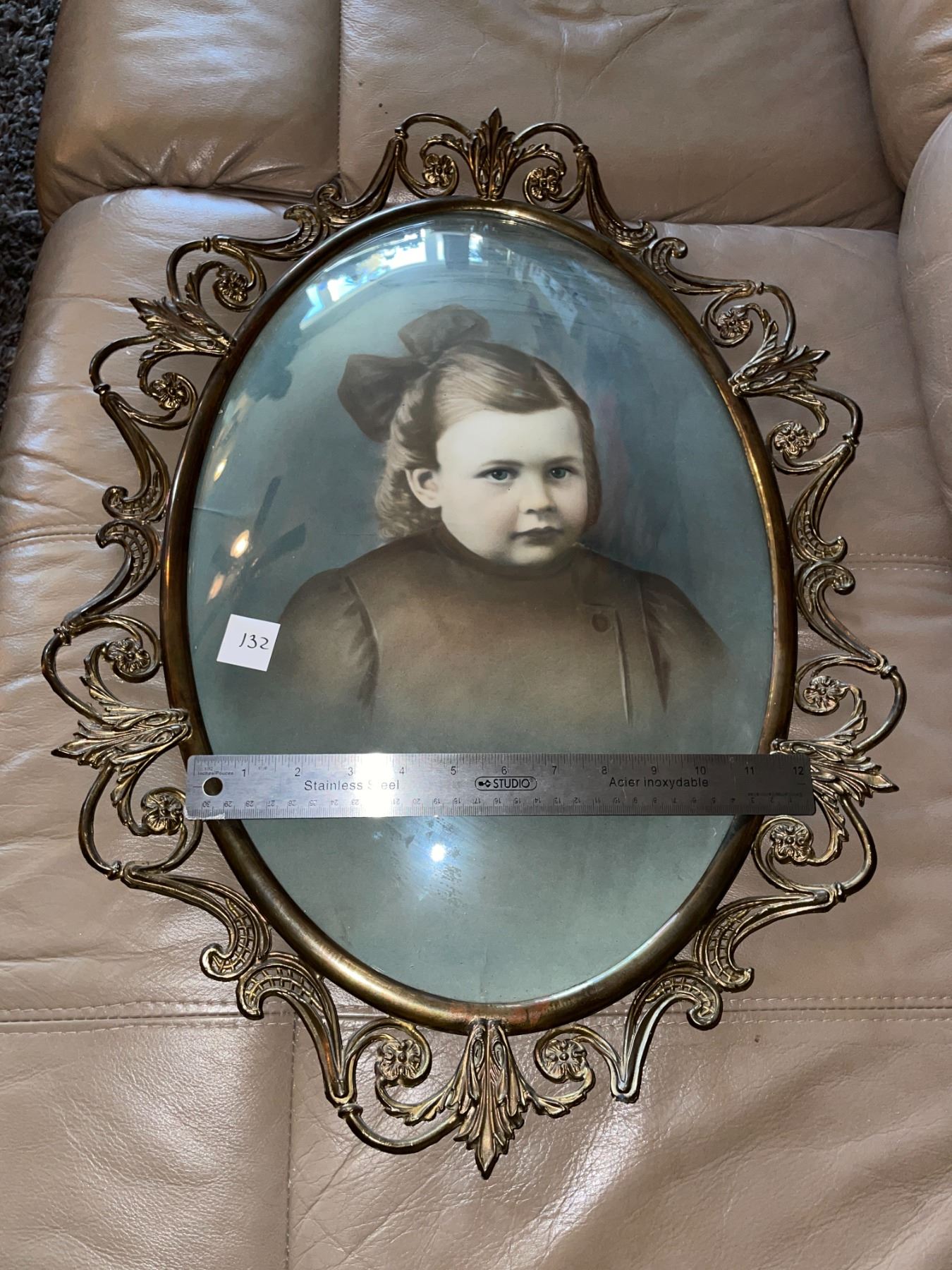 Beautiful, antique, bubble glass, ornate metal frame with original picture, from early 1900's