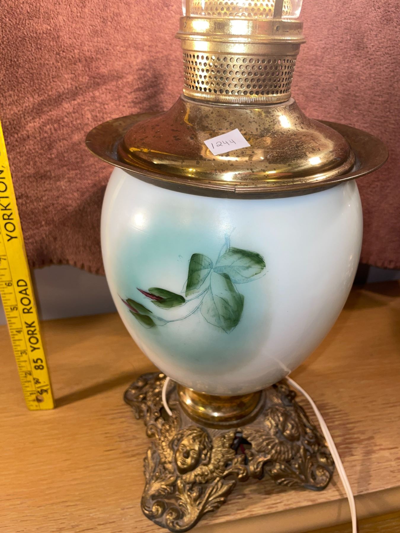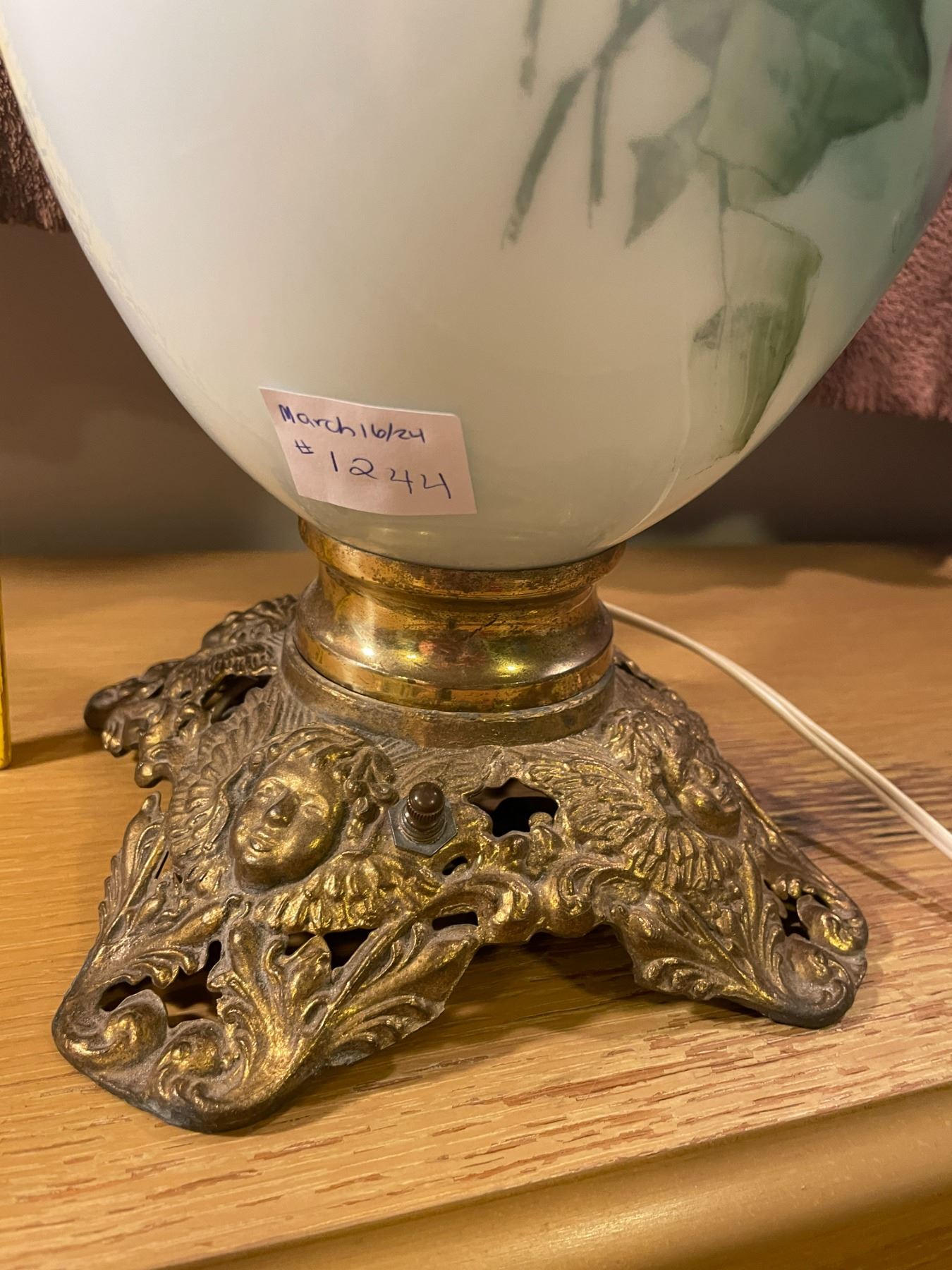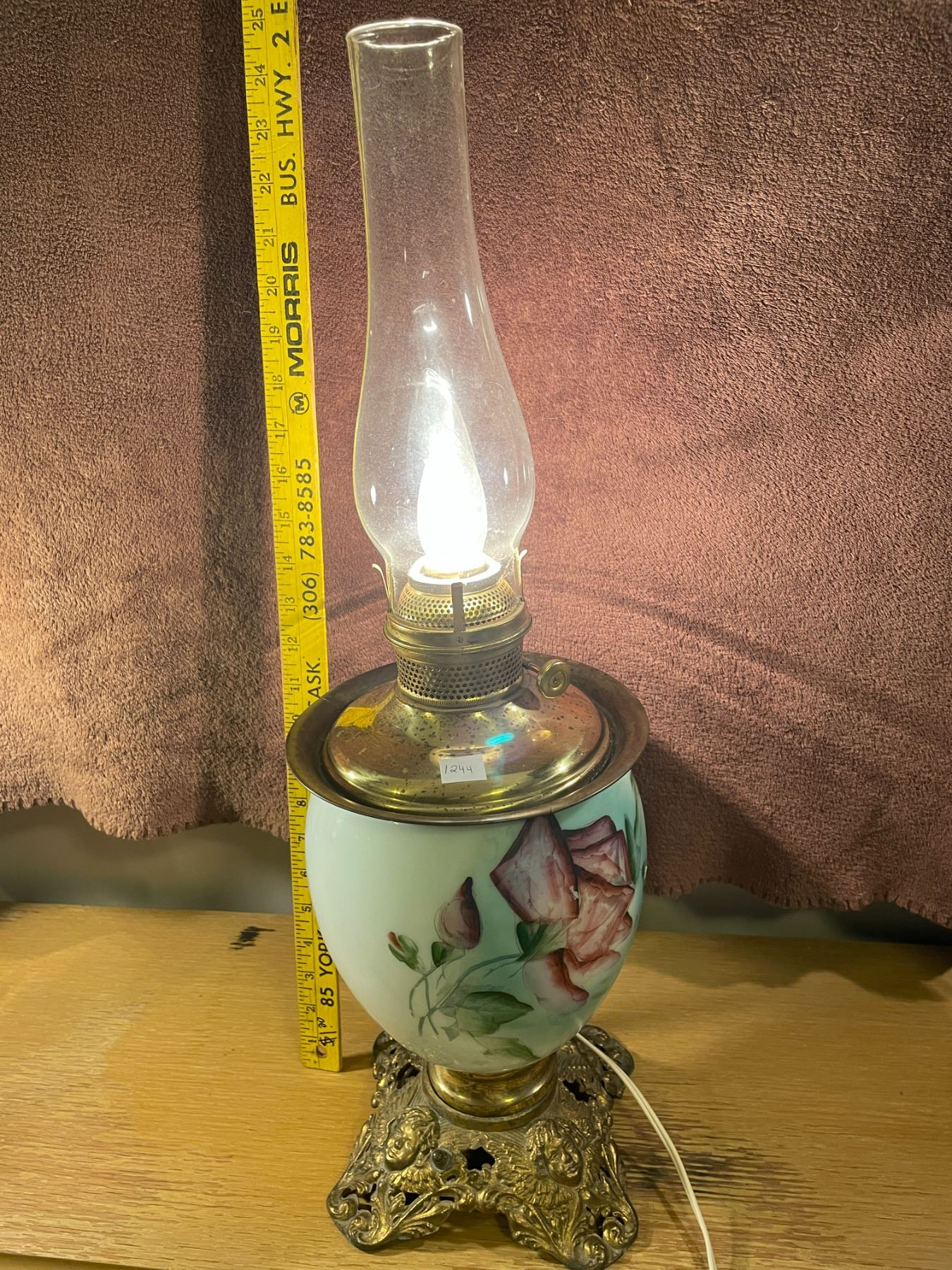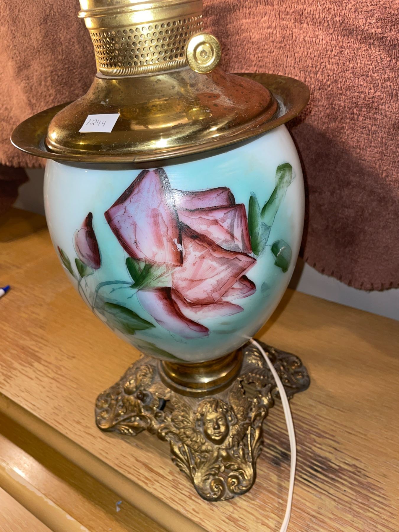 Beautiful, vintage, hurricane lamp, hand-painted. Missing large, hurricane shade