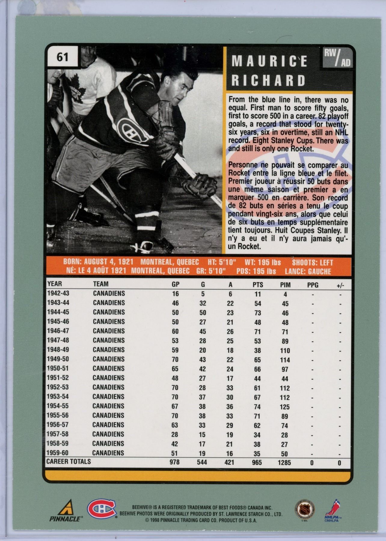 Beehive pinnacle Maurice Richard golden original card mint condition