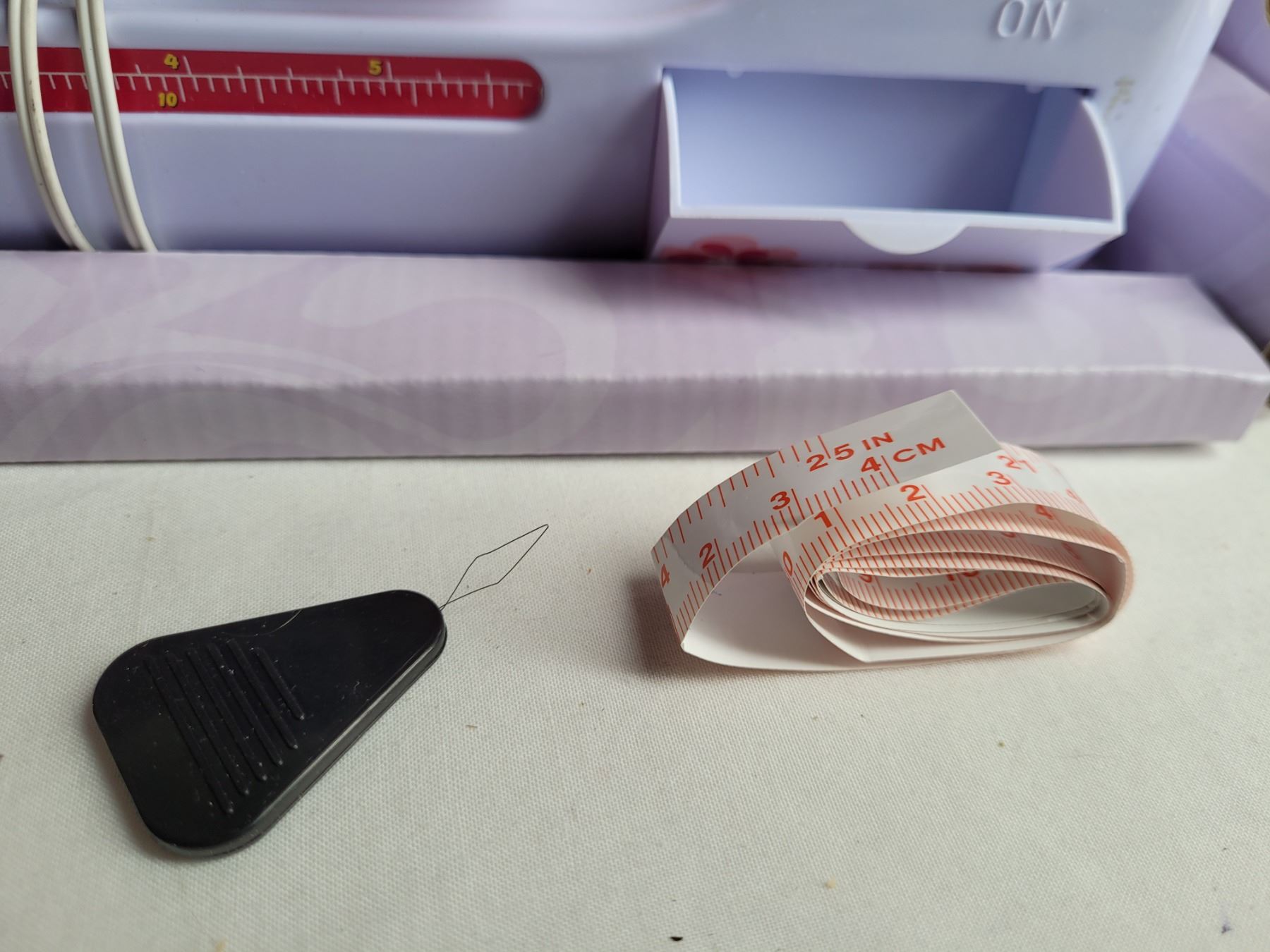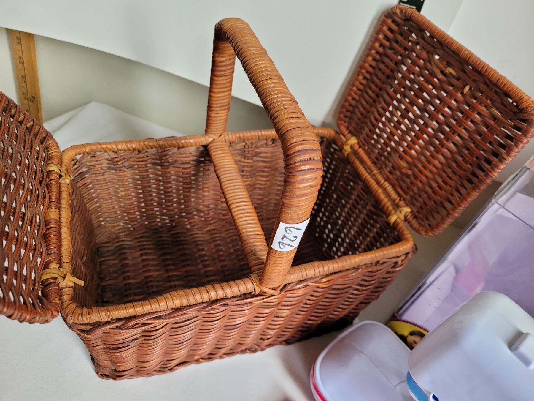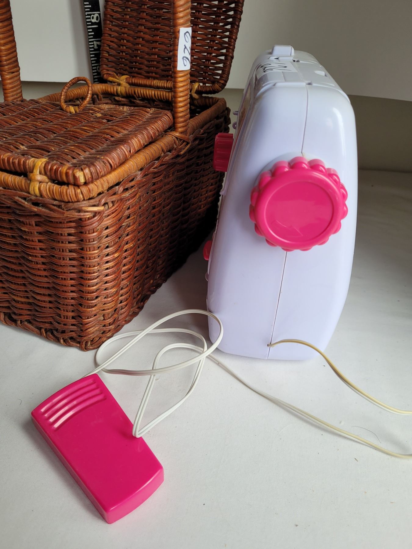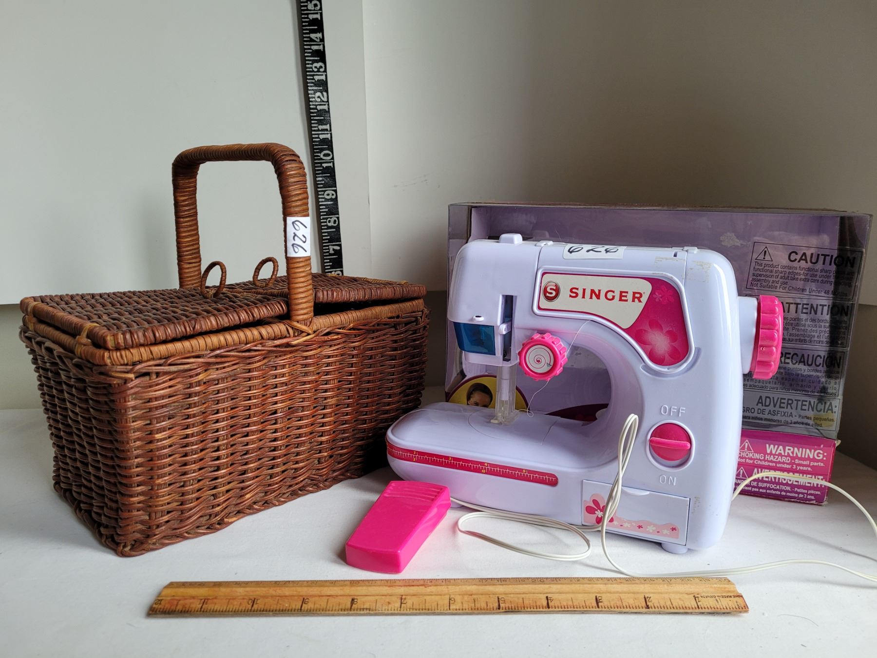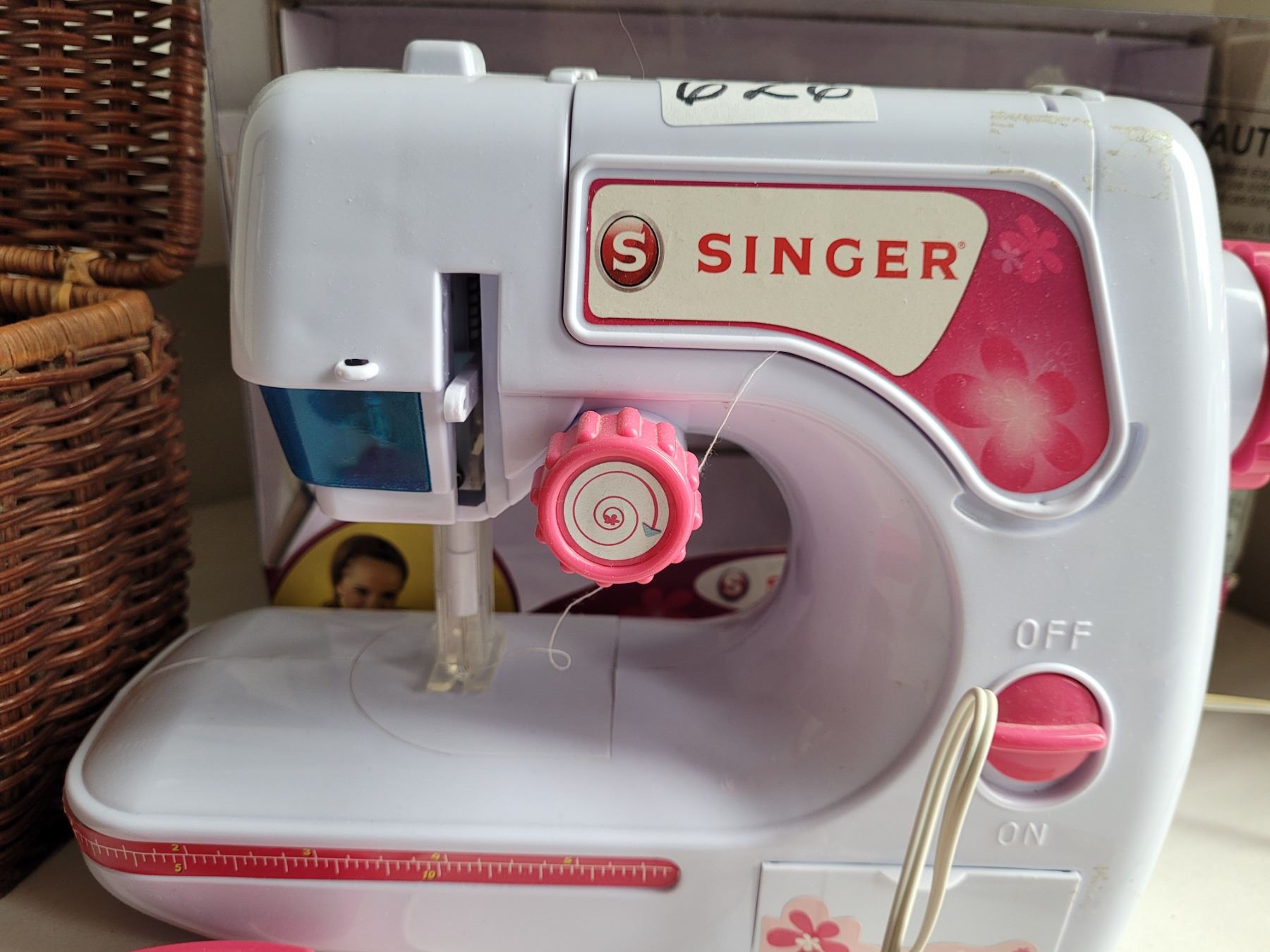 Beginner Singer sewing machine & wicker storage basket.