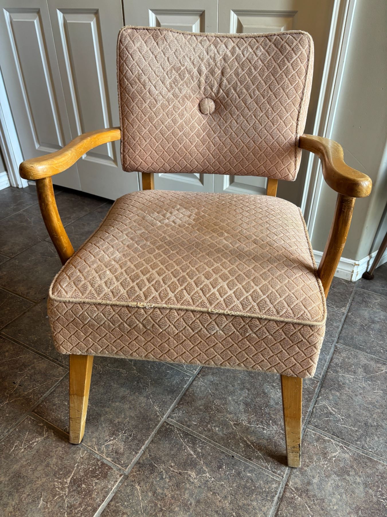 Wood handles/legs, original material, in fair condition, some wear on front seam and scuffs on arms/legs, very good seat support yet,32” high x 24” deep