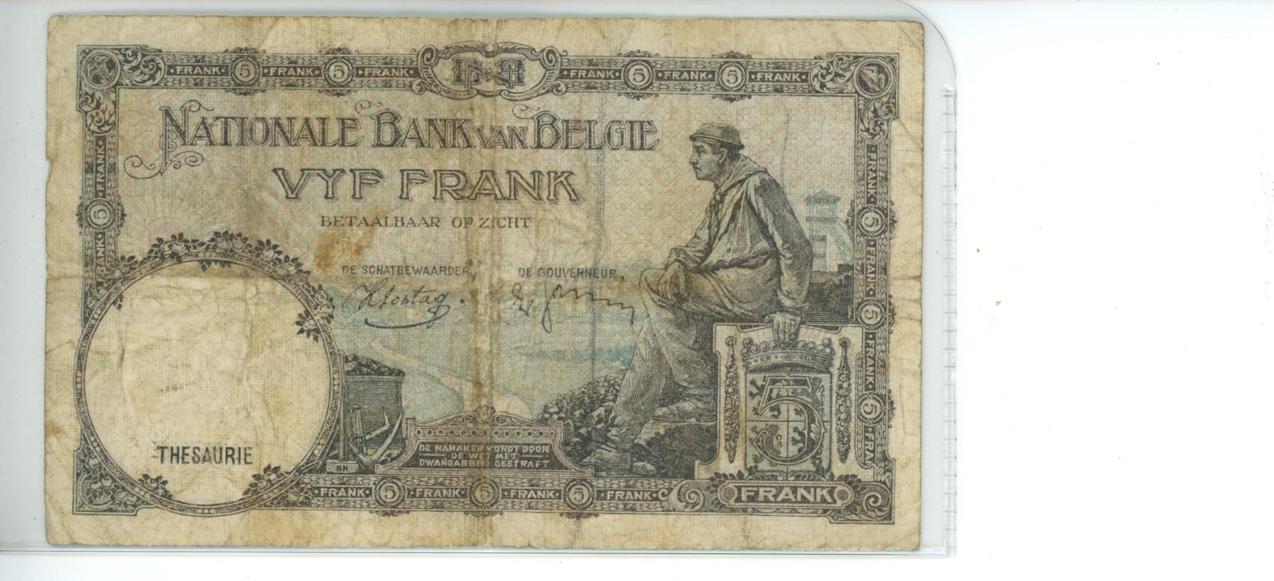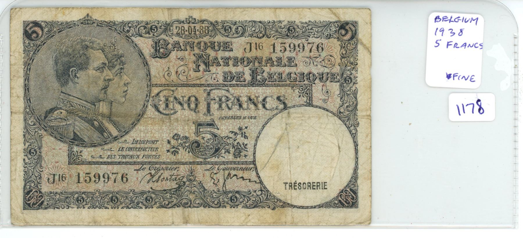 Belgium 1938 5 Francs. Pre-World War II note. Fine.