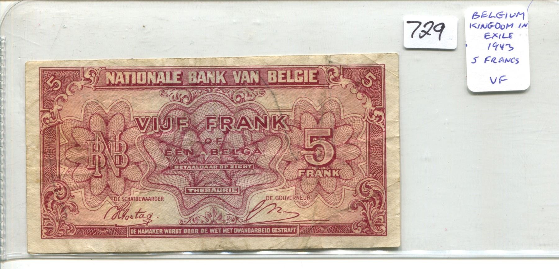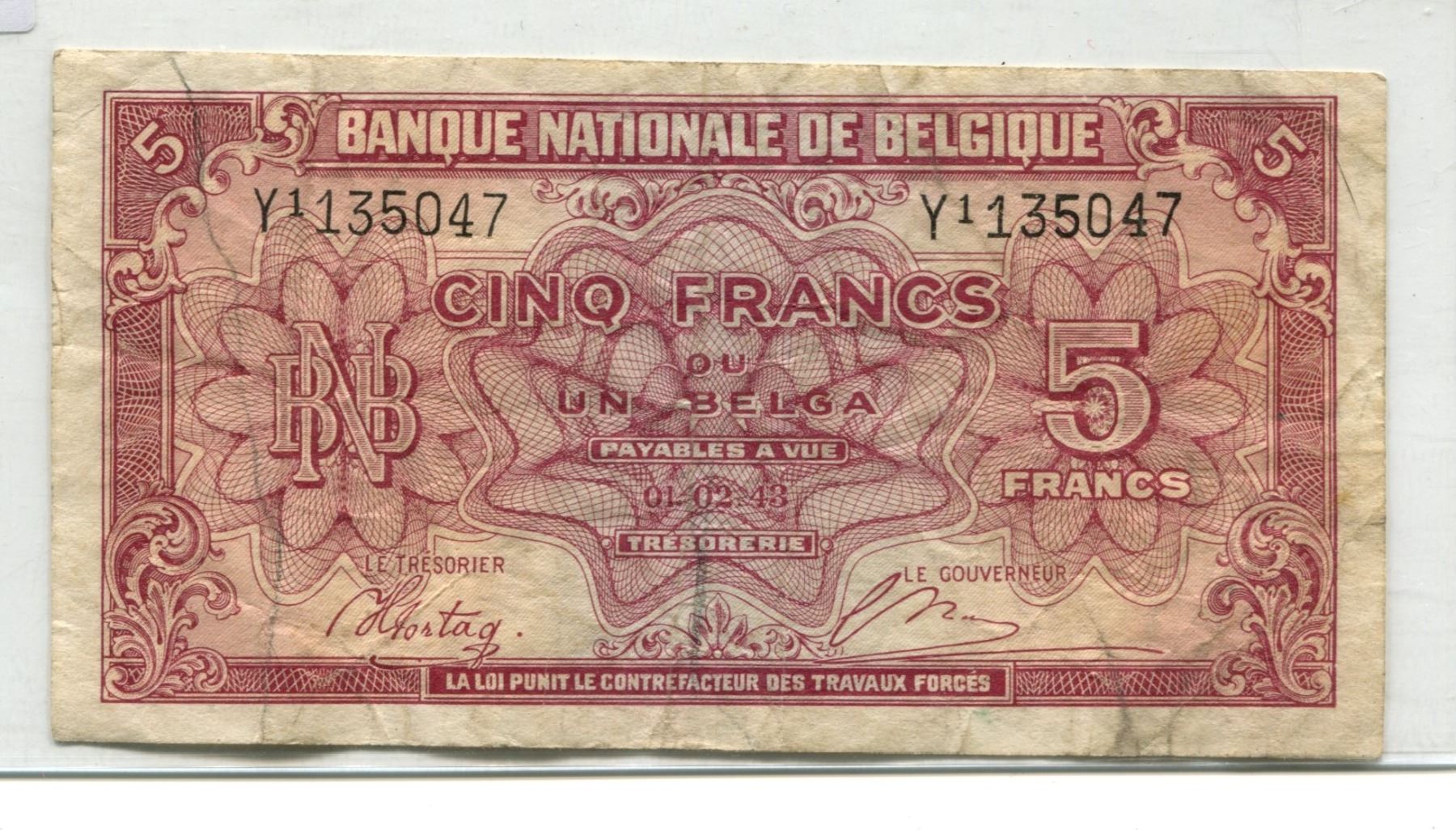 Belgium, Kingdom in Exile. National Bank of Belgium 1943 5 Francs. World War II issue. VF.