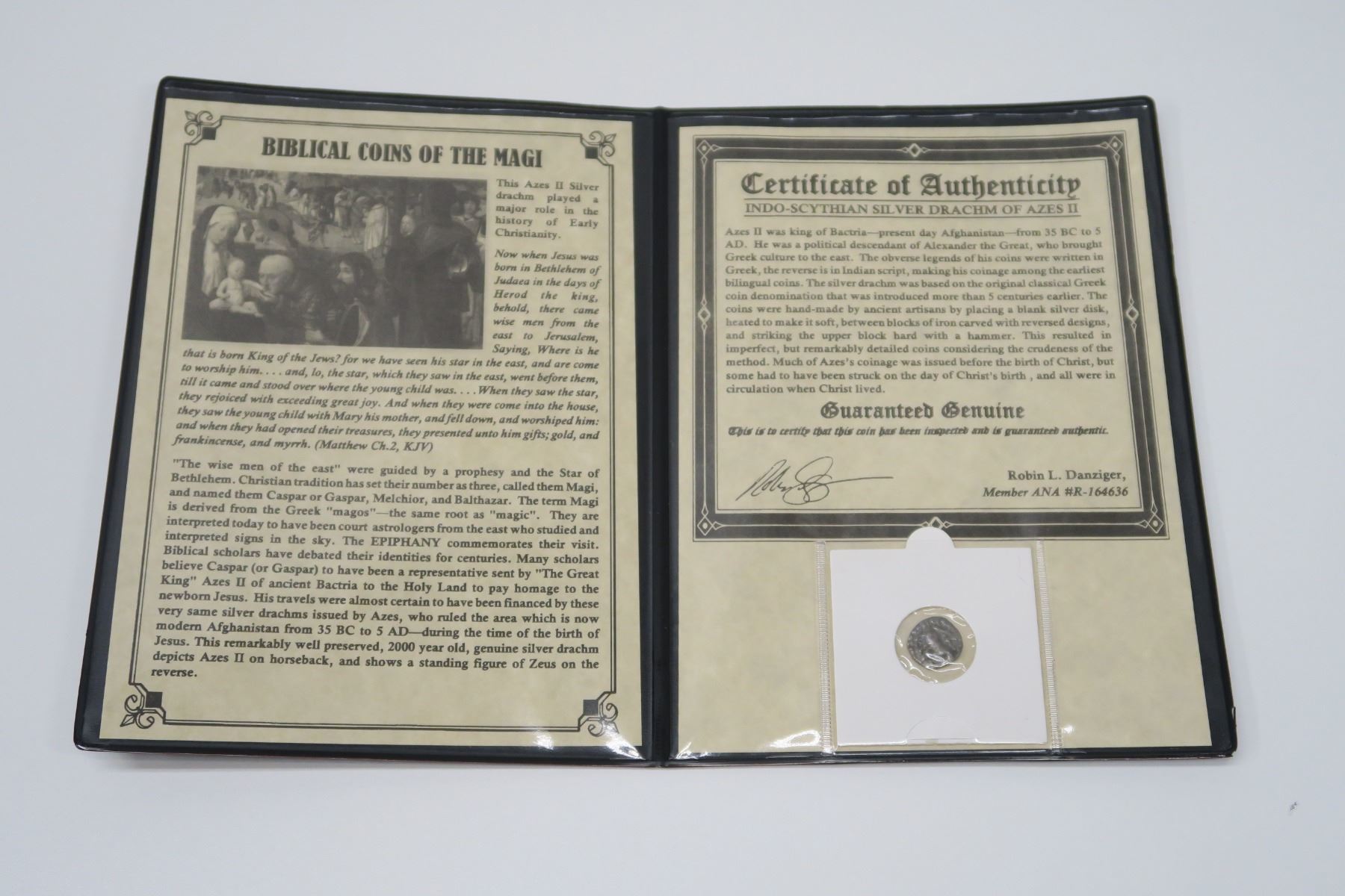 Biblical Coins of the Magi. Indo-Scythian Silver Drachm of Azes II. (Azes II was King of Bactria – present-day Afghanistan) from 35 BC to 5 AD. Ruled while Jesus Christ was alive. In folder with background info.