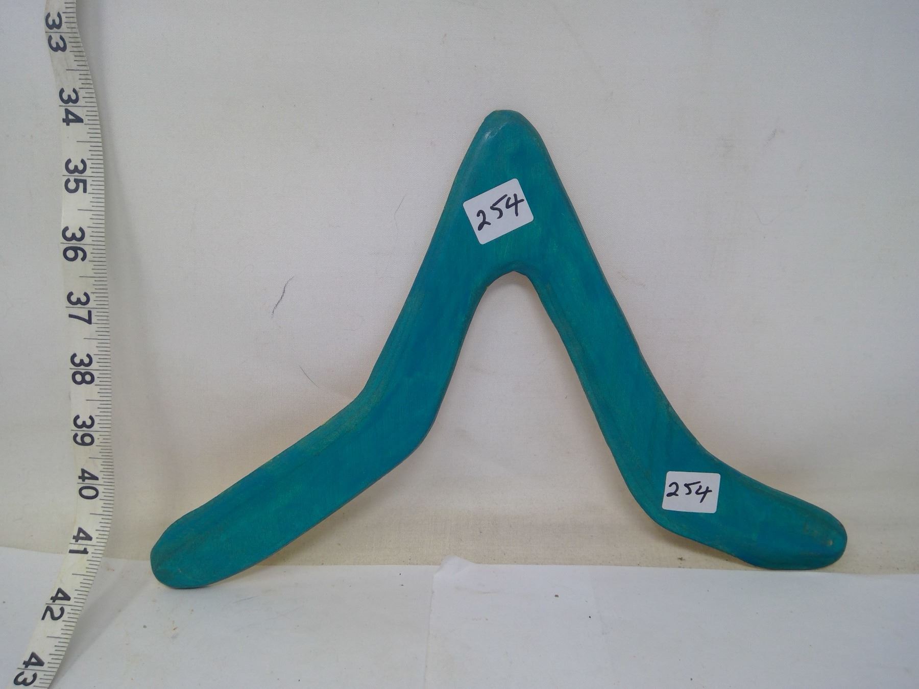“Big Fuzzy” boomerang. Right hander. Range 35 meters. 2 hockey stick shape made for a highly momentous flight. Span 13”