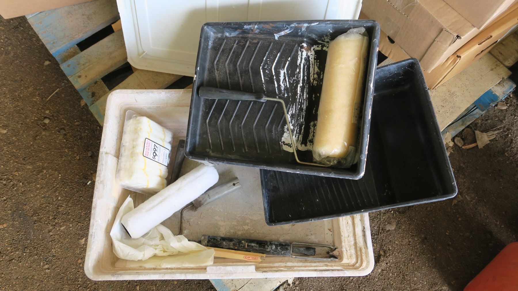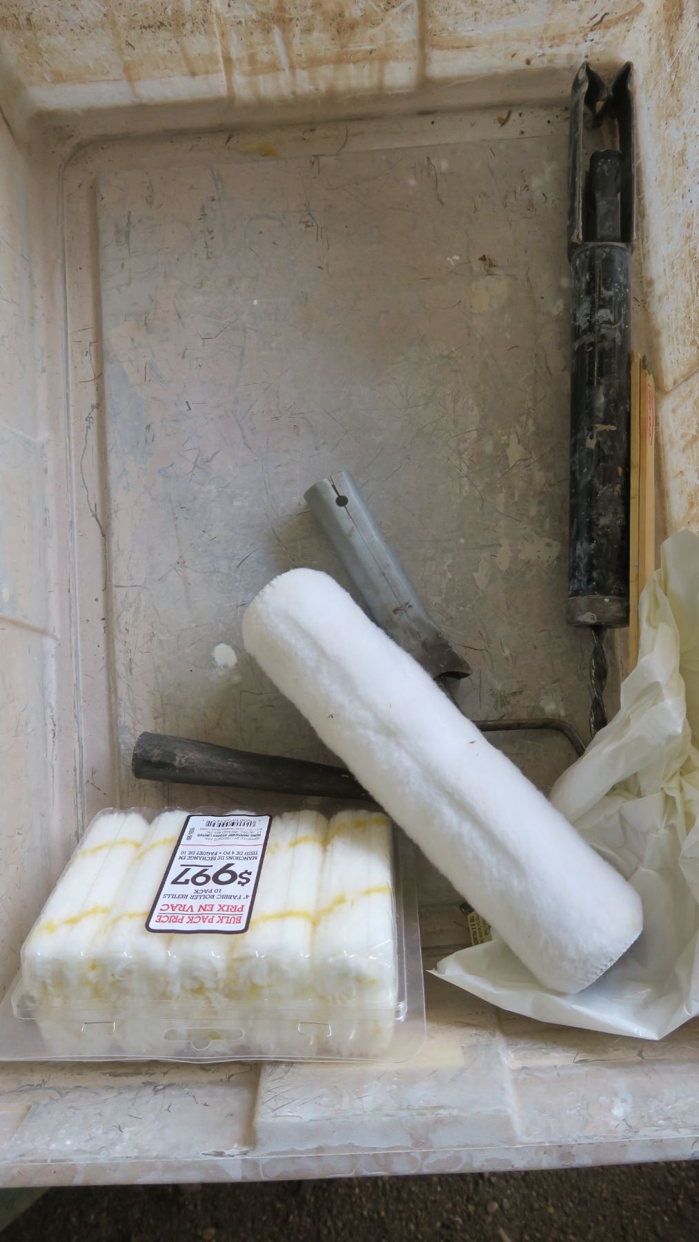 Bin of Paint Supplies - Trays, Sleeves, Sanding Pole, etc.