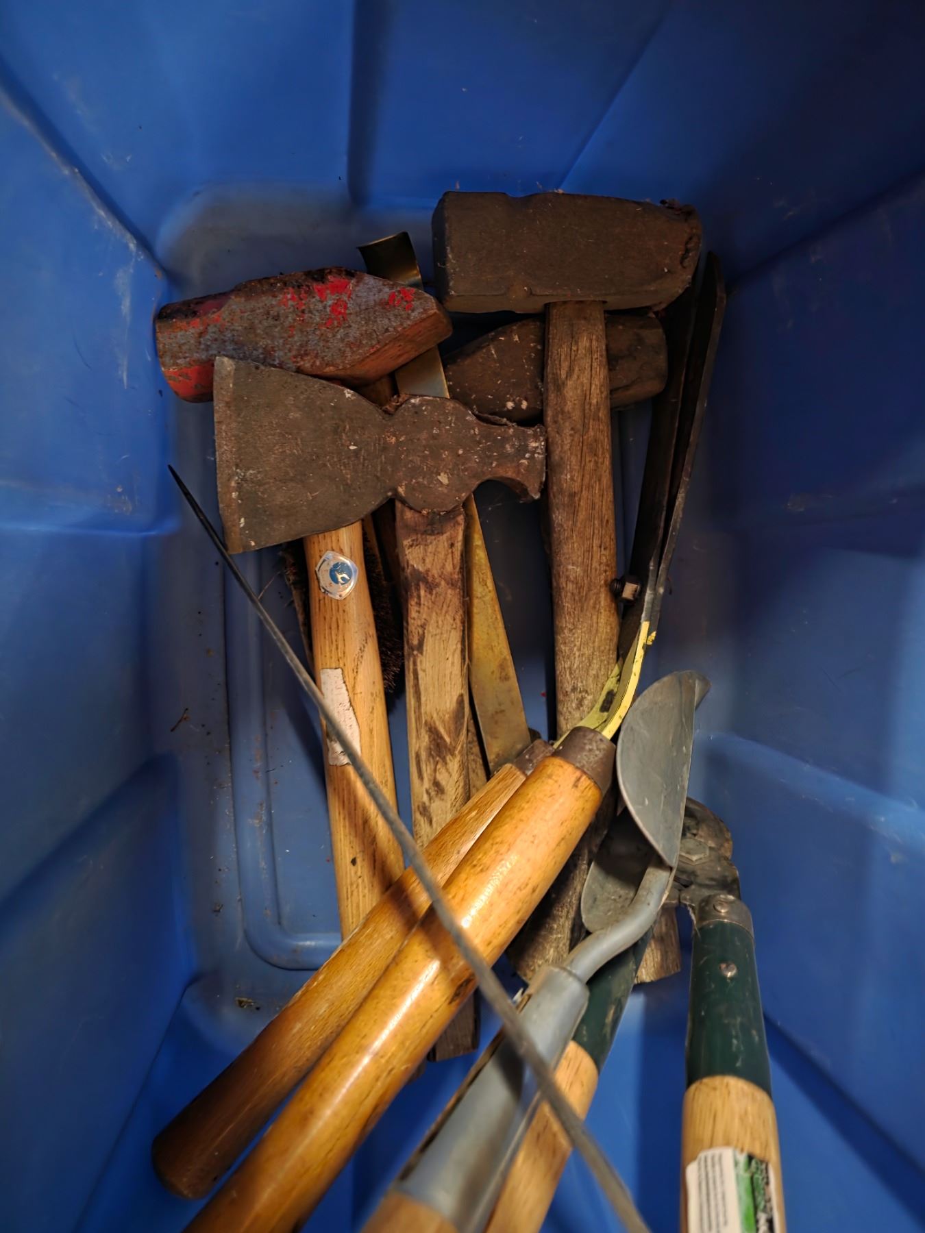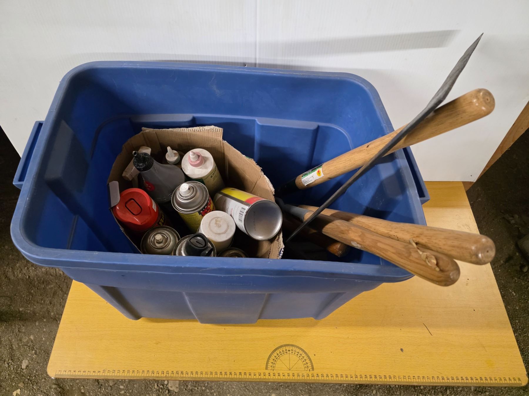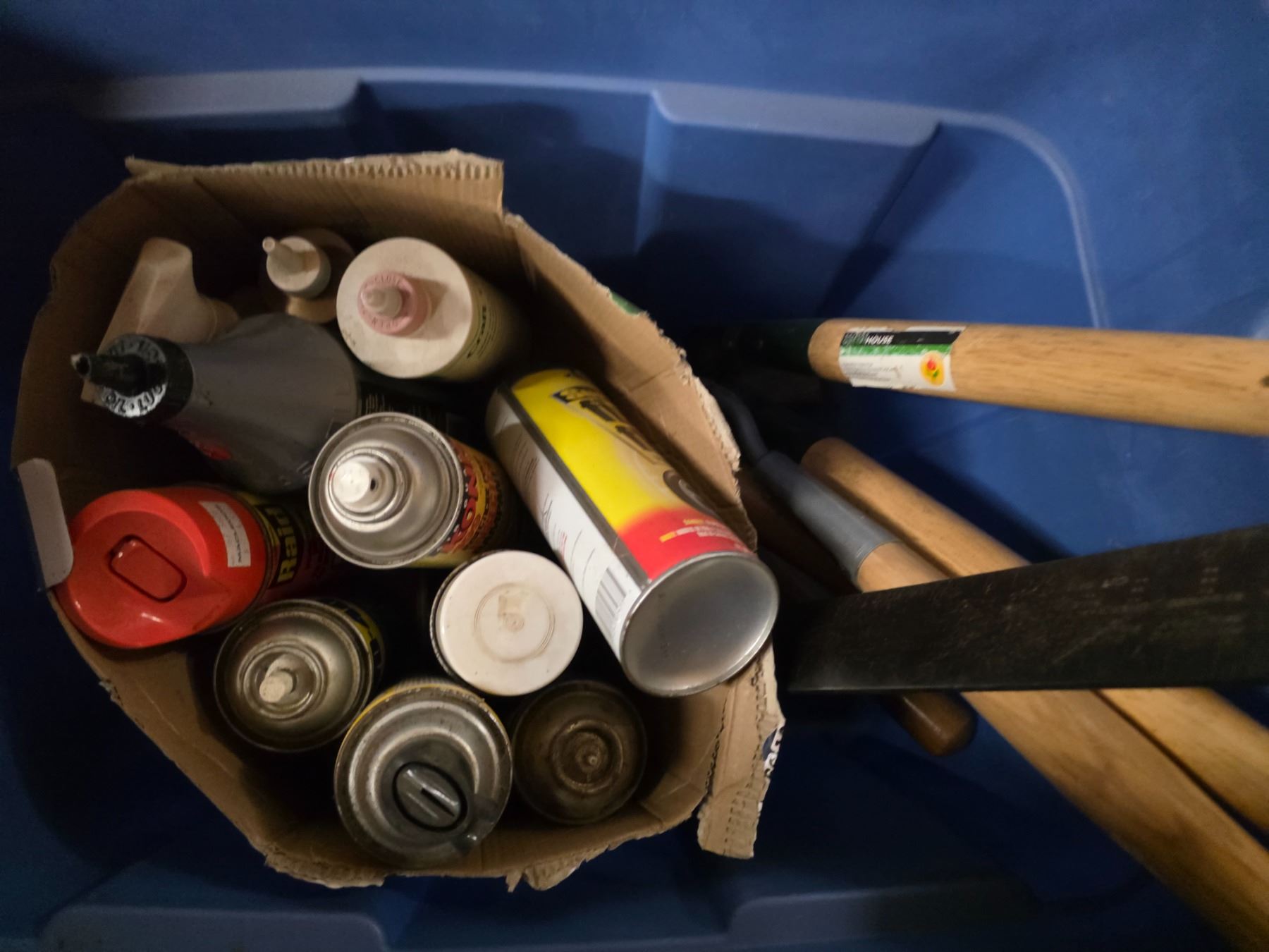 Bin of various tools and spray paint