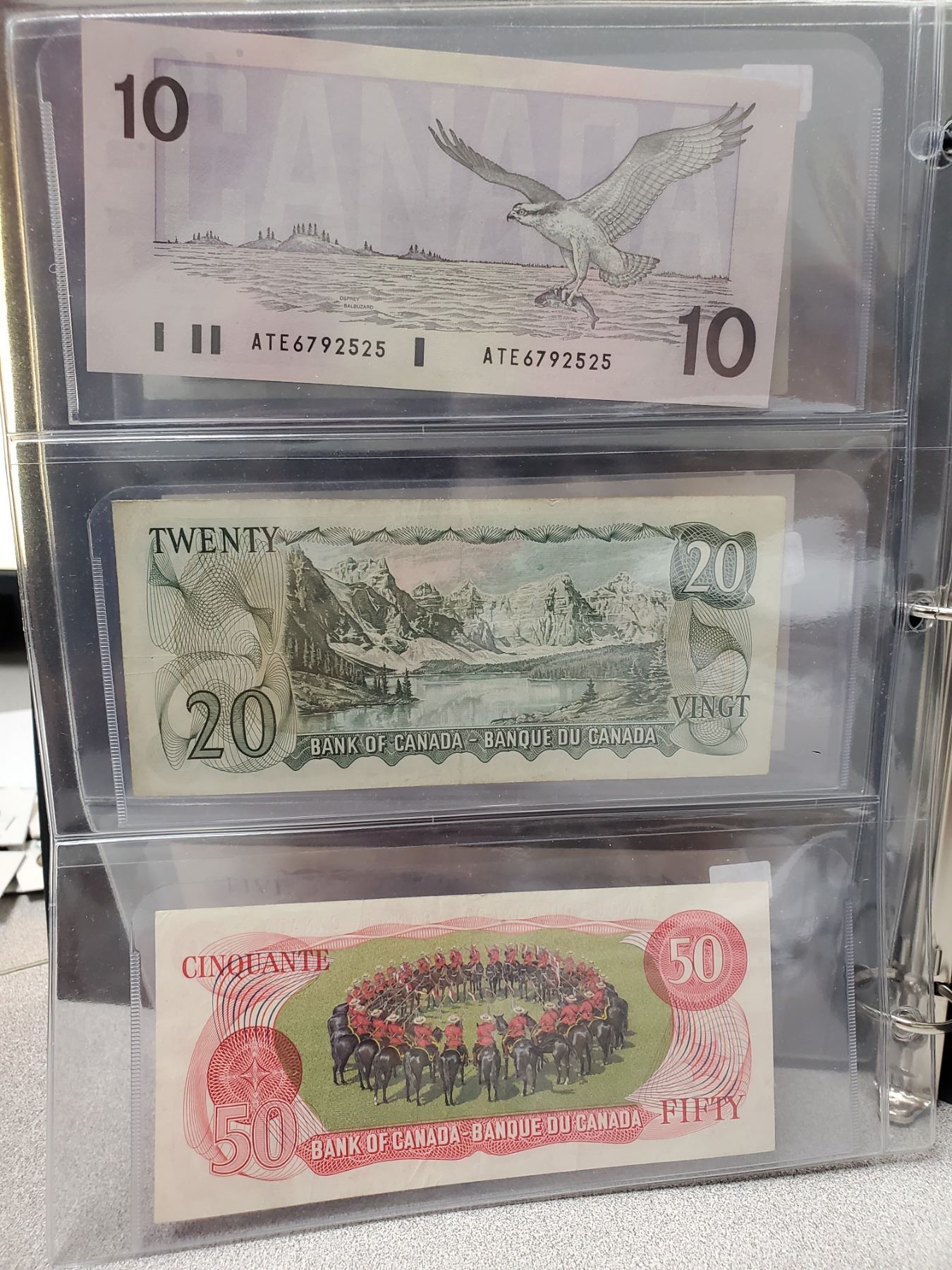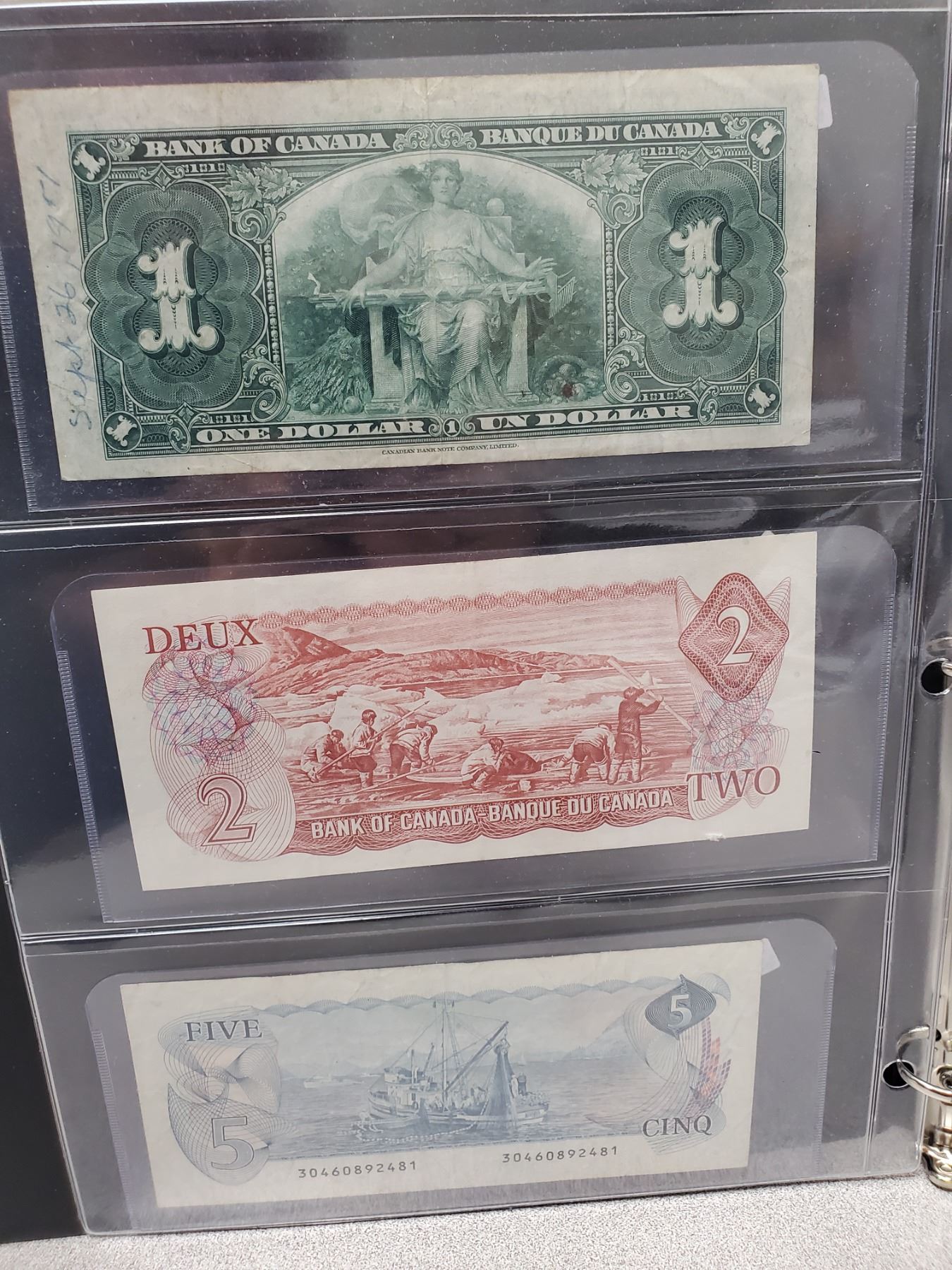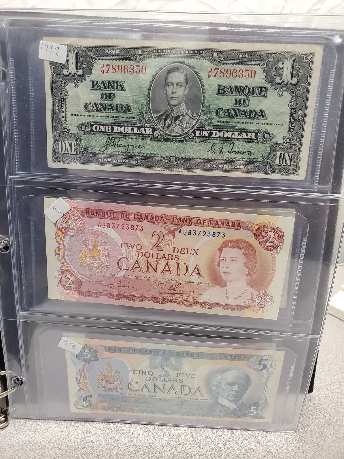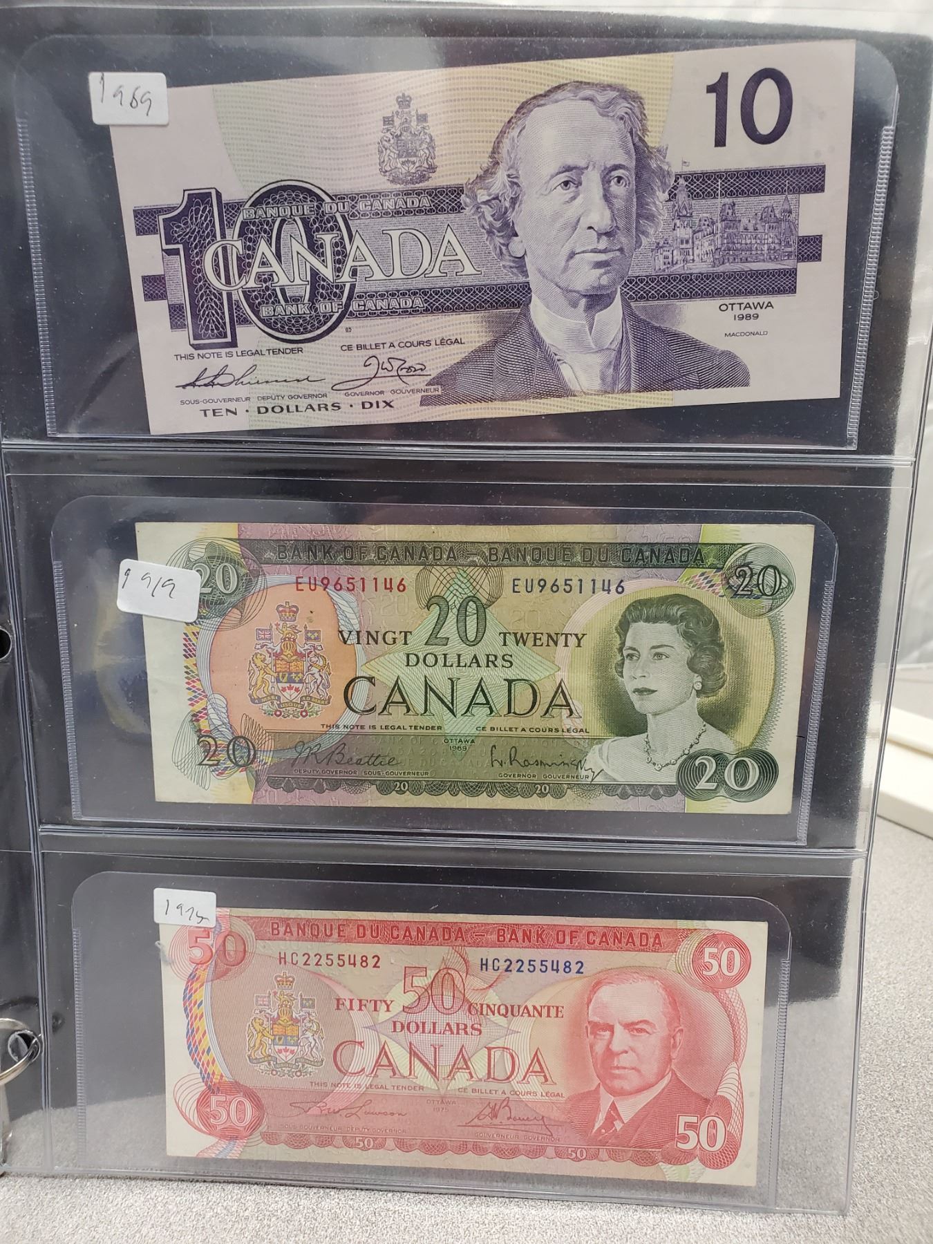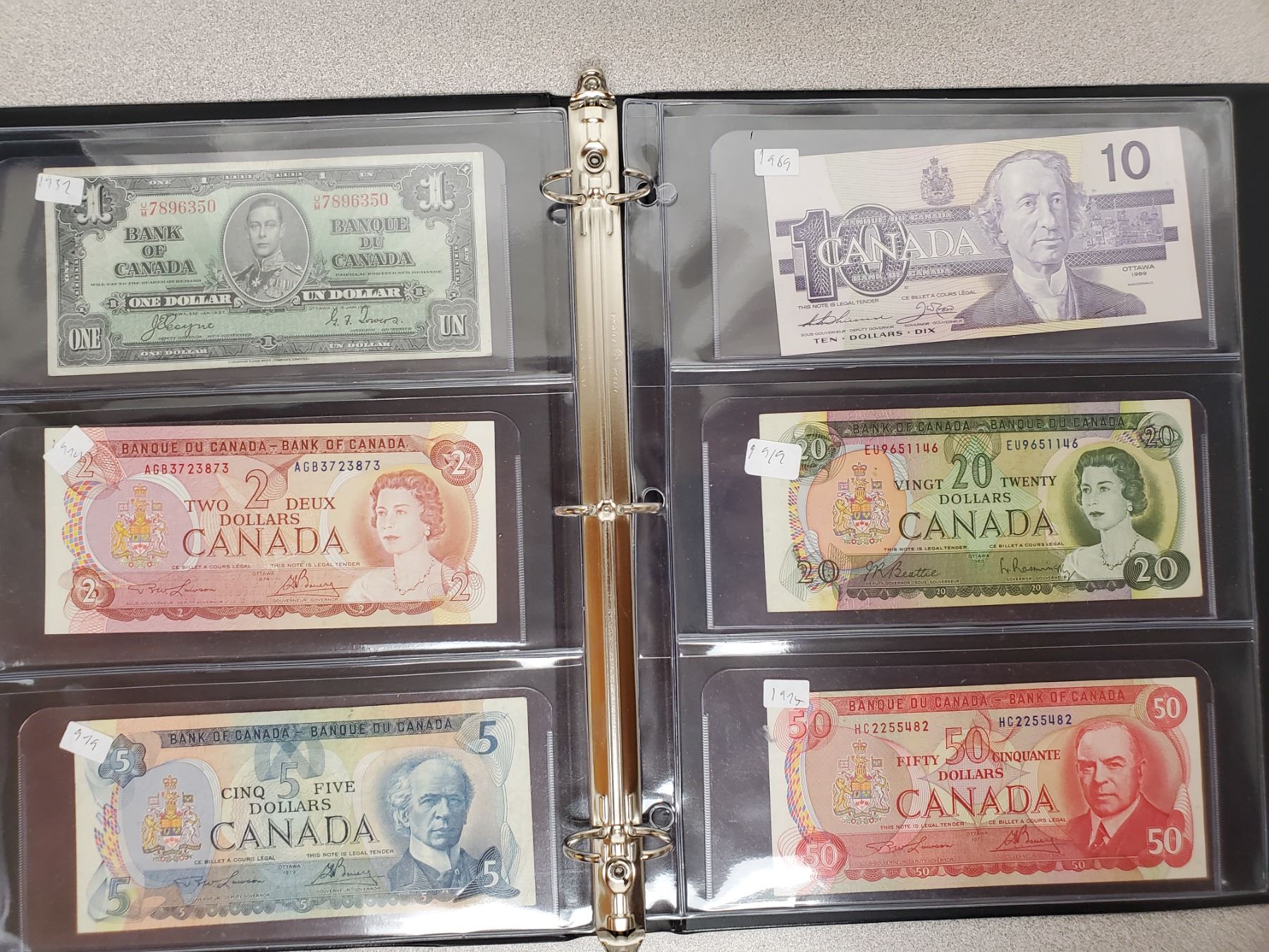 Binder of 6 Canadian bills 1937 $1, 1974 $2, 1979 $5, 1989 $10, 1969 $20, 1975 $50