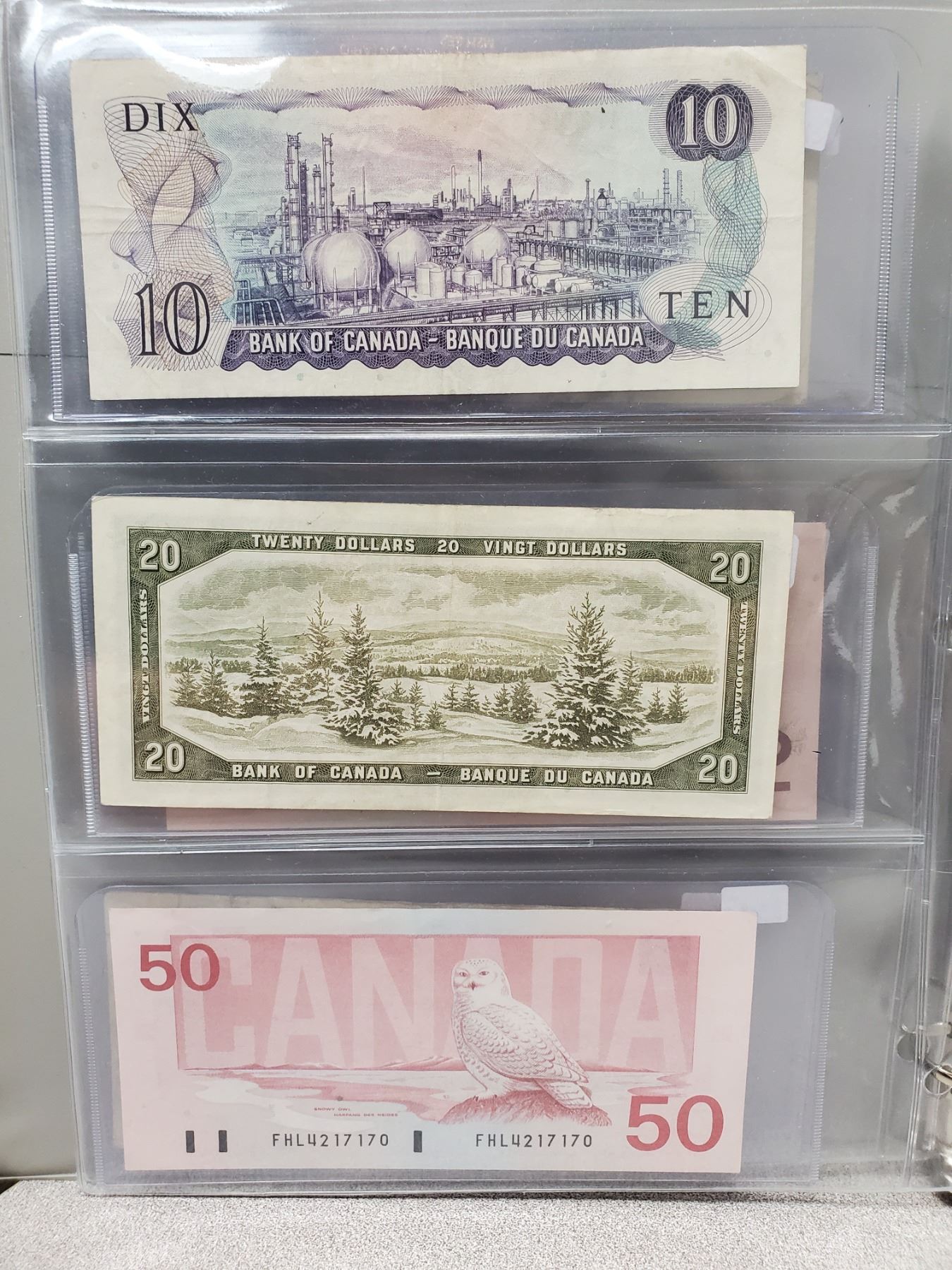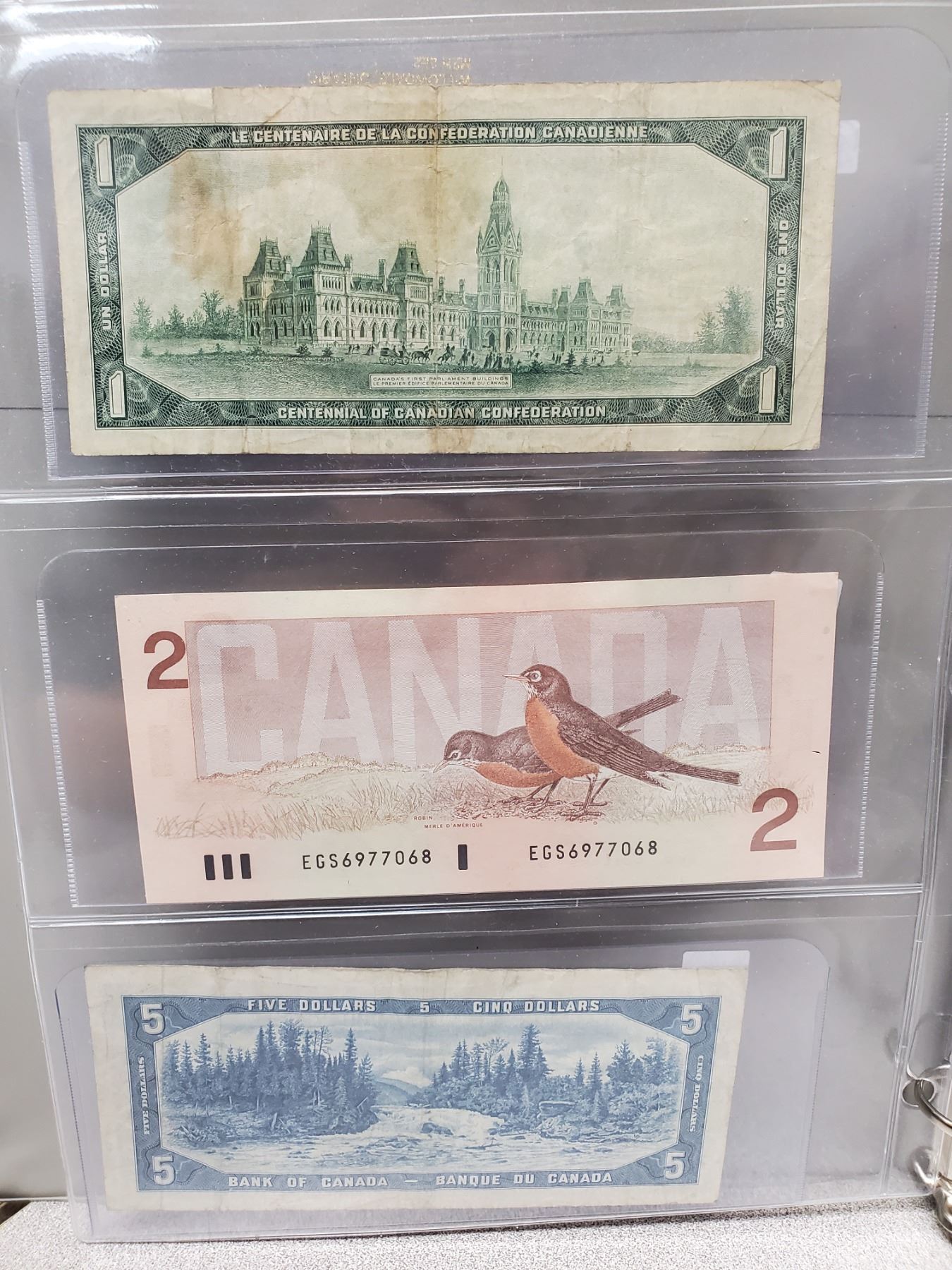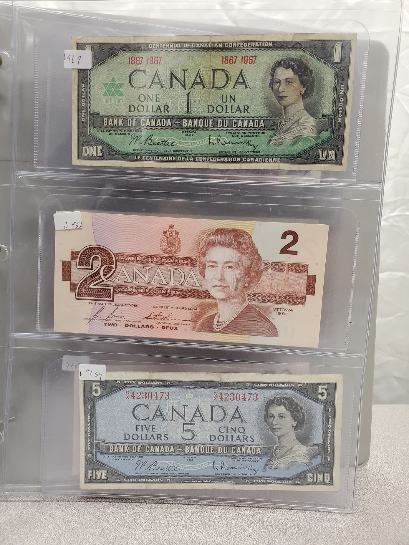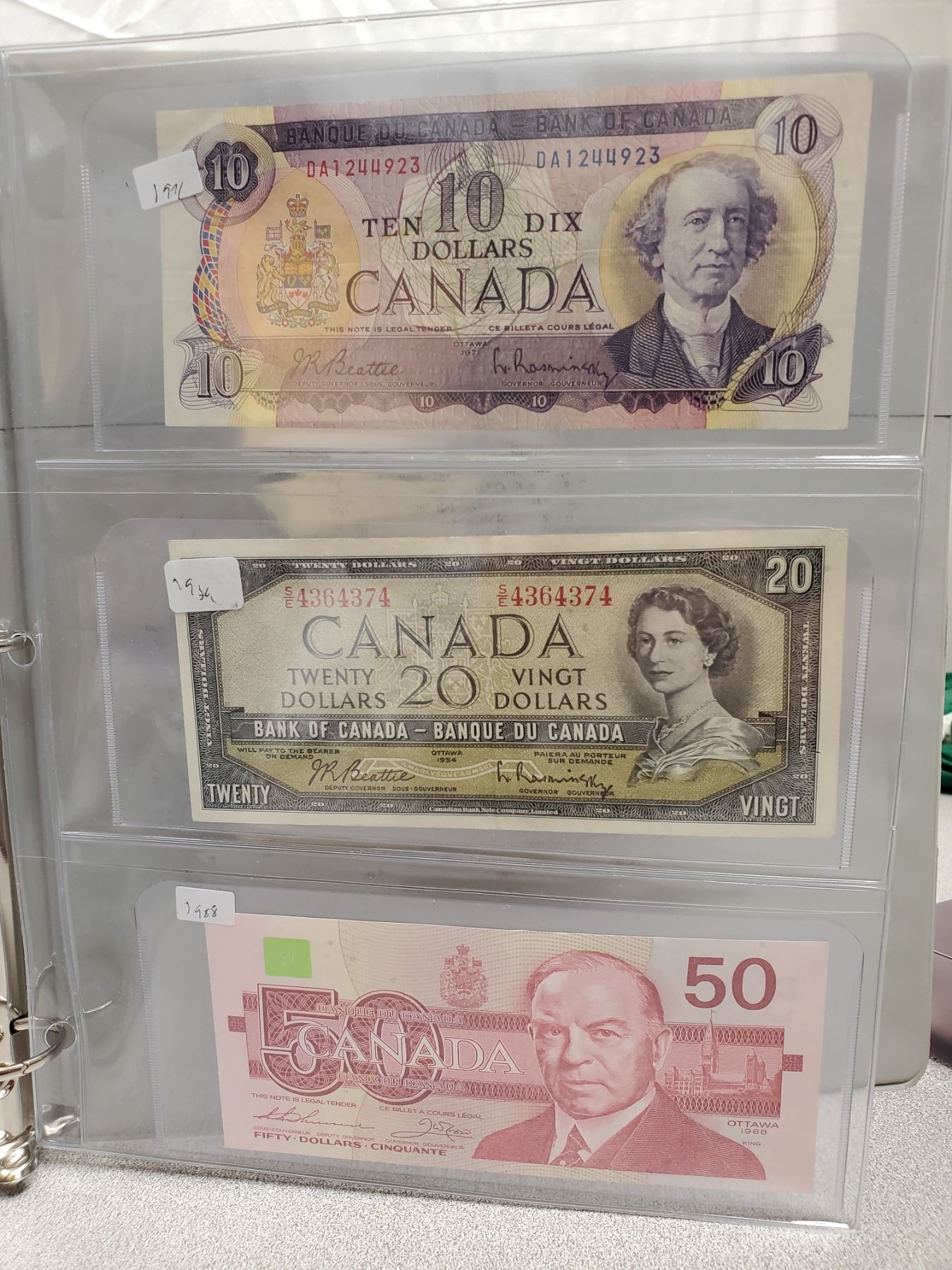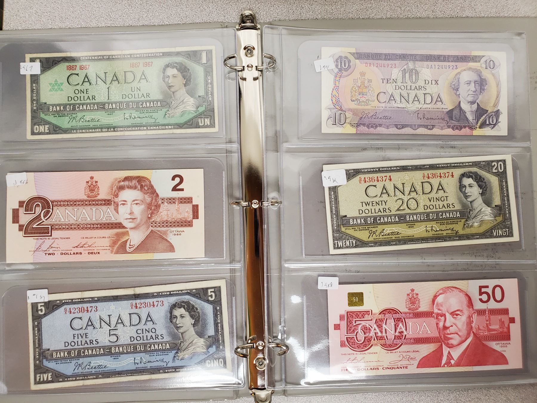 Binder of 6 Canadian bills 1967 $1, 1986 $2, 1954 $5, 1971 $10, 1954 $20, 1988 $50