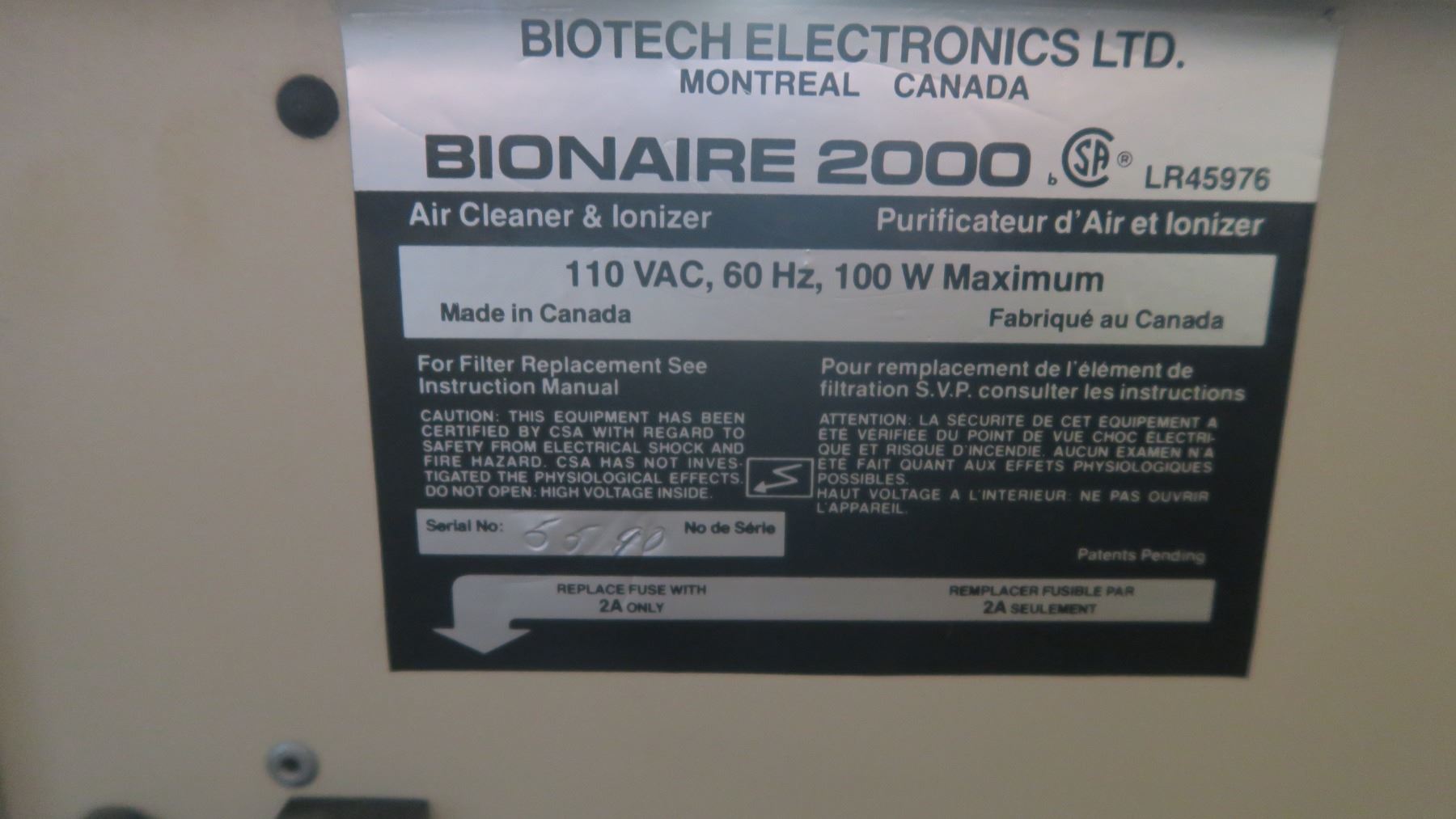Bionair 2000 Air Ionizer