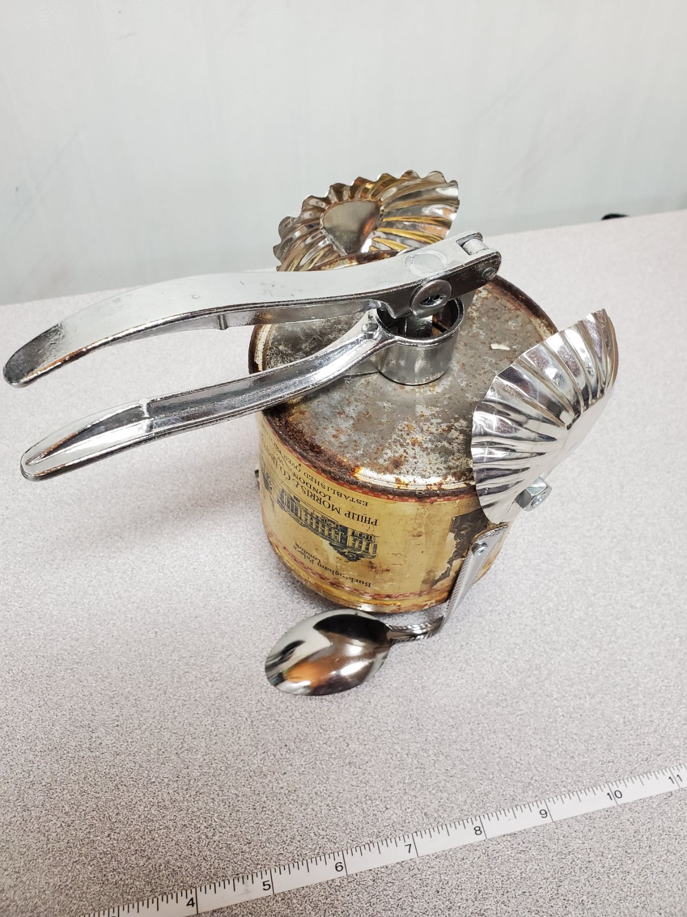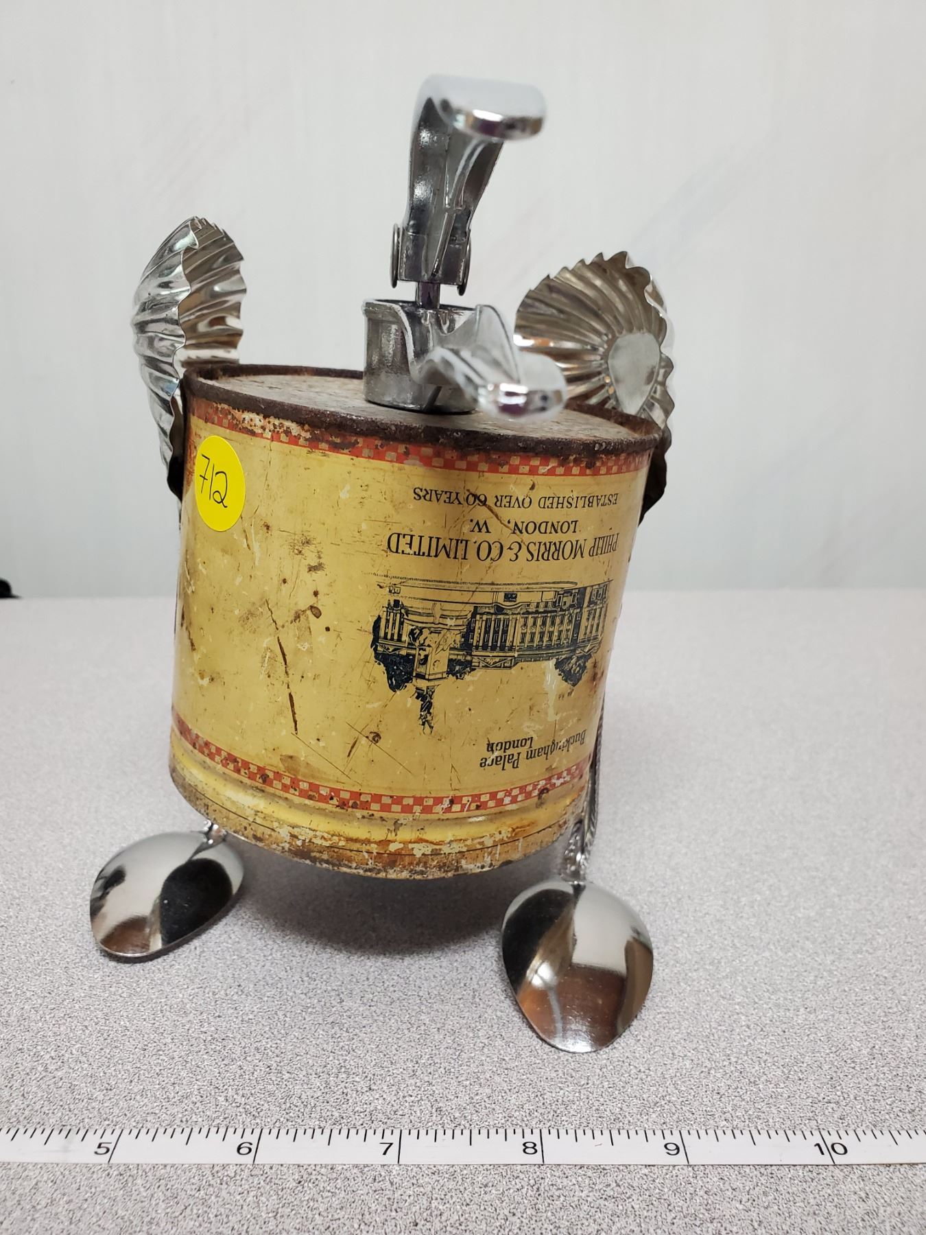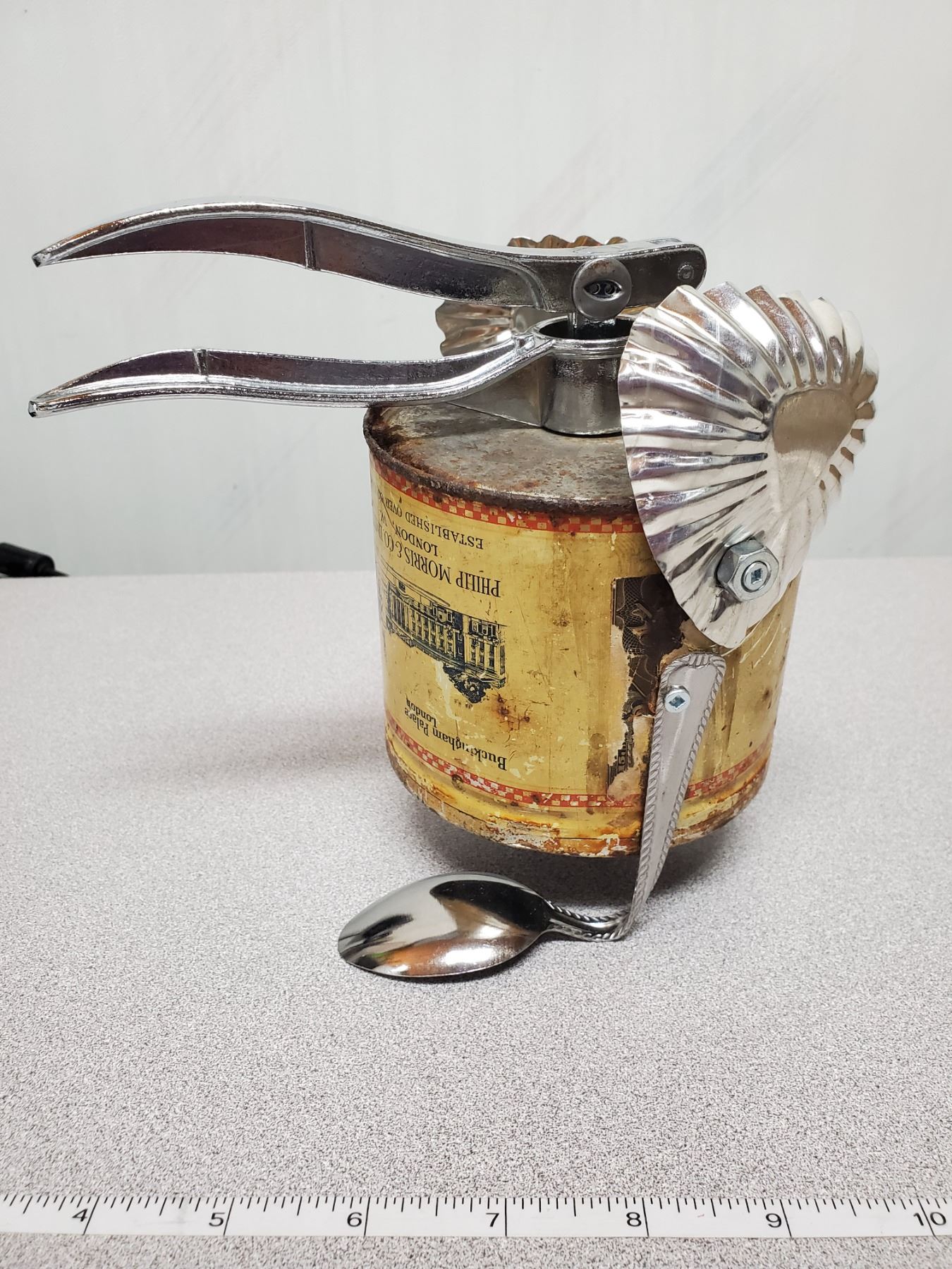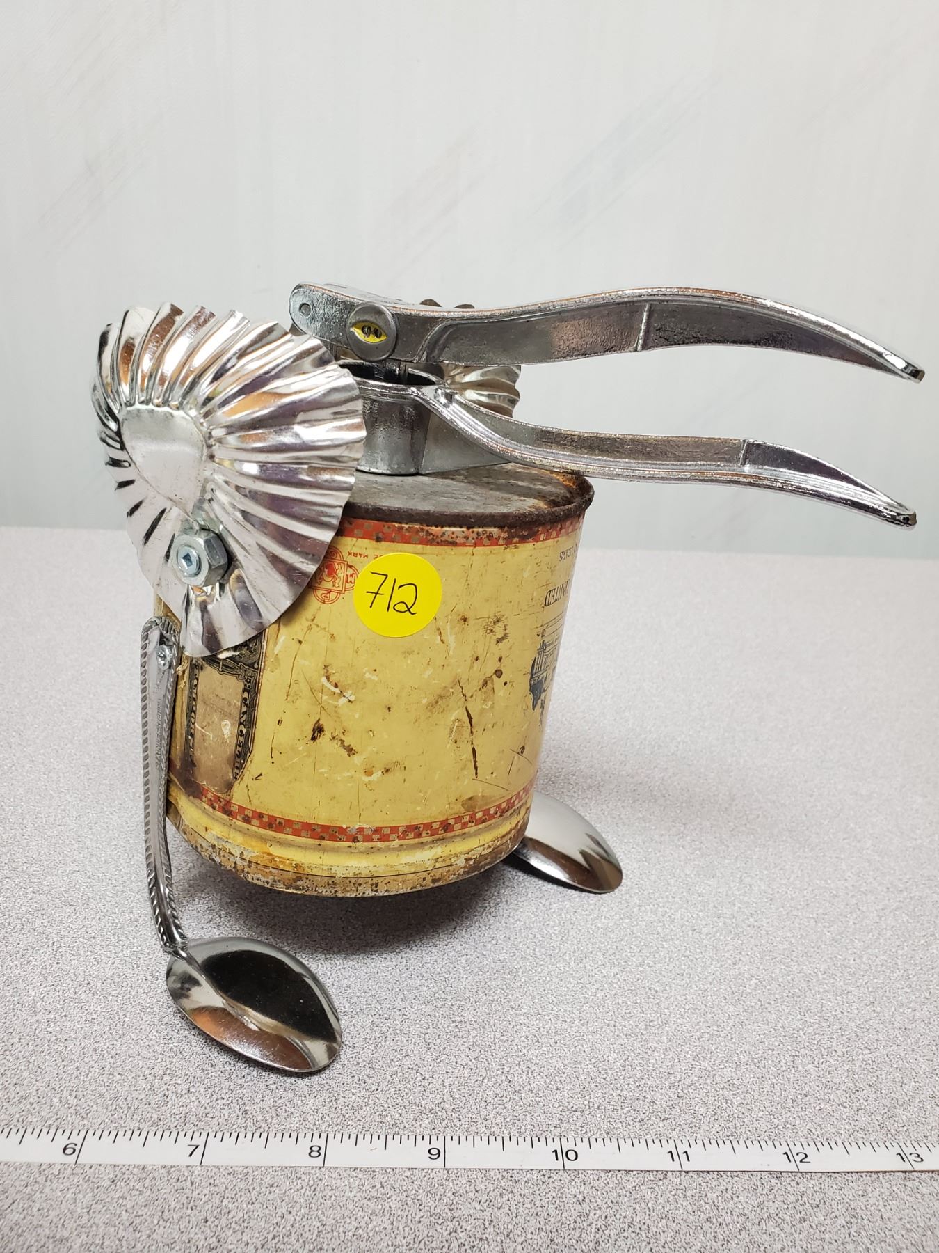 Bird made from repurposed metal and antique can