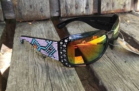 Black Montana West irasdecent sunglasses with light pink and turquoise beaded design on legs. UV400.