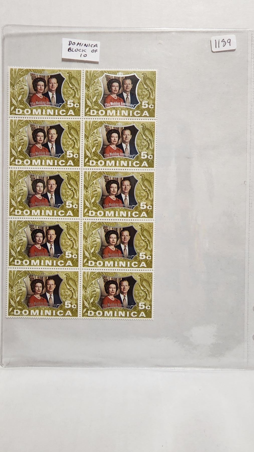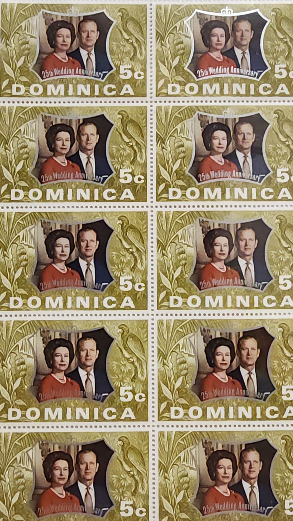 Block of 10 Dominica 5 Cents Stamps that commemorate the 25th Wedding Anniversary of Queen Elizabeth & Prince Philip. Mint.