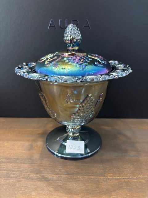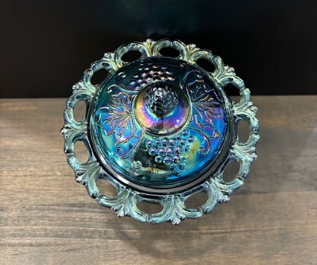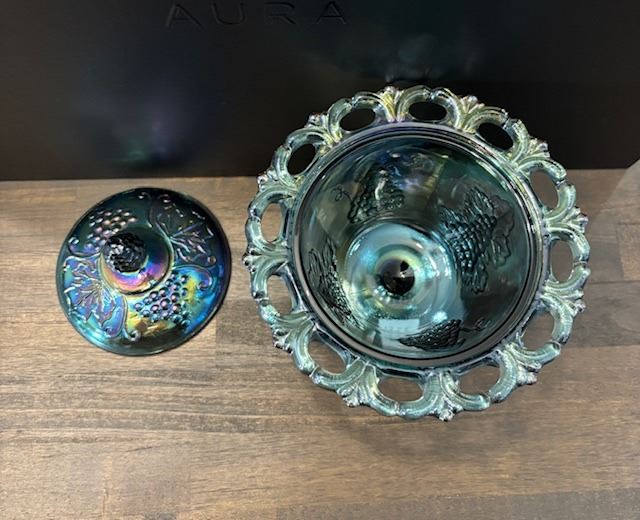Blue Carnival Glass “Harvest Grape “ Candy Dish with Lid