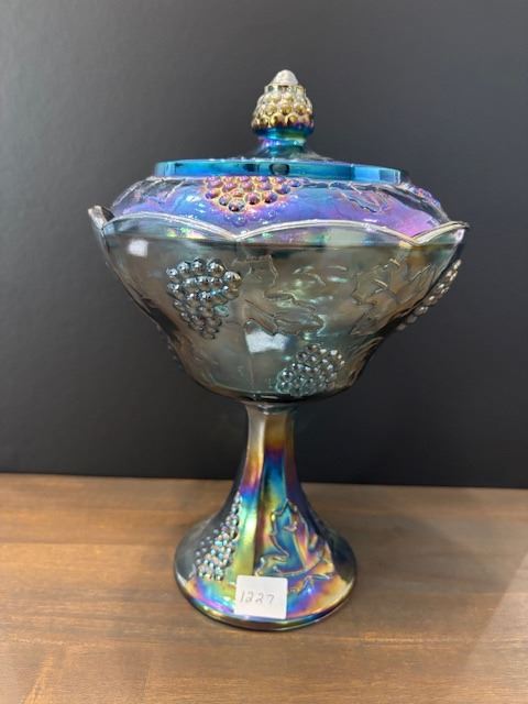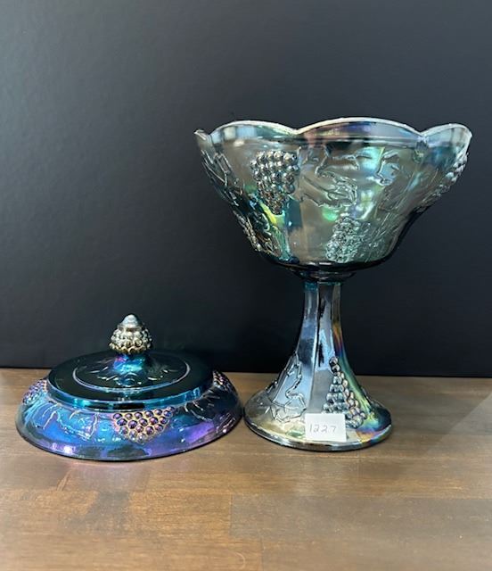 Blue Carnival Glass “Harvest Grape” Pedestal Compote Bowl with Lid
