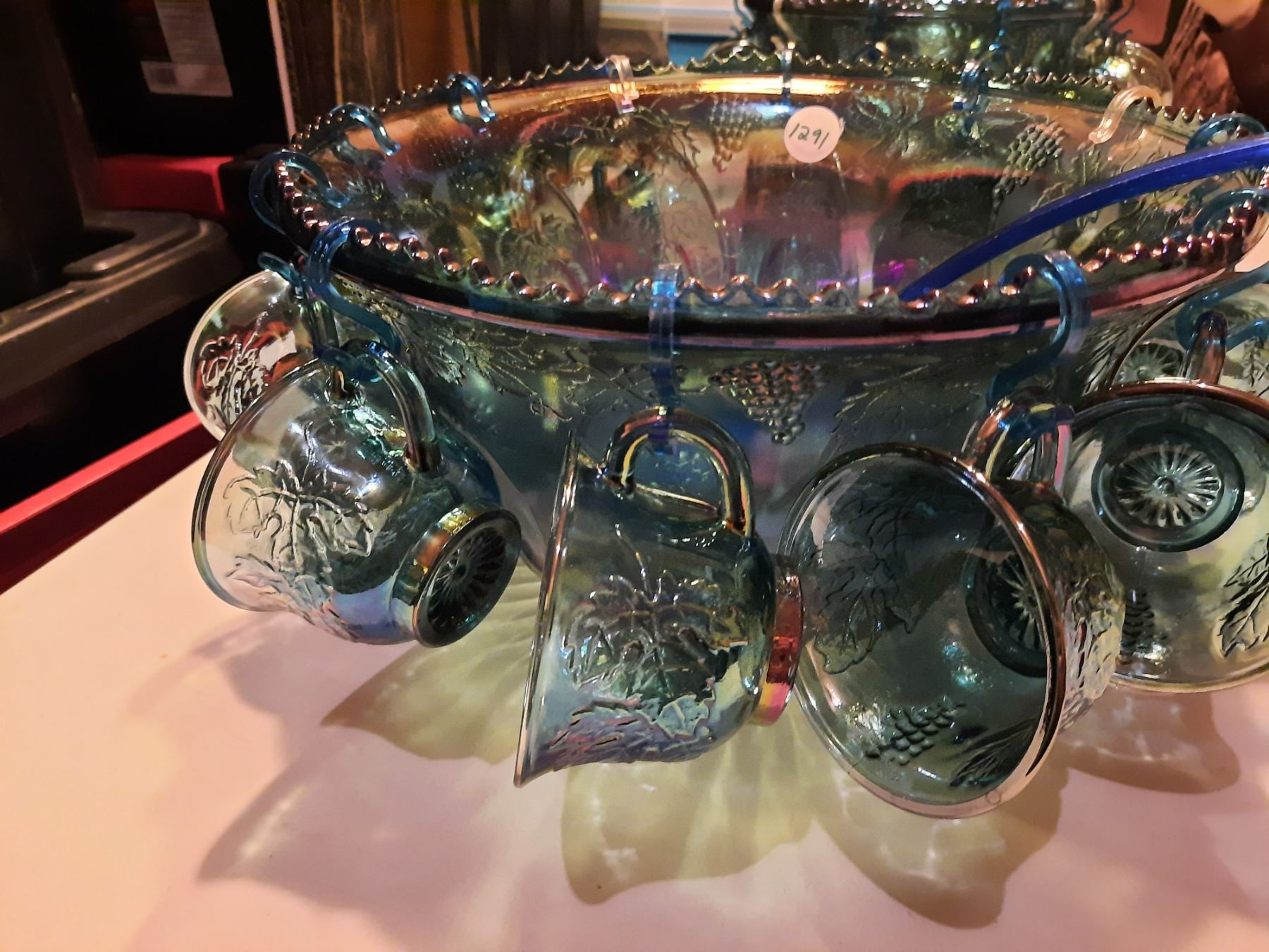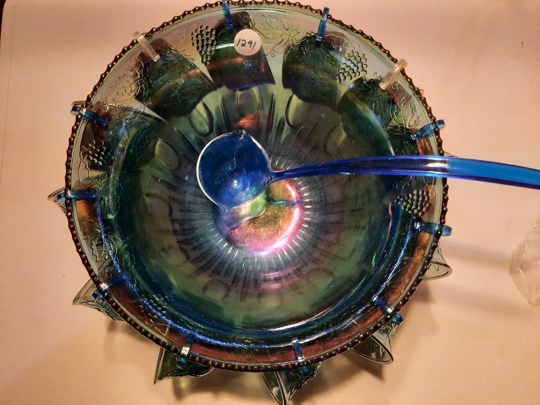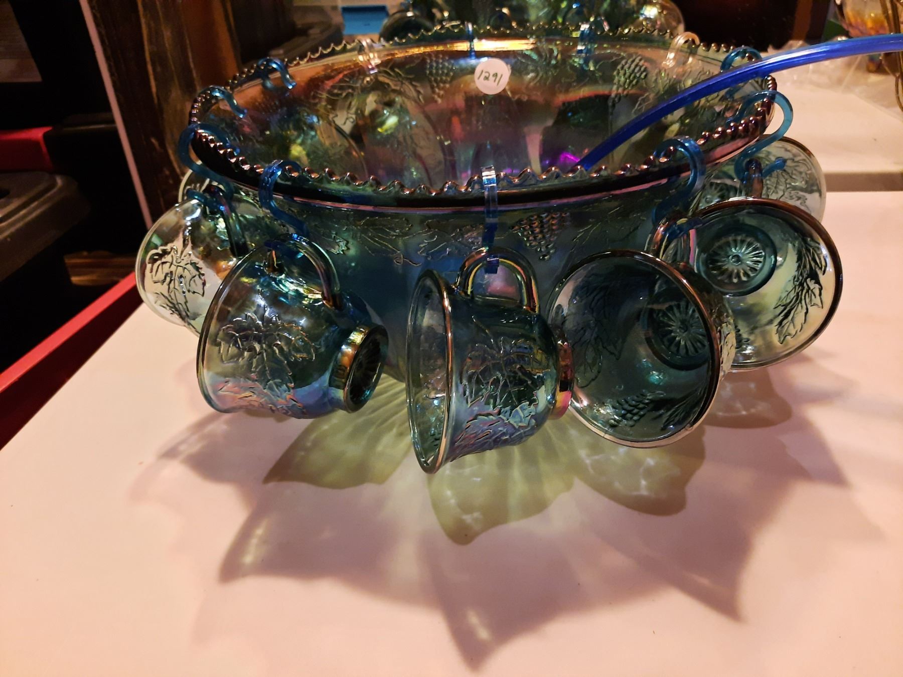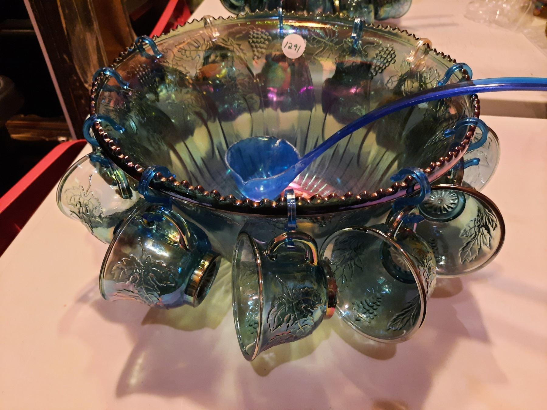 Blue Carnival Glass Punch Bowl with 12 Cups, Hooks, Ladle