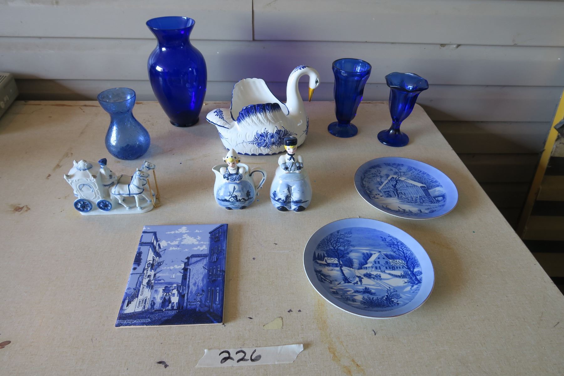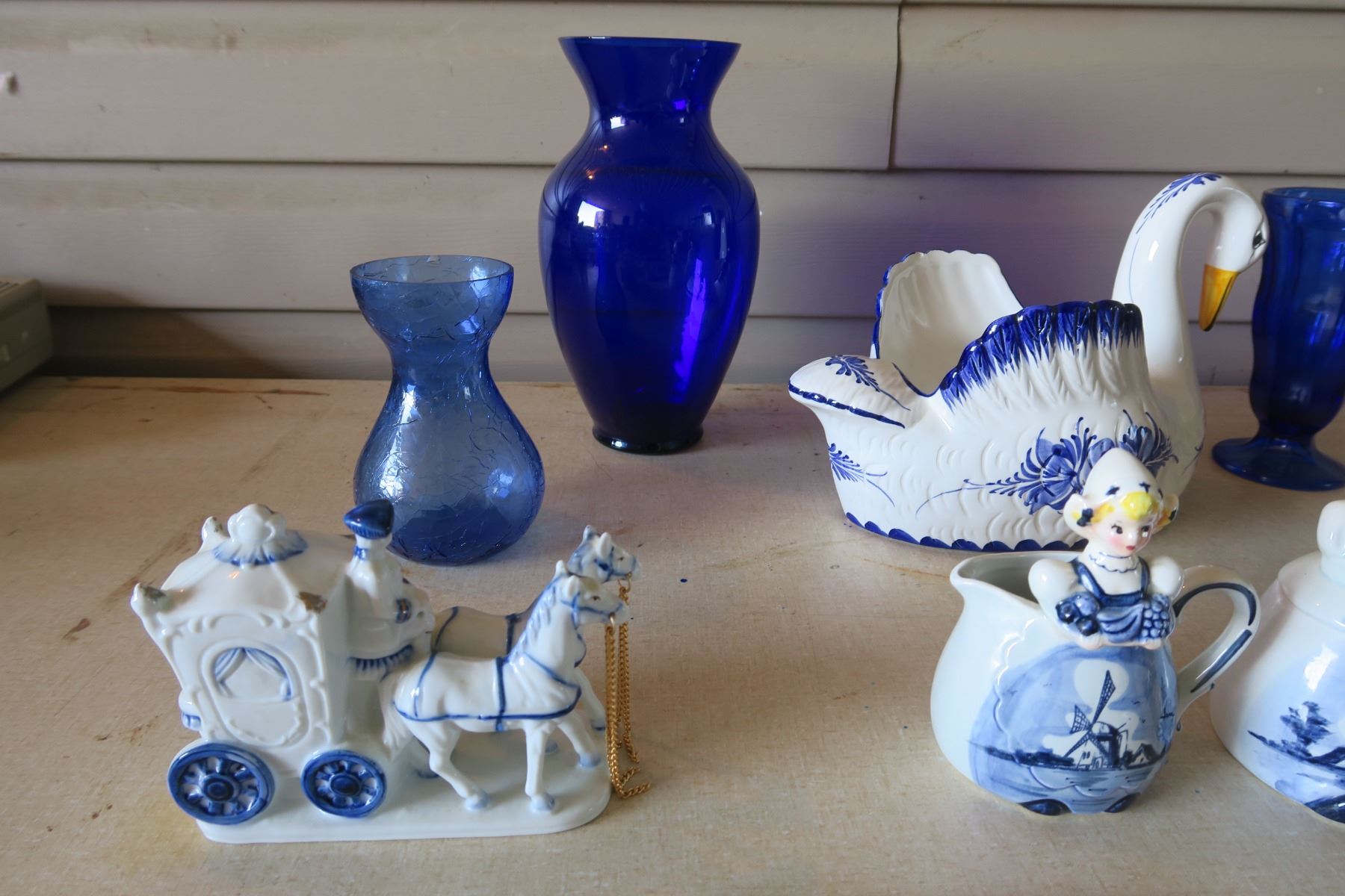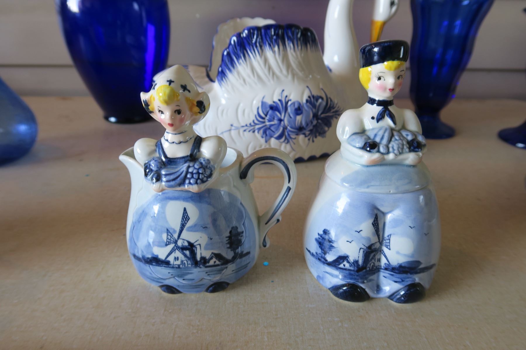 Blue Decorative Glass/Porcelain Items - Swan Bowl Vase X2, Plate X2, Tile X1, Cups X2, Milk/Sugar Containers and Statuette