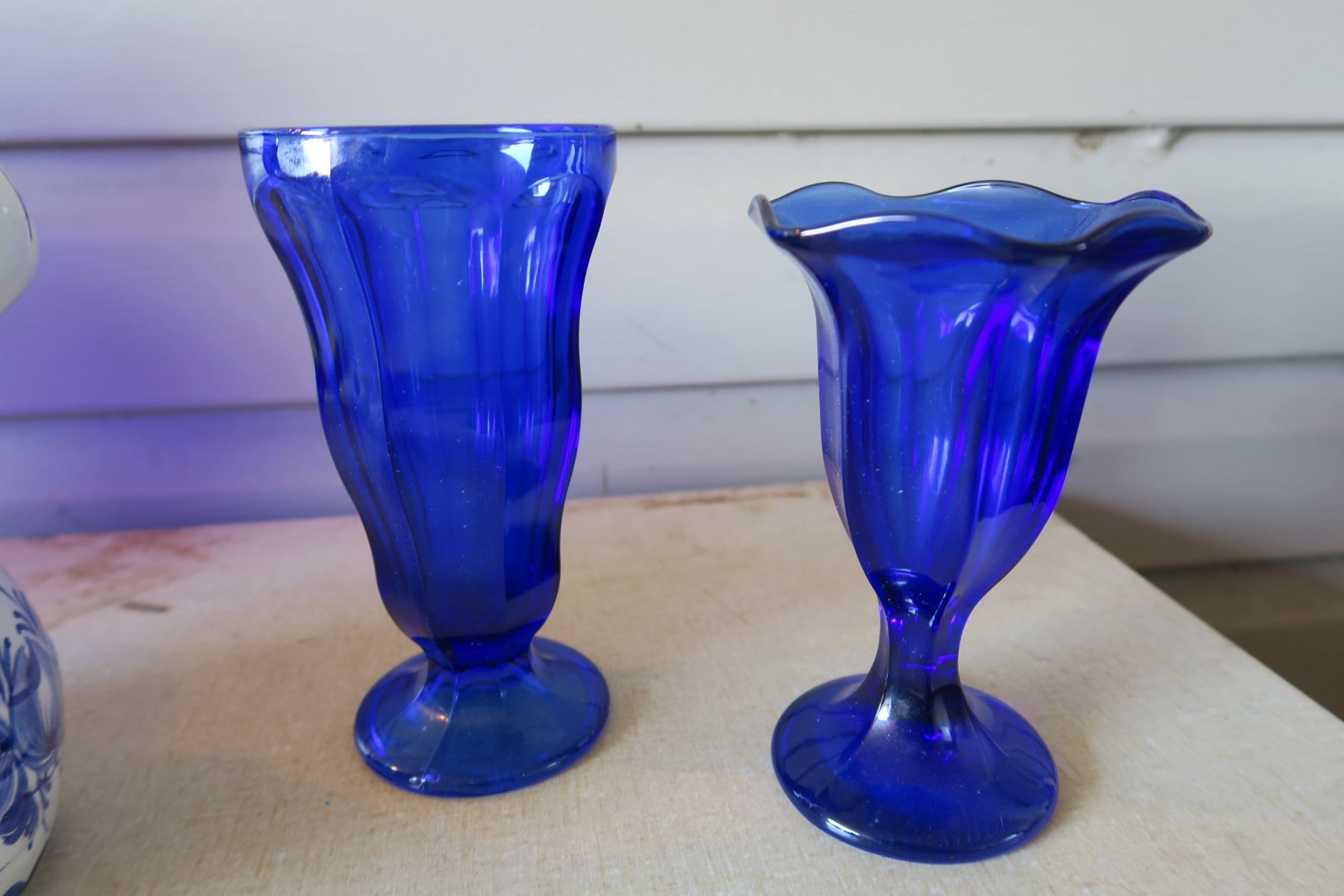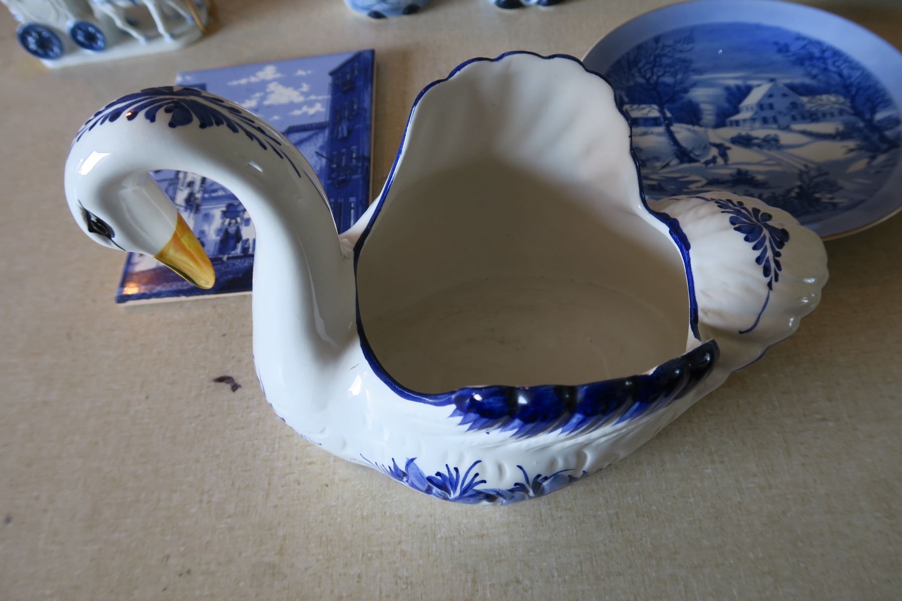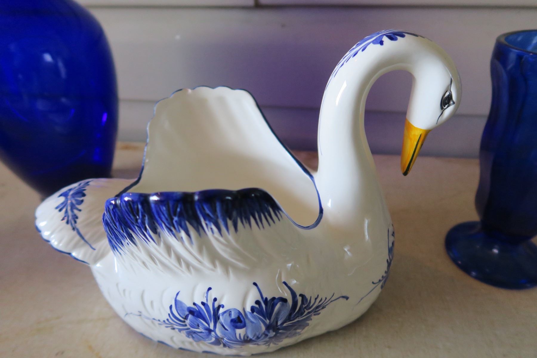 Blue Decorative Glass/Porcelain Items - Swan Bowl Vase X2, Plate X2, Tile X1, Cups X2, Milk/Sugar Co