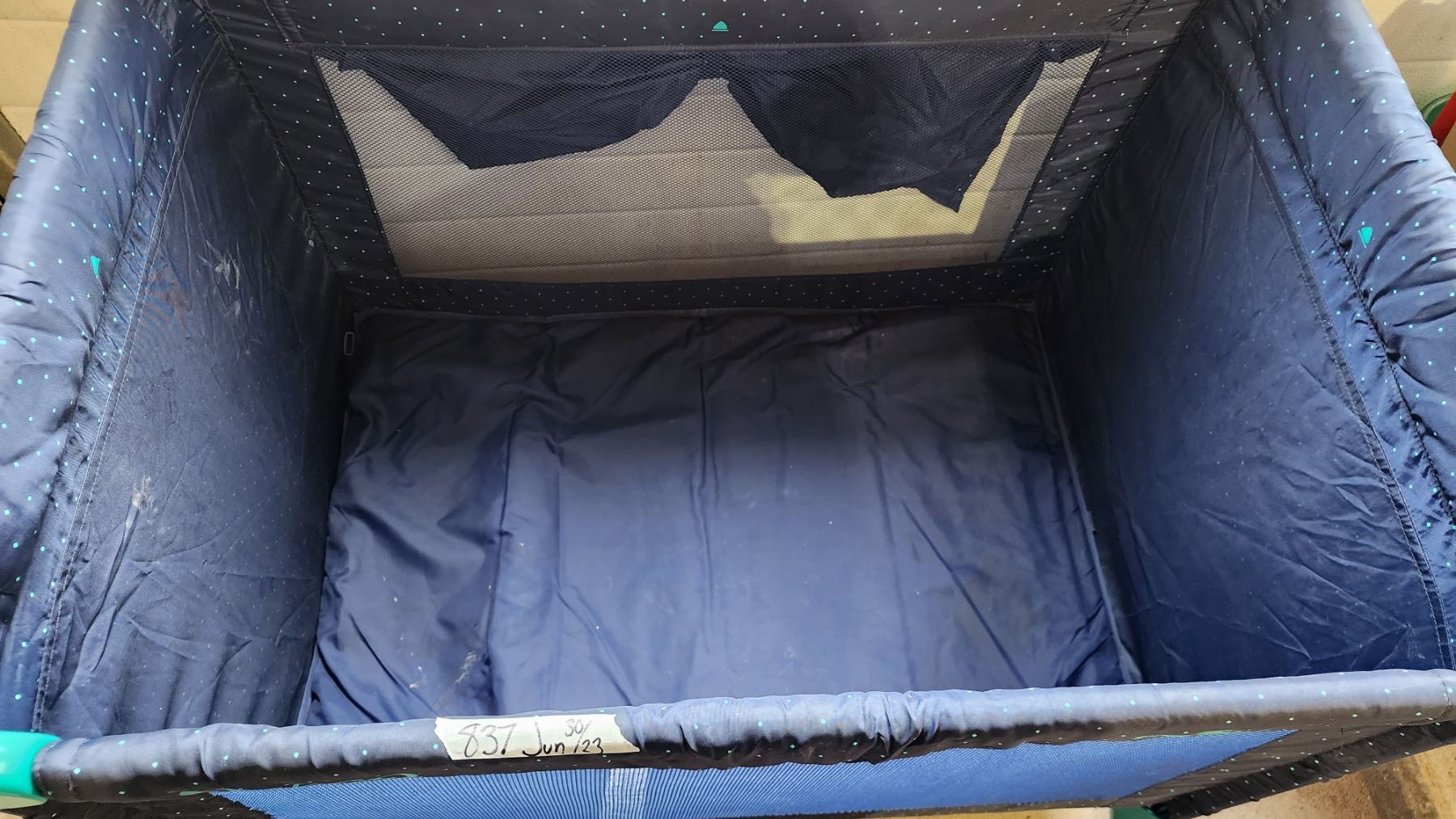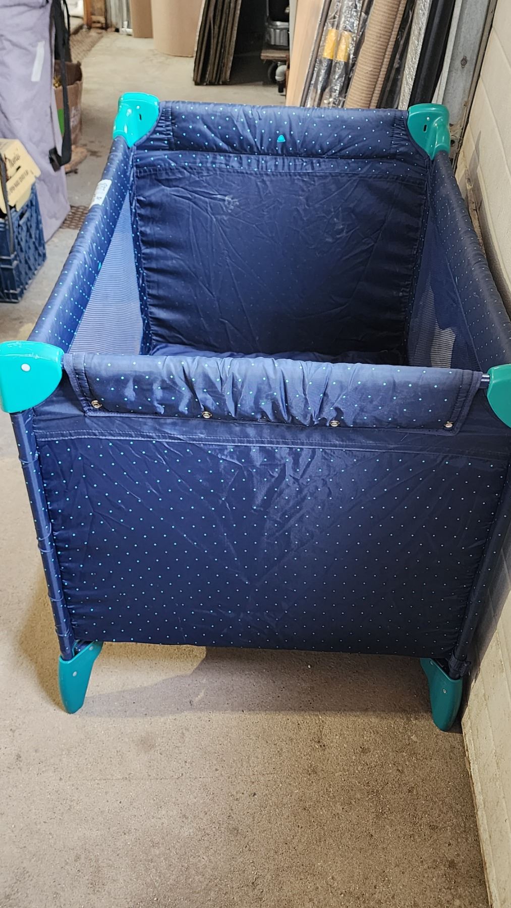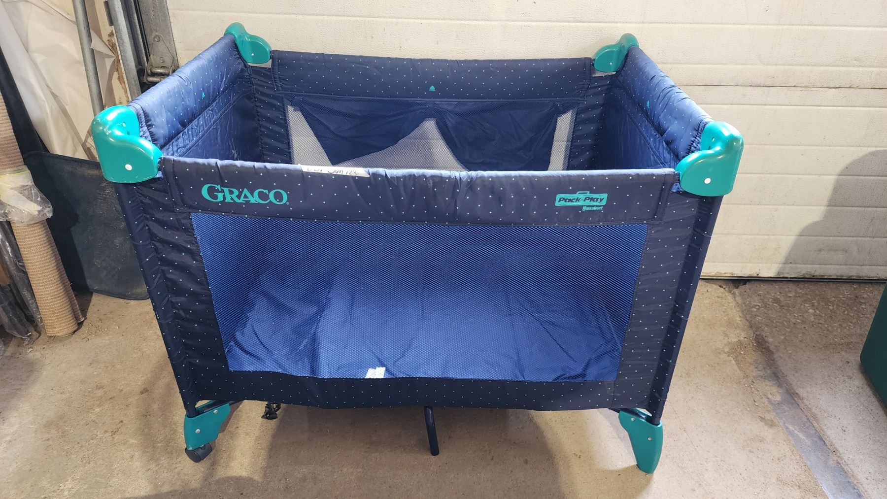 Blue "Graco" play pen and Baby playmat - pen is 39.5"Wx28"Dx30.5"H