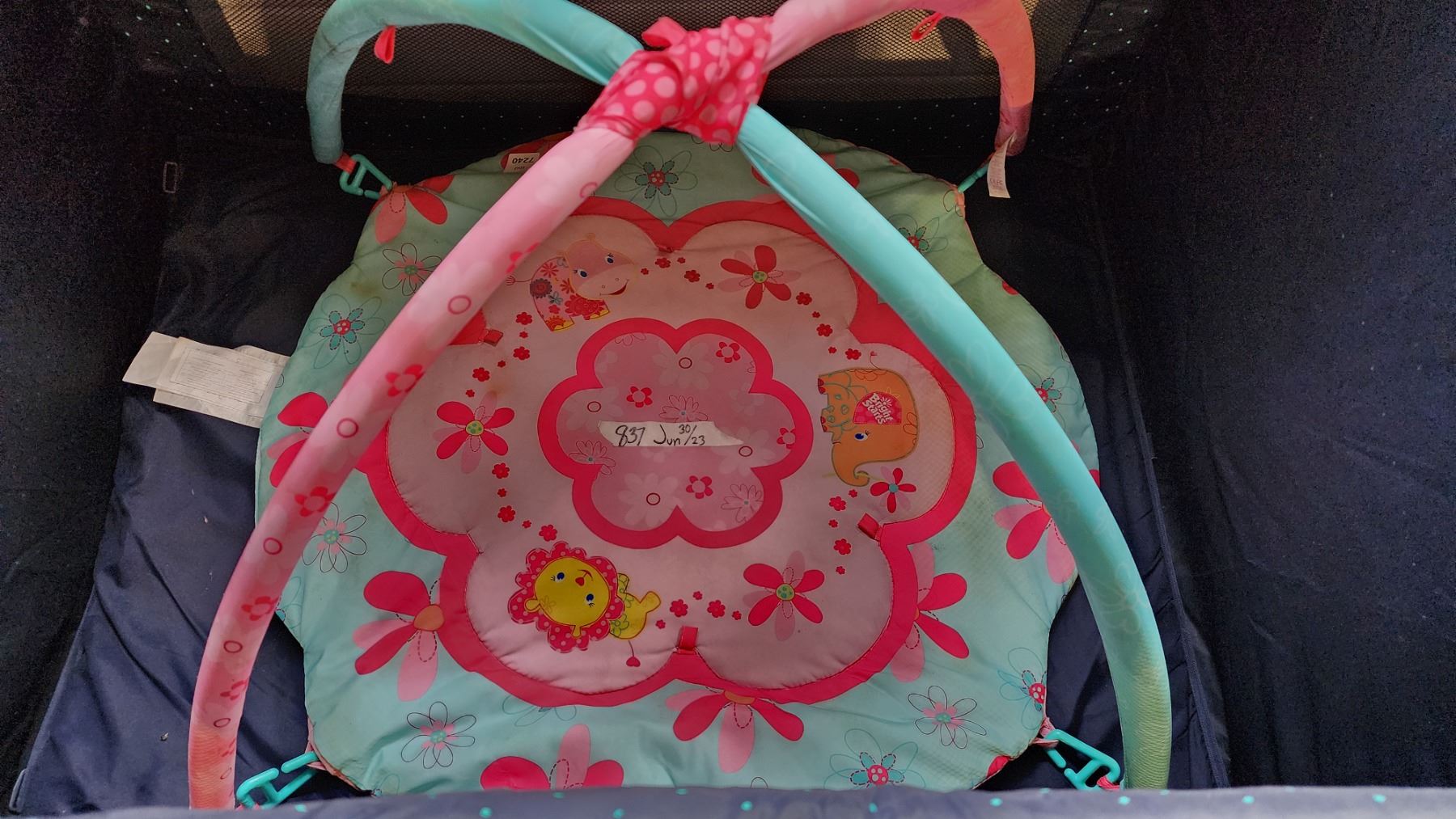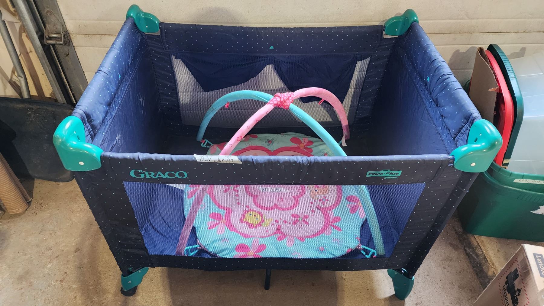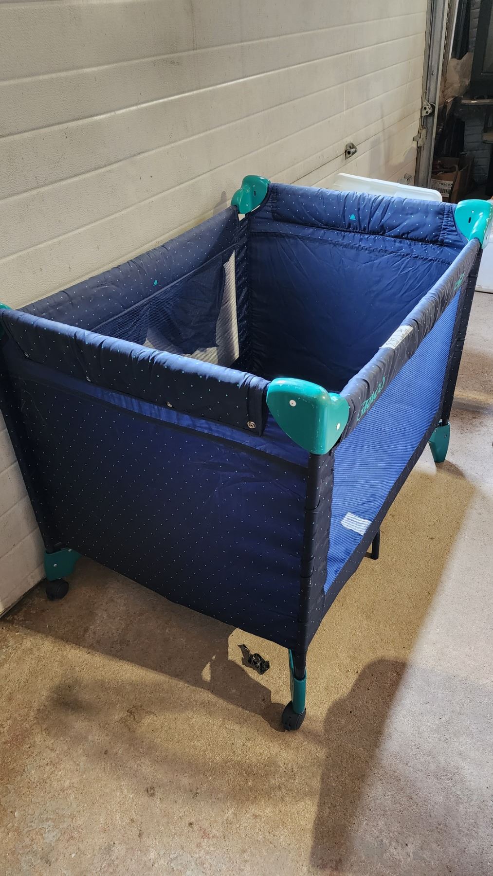 Blue "Graco" play pen and Baby playmat - pen is 39.5"Wx28"Dx30.5"H