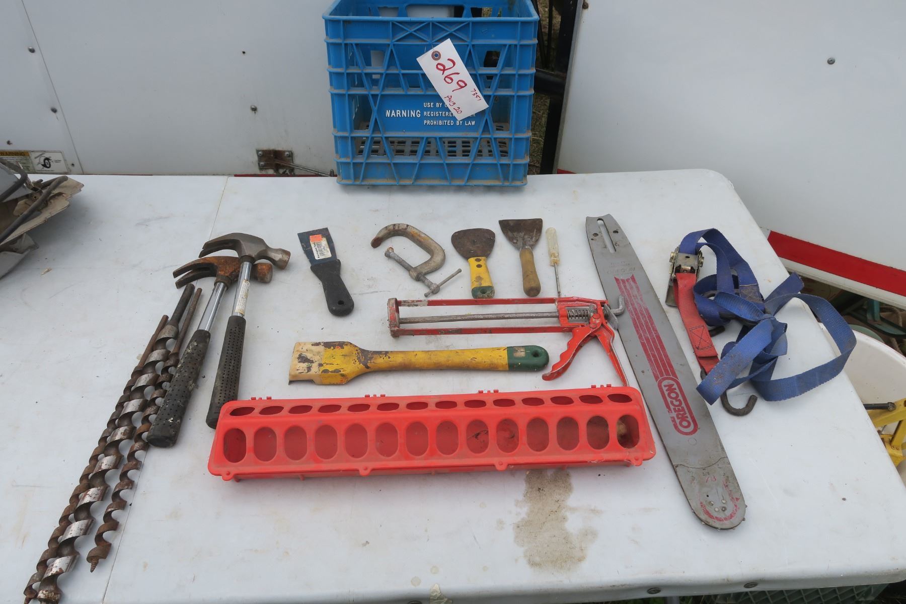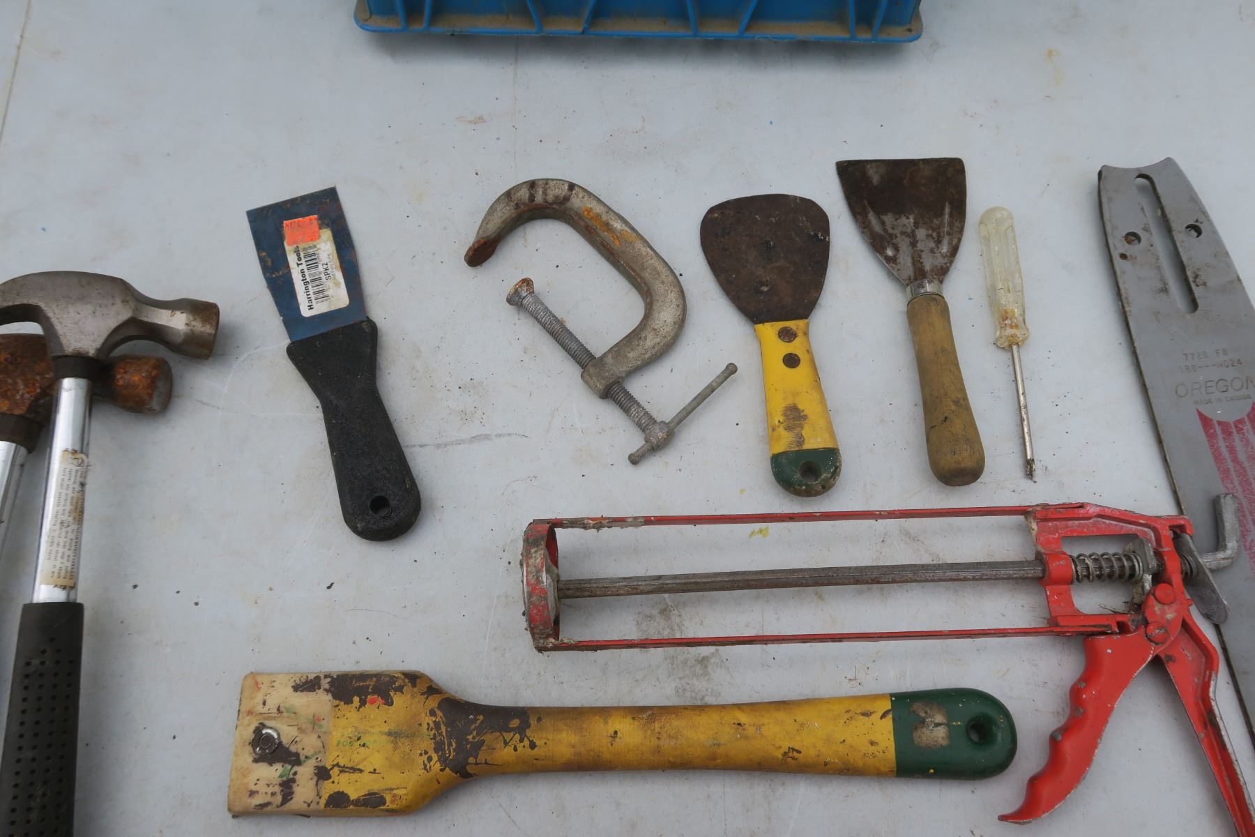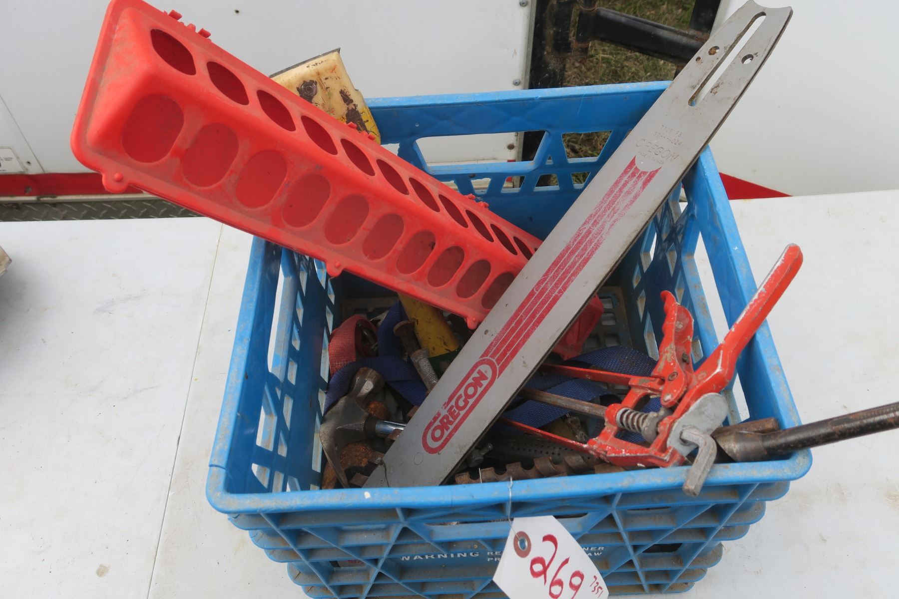 Blue crate of misc tools, hammers, scrapers, chainsaw part,ect.