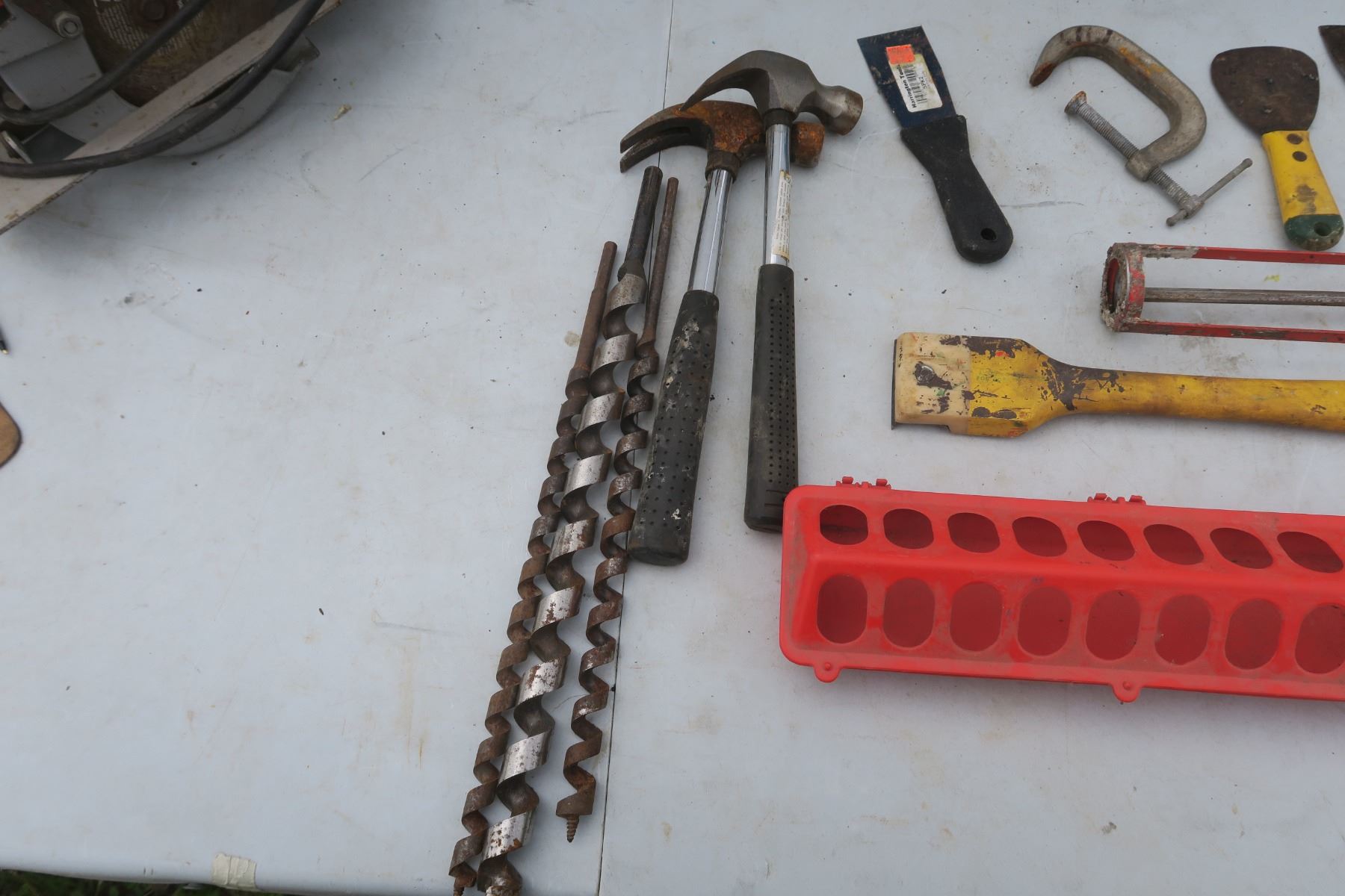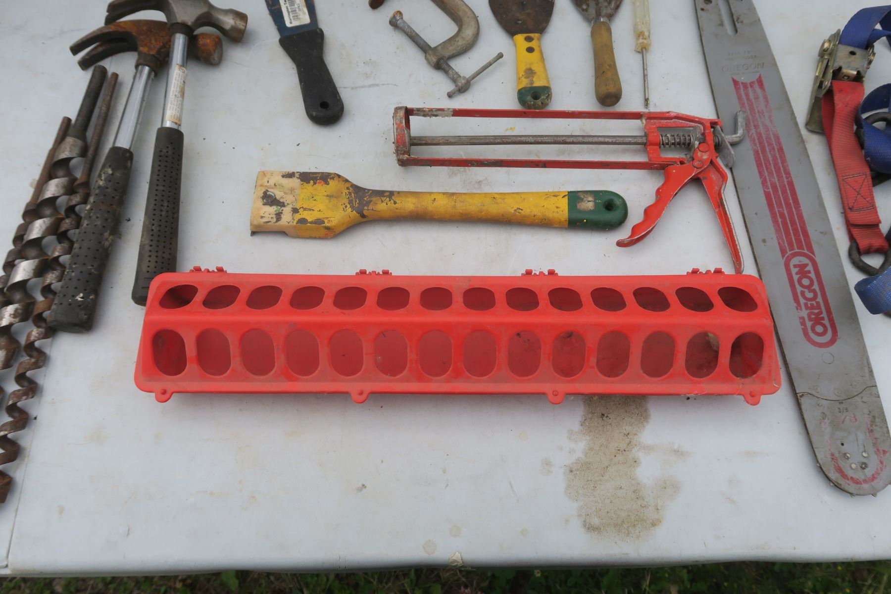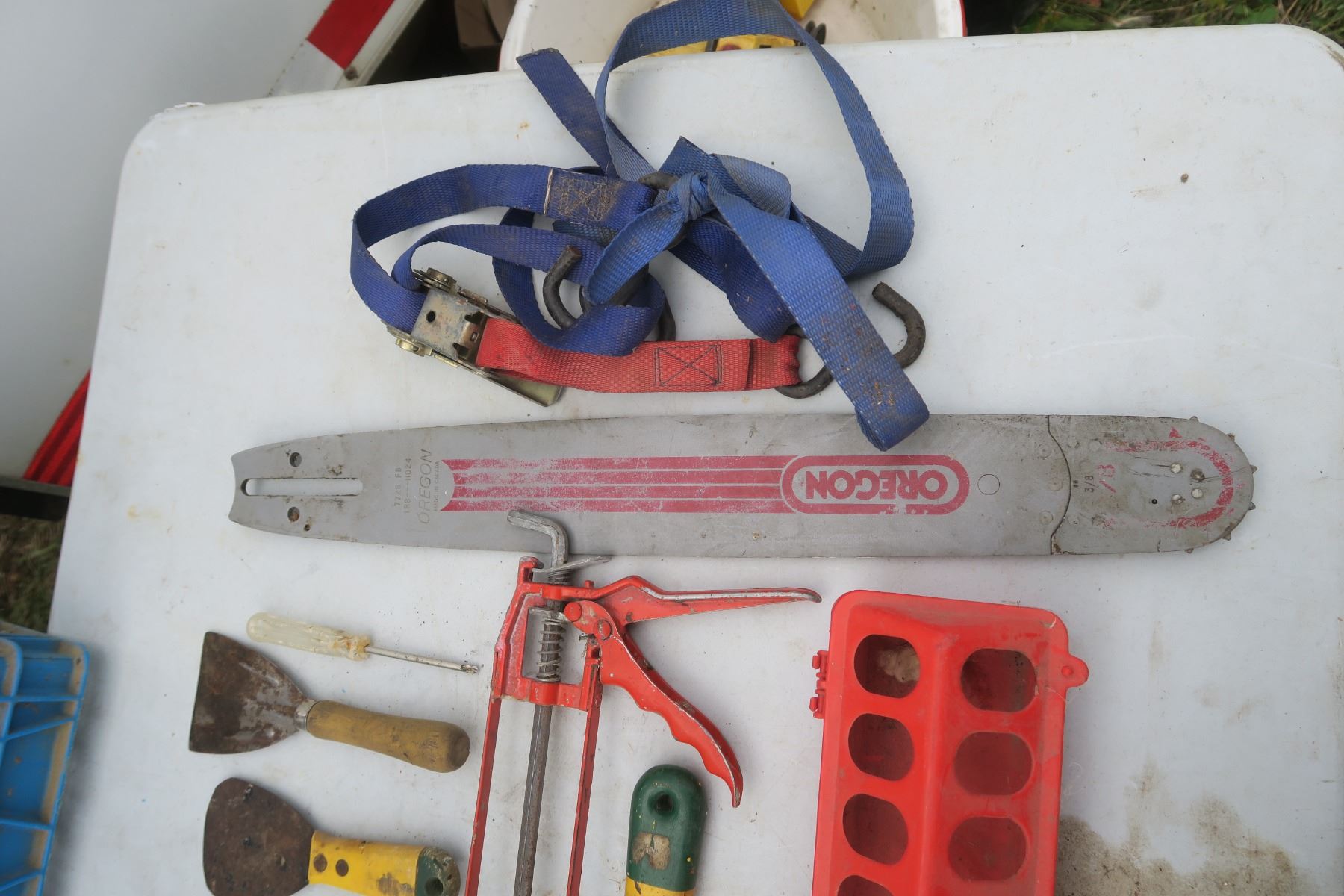 Blue crate of misc tools, hammers, scrapers, chainsaw part,ect.